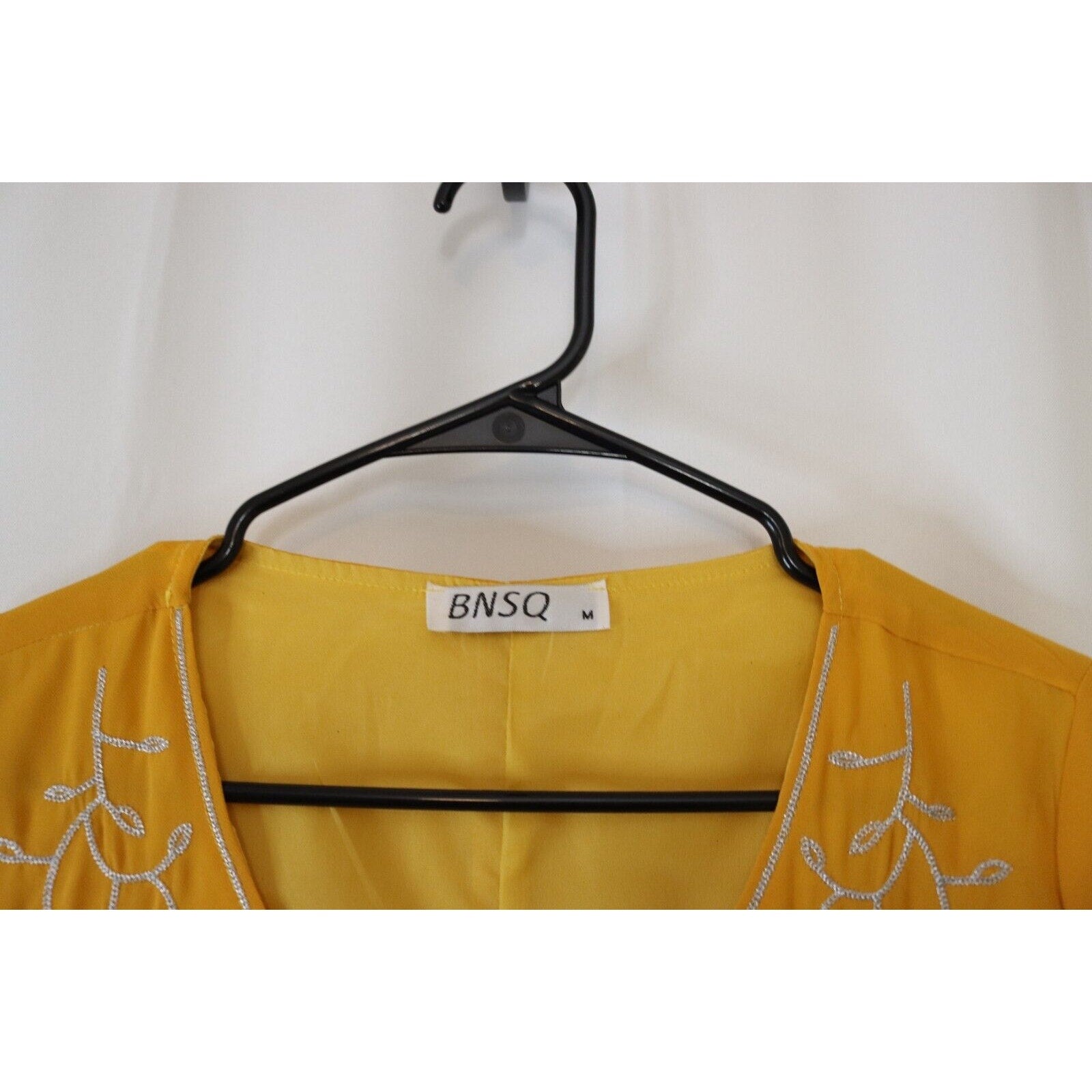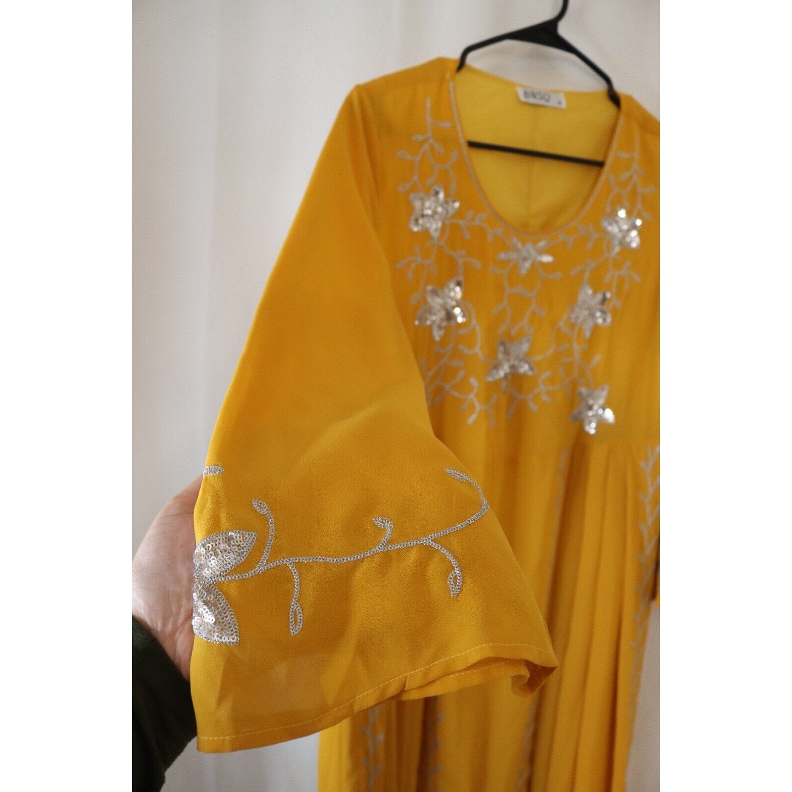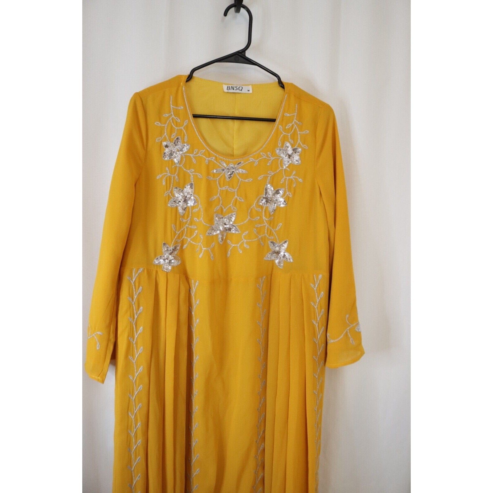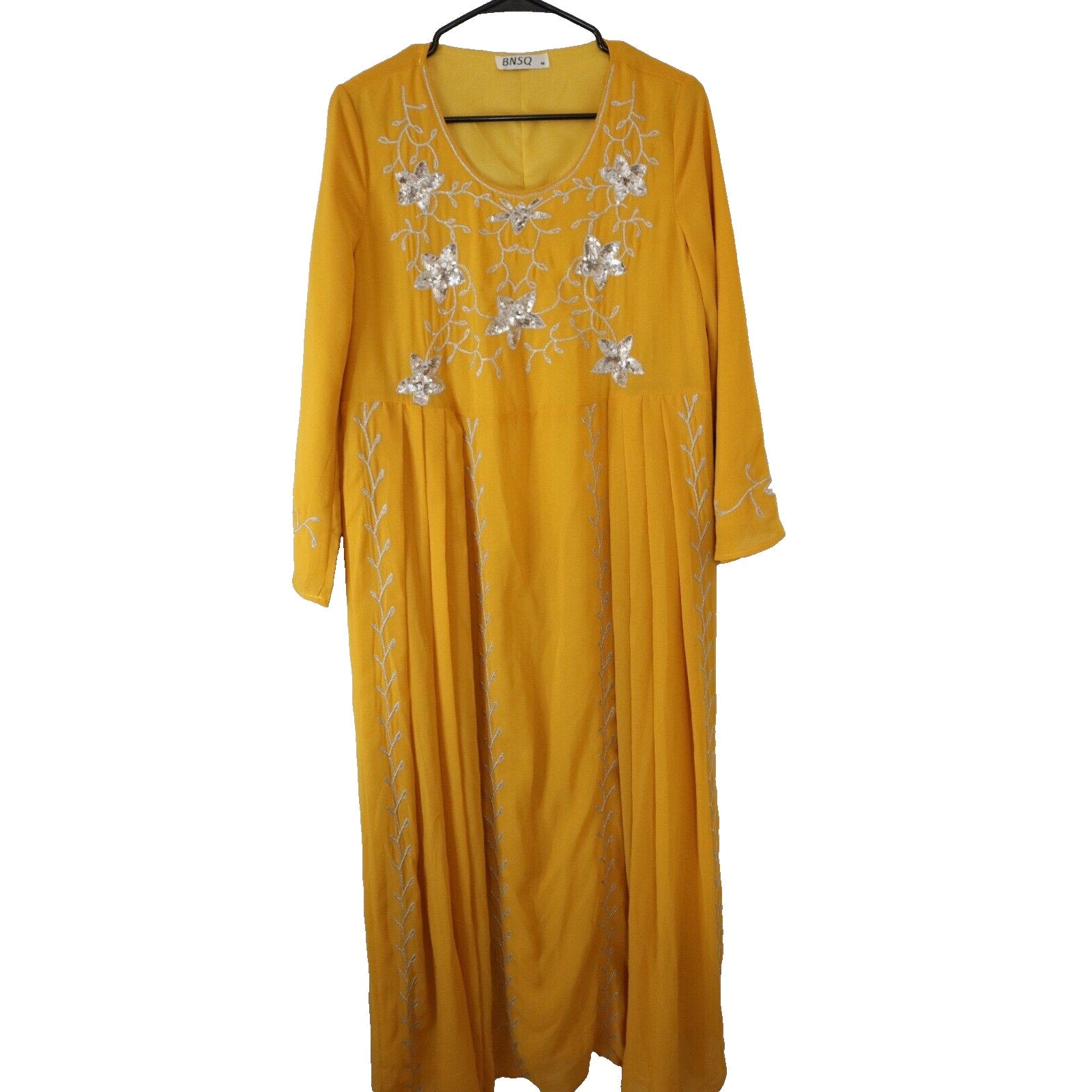 Beautiful Yellow BNSQ Abaya, a stunning maxi dress perfect for any special occasion. This abaya features long sleeves and a full lining for comfort and modesty. The vibrant yellow color is sure to turn heads. Measuring 56" in length, it offers elegant coverage.