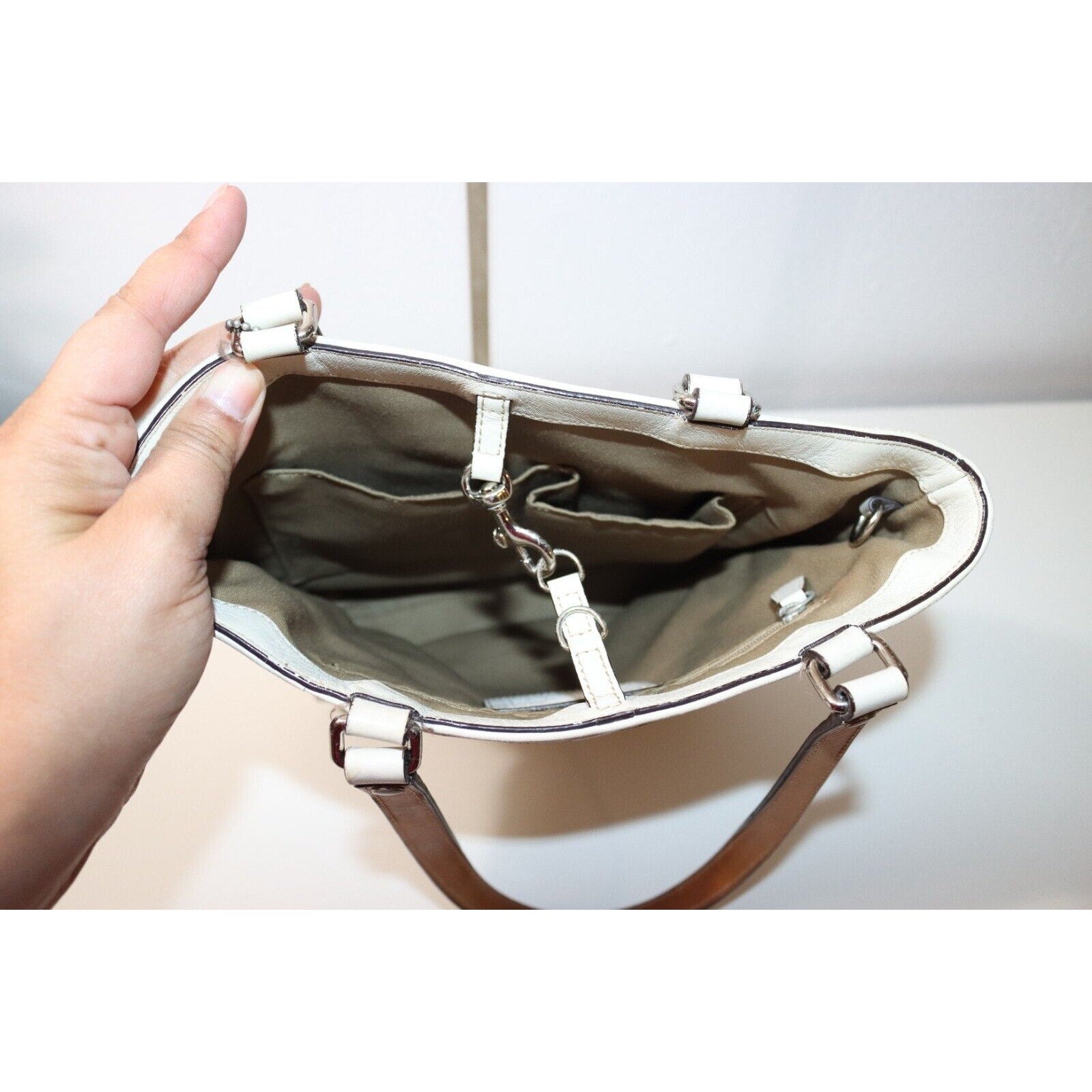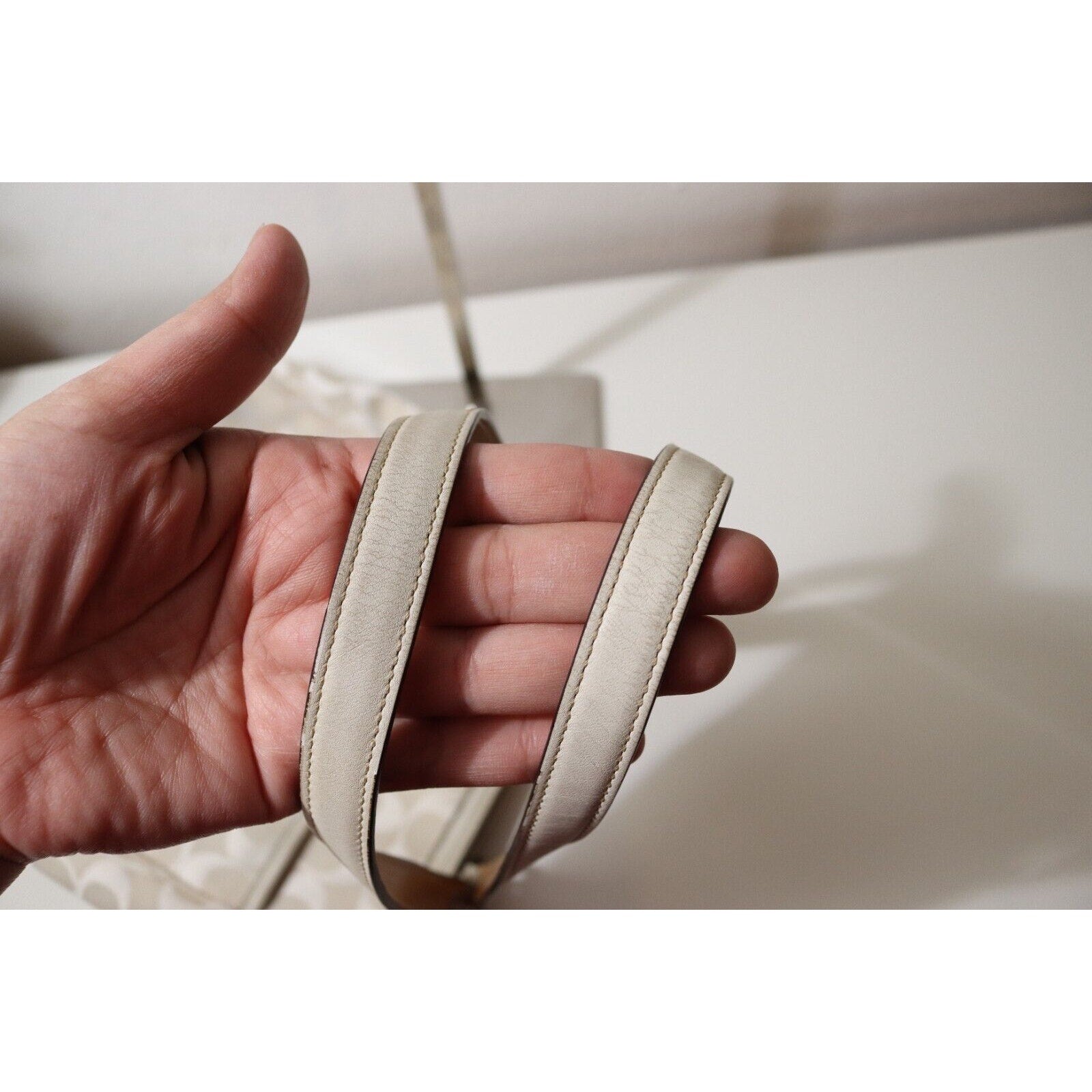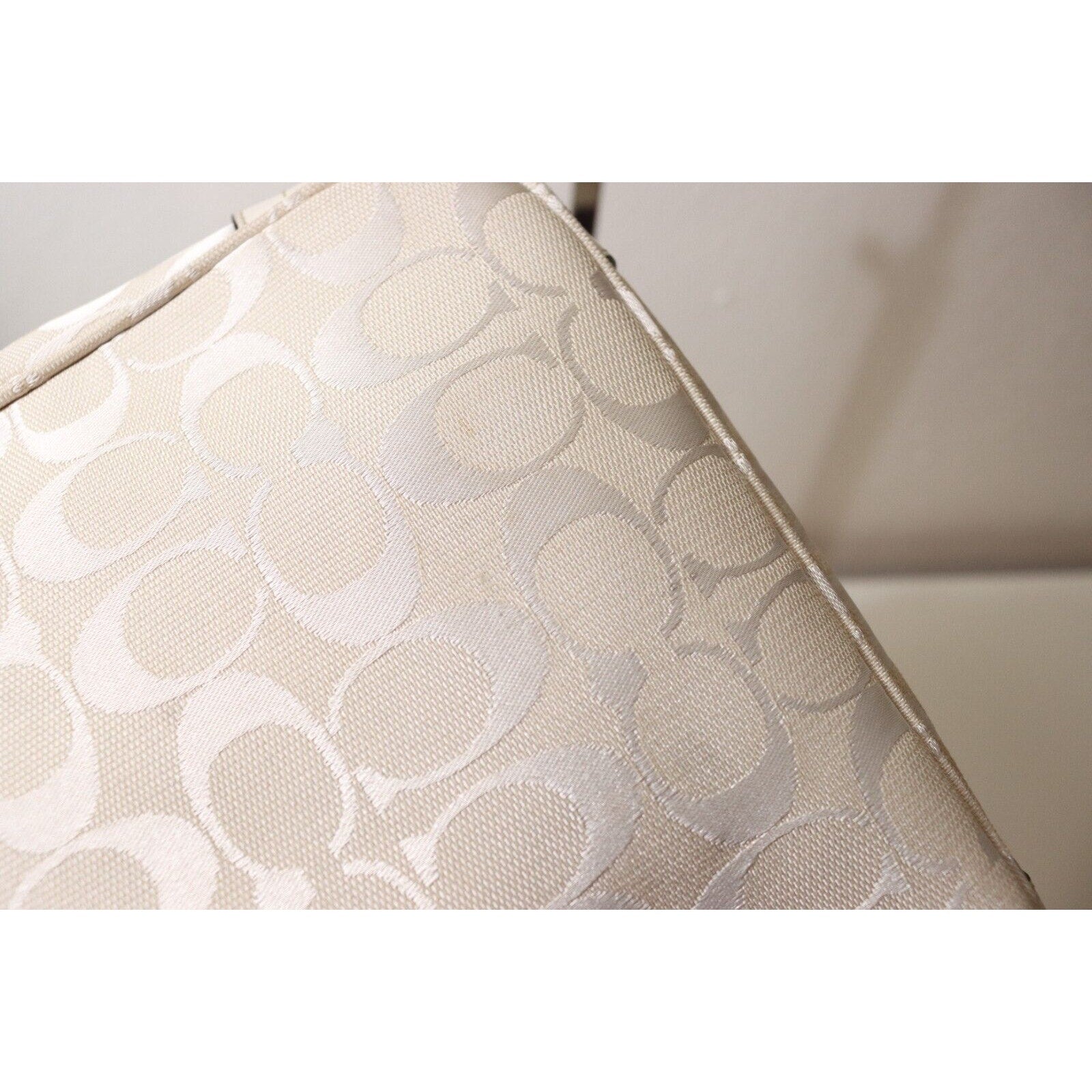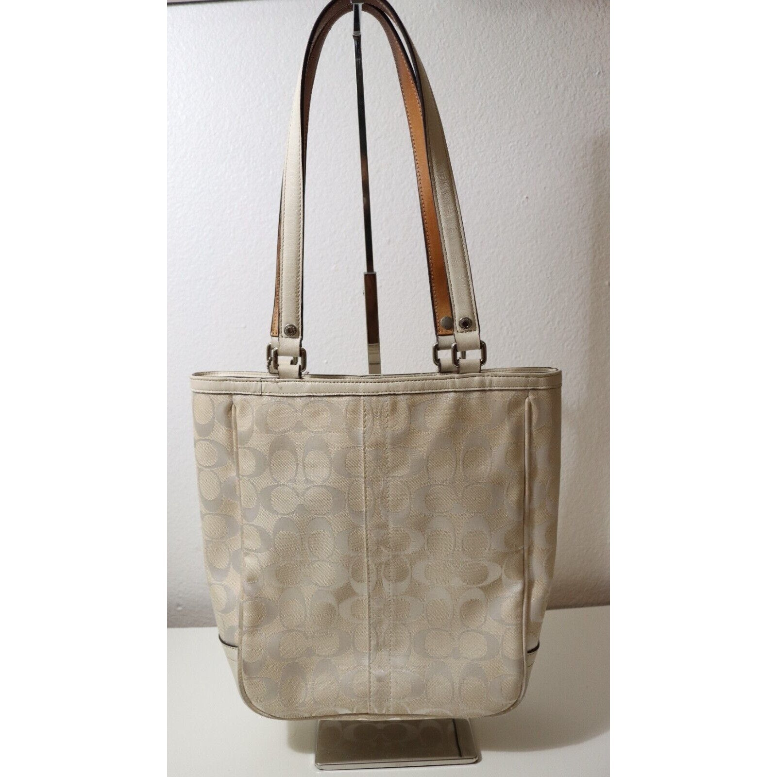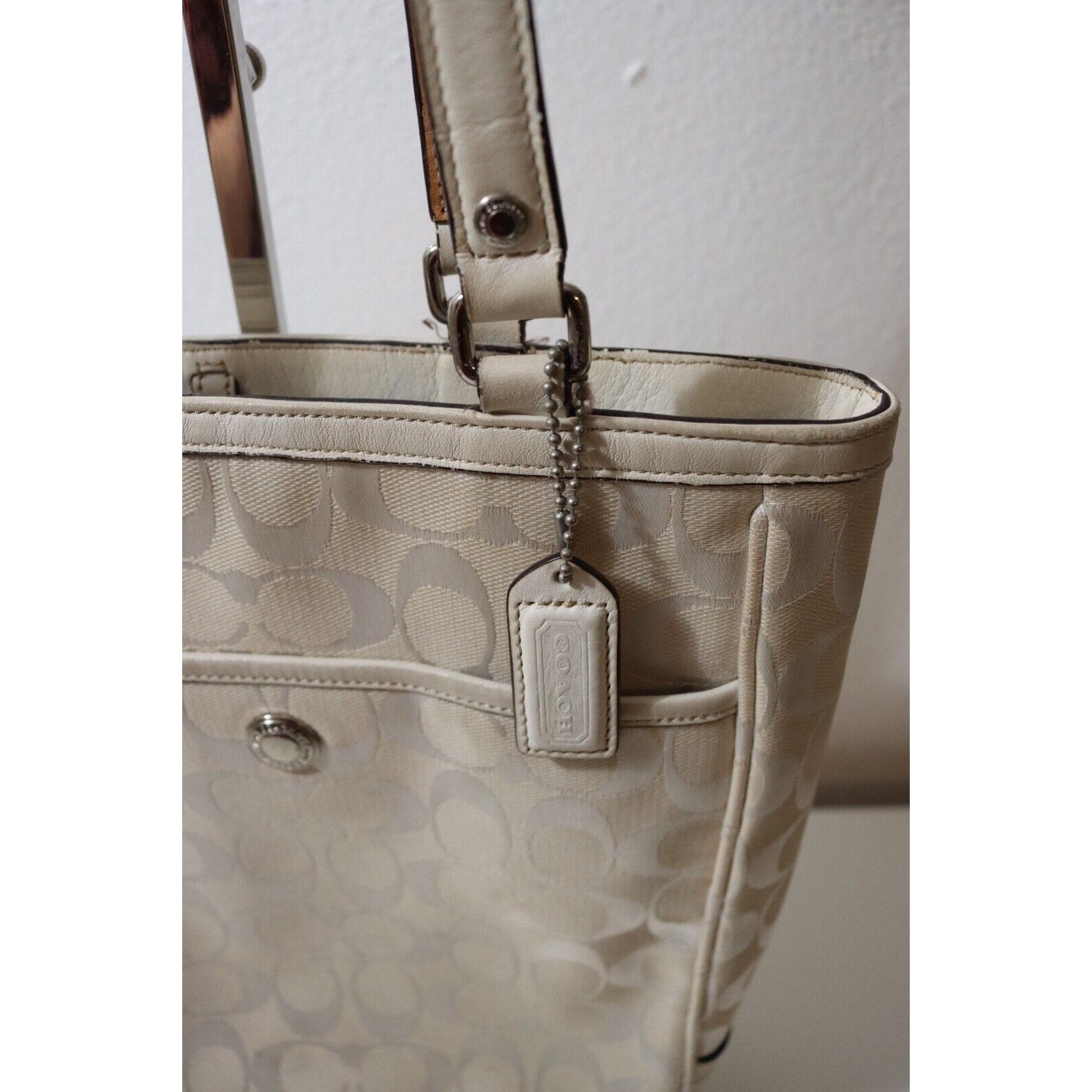 This Coach Signature Lunch Tote is the perfect accessory for any stylish woman. With a beautiful cream color and ivory handle, this medium-sized tote bag is made of high-quality jacquard leather and features a bag charm. The double handles make it easy to carry, and the silver hardware adds a touch of elegance. The tote bag has a fabric lining and includes inner pockets for added organization. It is perfect for carrying your lunch to work or for everyday use. The model number is 1464, and the exterior is made of jacquard and leather. This tote bag is a must-have for any Coach fan and is sure to complement any outfit.