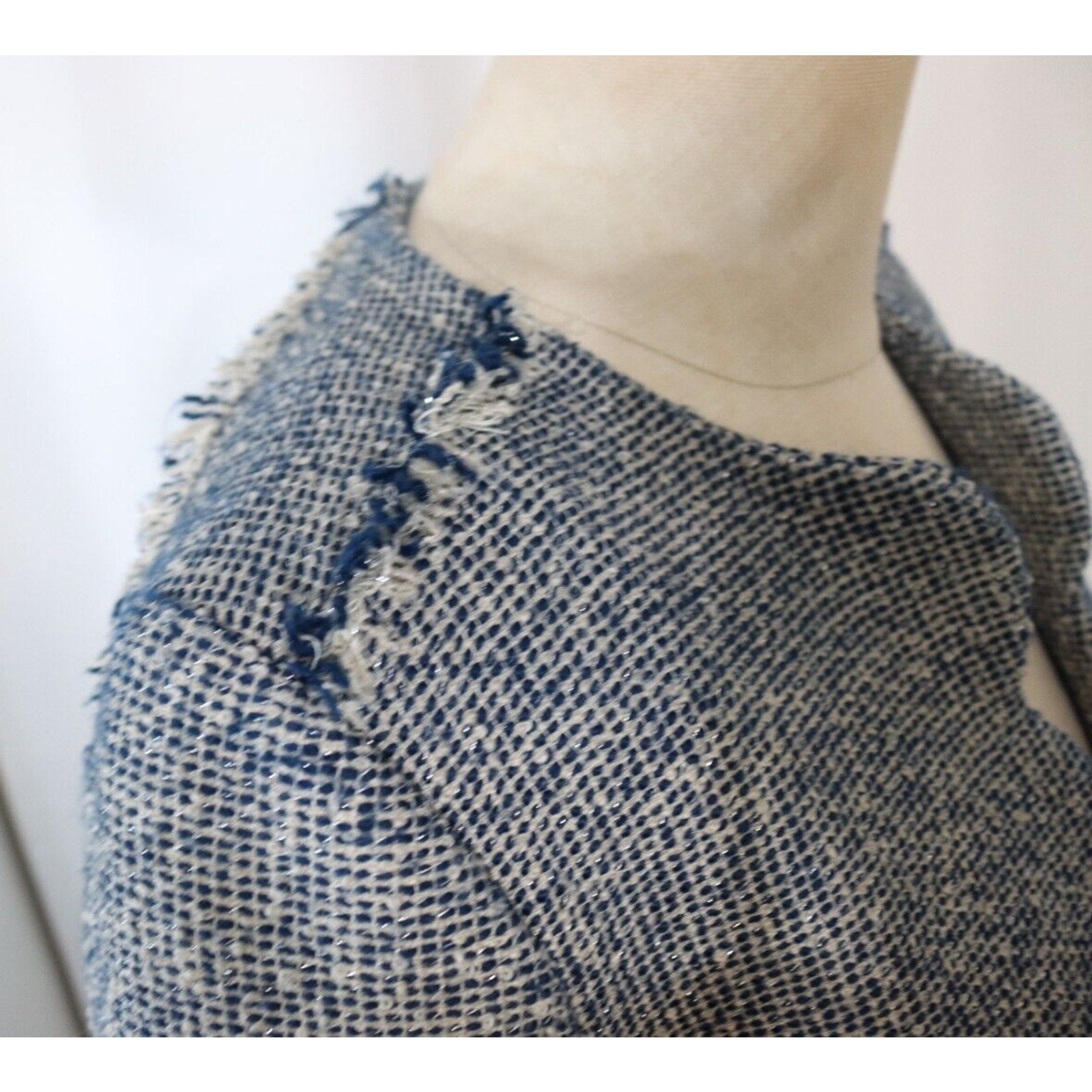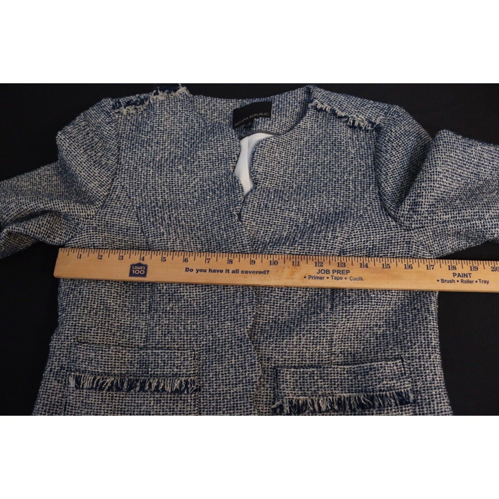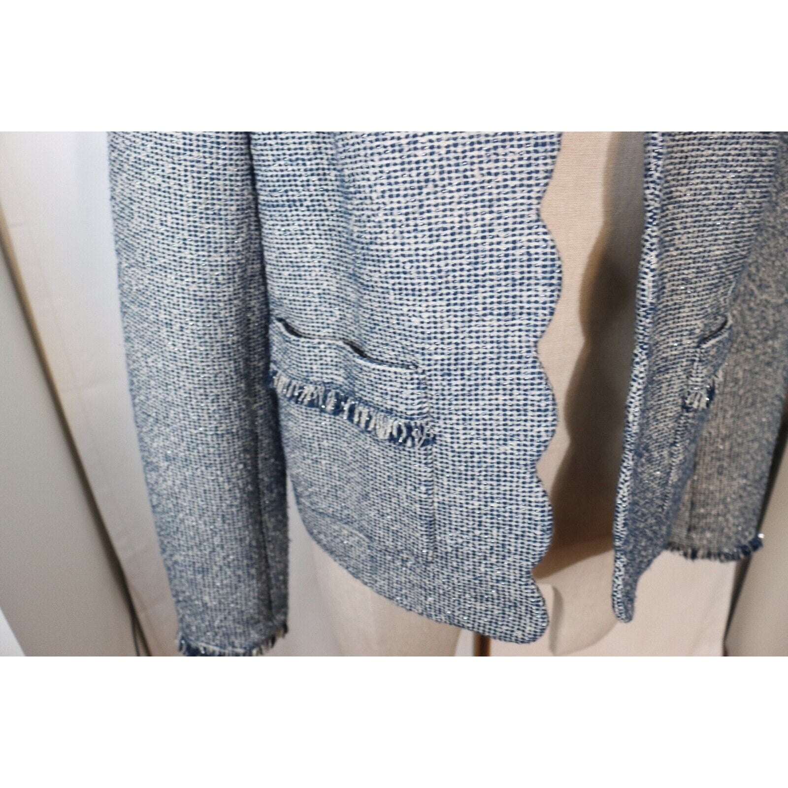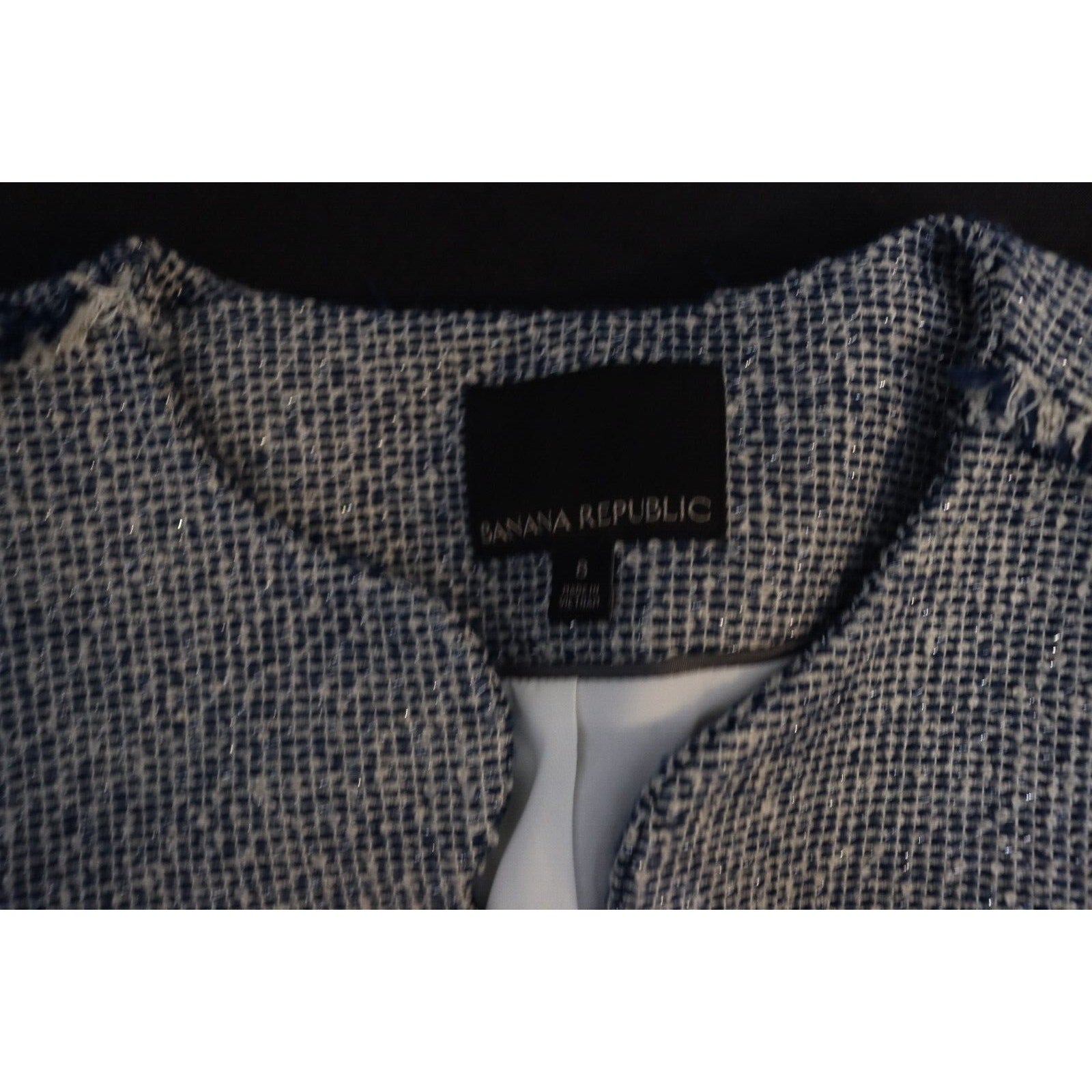 Add a pop of color to your wardrobe with this Banana Republic Tweed Blazer in Blue. This blazer is perfect for any occasion, whether it's casual, workwear, or business. The jacket/coat length is short and the fabric type is tweed, giving it a classic and timeless look. The blazer is made of a blend of polyester, cotton, and arcylic materials, while the lining is made of polyester. The blazer also features fringe accents, adding a touch of fun and flair to the overall design. This blazer is a size 8 and is suitable for regular size types. It is perfect for the fall, winter, and spring seasons.