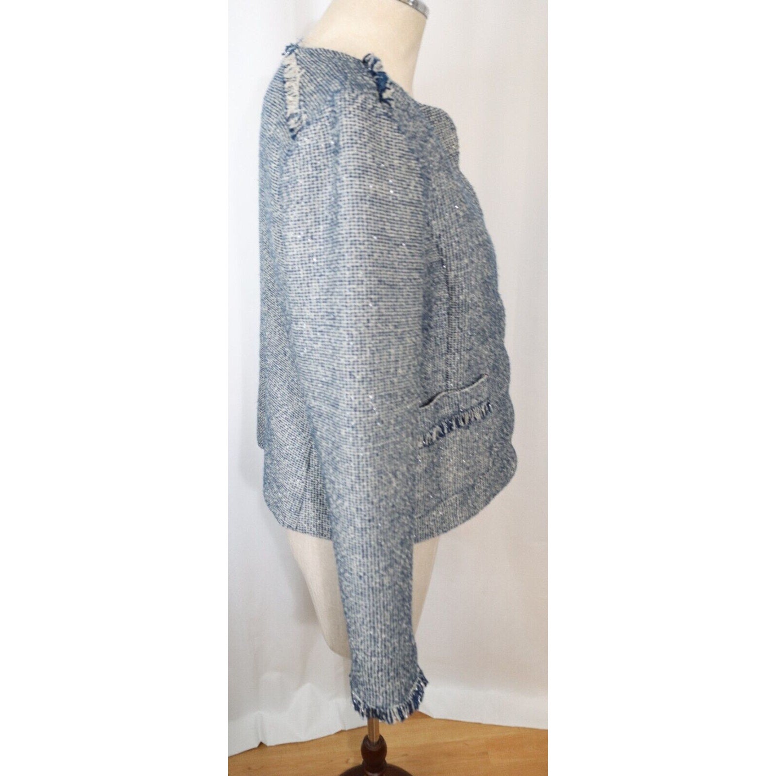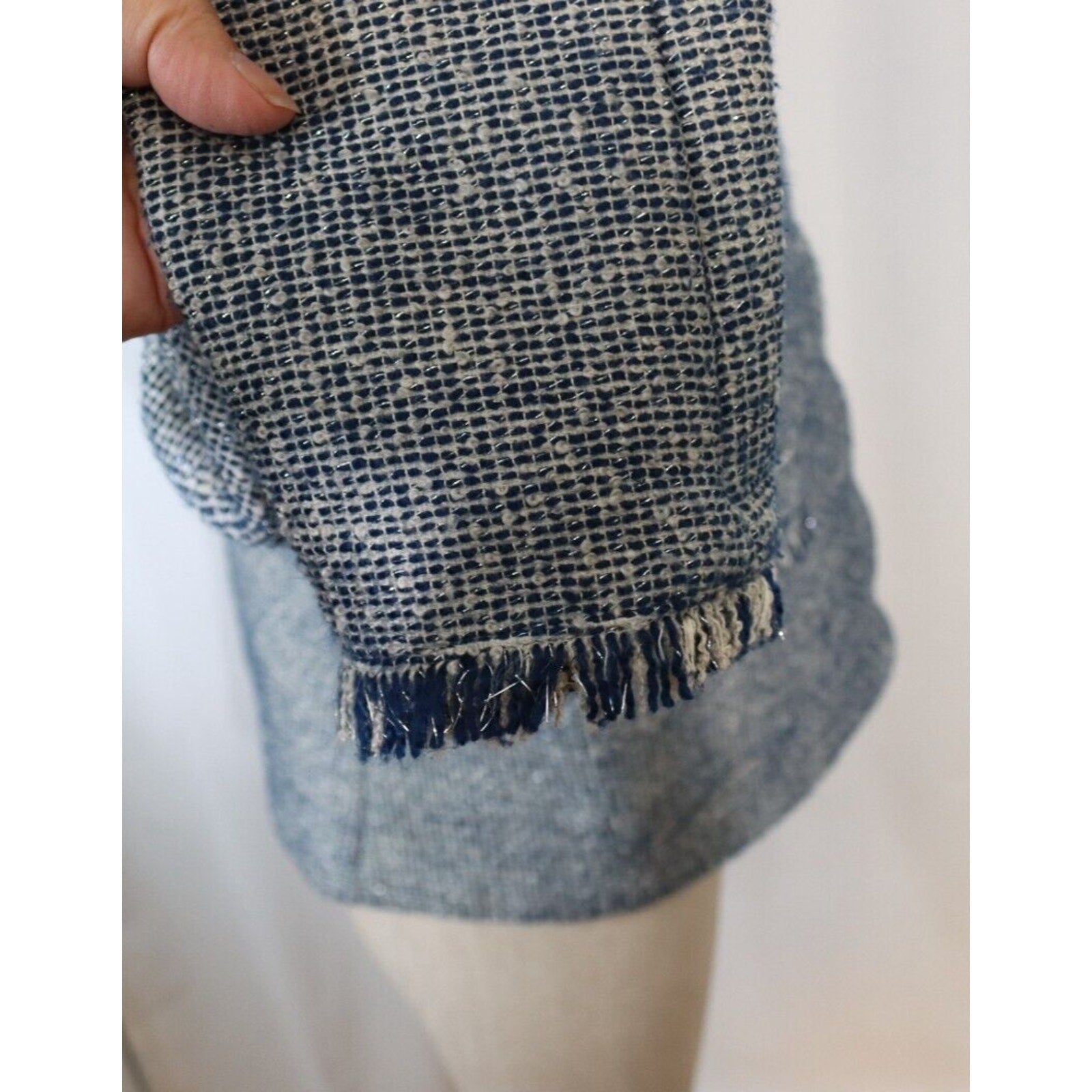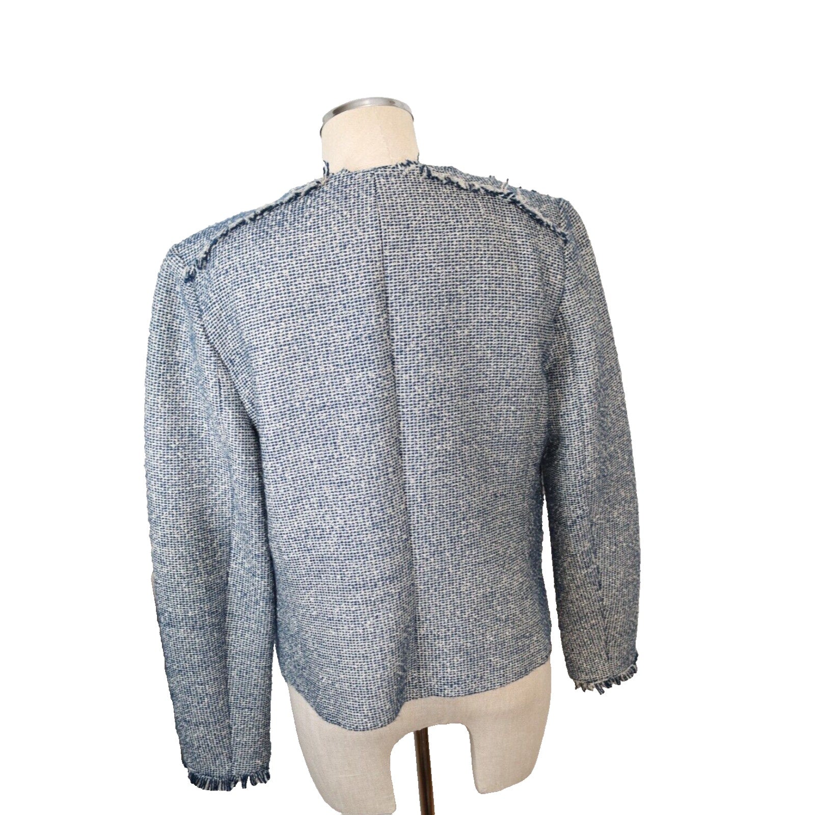 Add a pop of color to your wardrobe with this Banana Republic Tweed Blazer in Blue. This blazer is perfect for any occasion, whether it's casual, workwear, or business. The jacket/coat length is short and the fabric type is tweed, giving it a classic and timeless look. The blazer is made of a blend of polyester, cotton, and arcylic materials, while the lining is made of polyester. The blazer also features fringe accents, adding a touch of fun and flair to the overall design. This blazer is a size 8 and is suitable for regular size types. It is perfect for the fall, winter, and spring seasons.