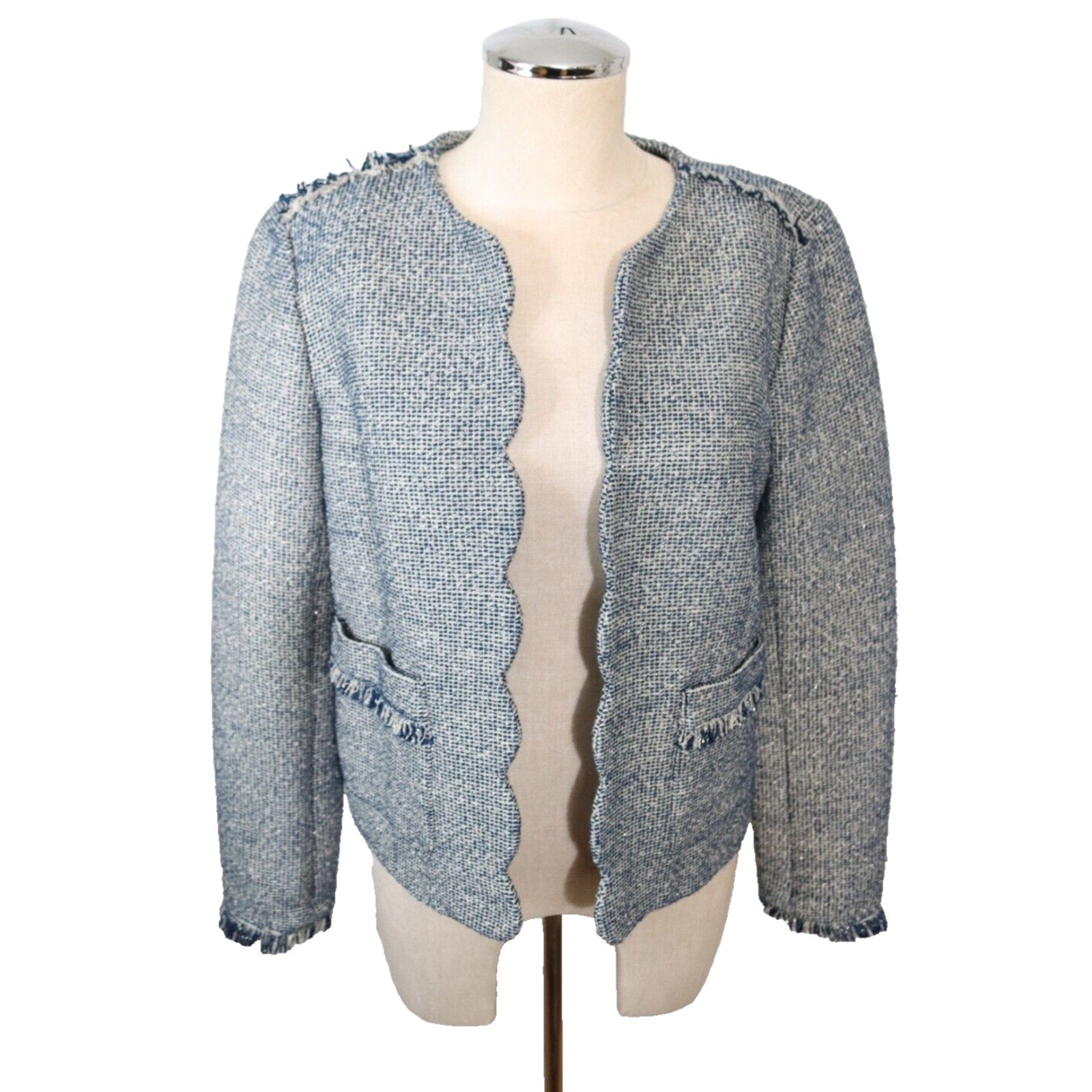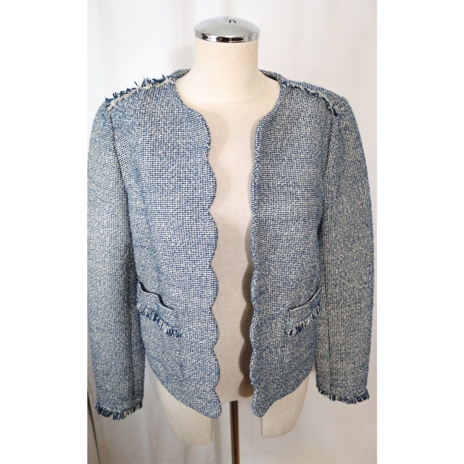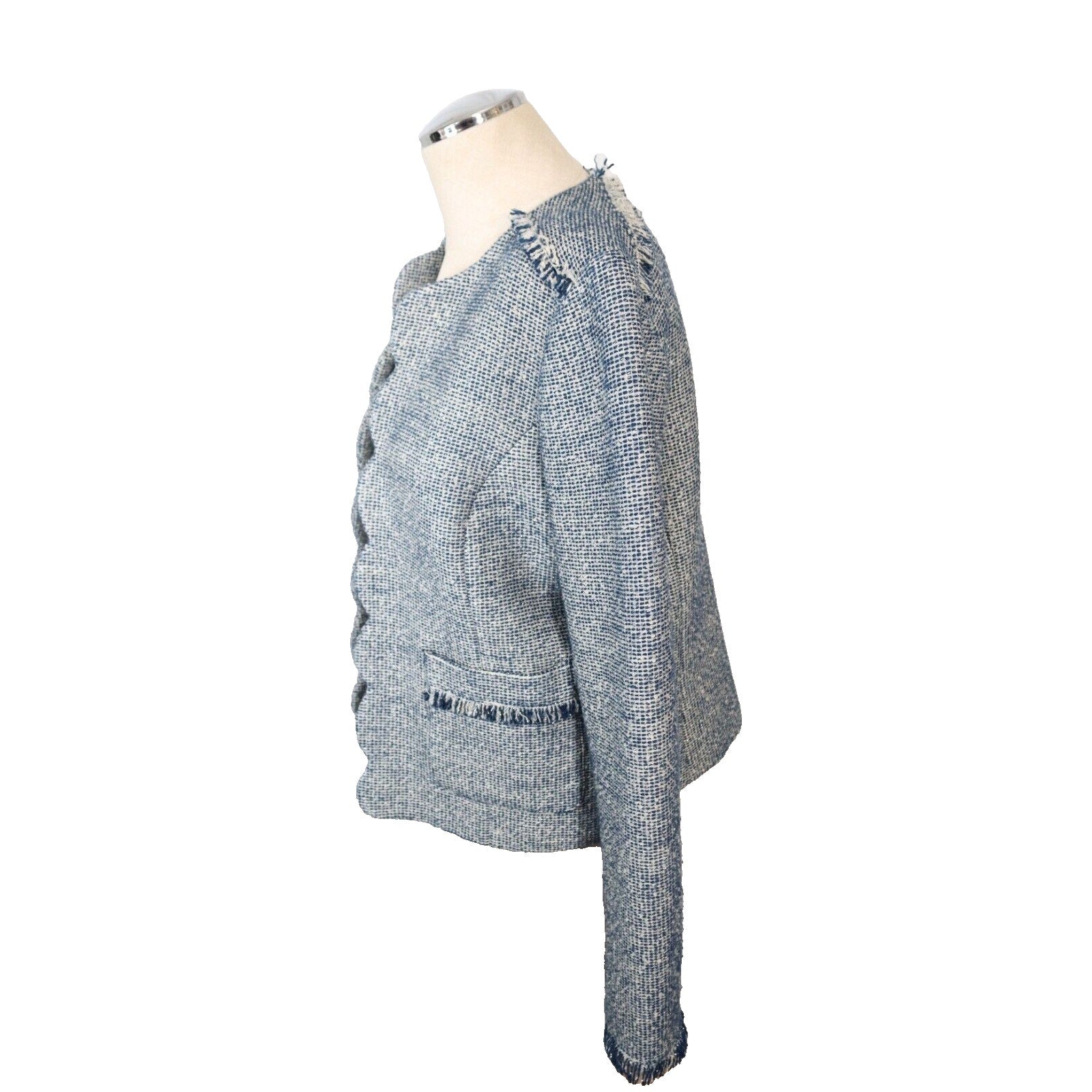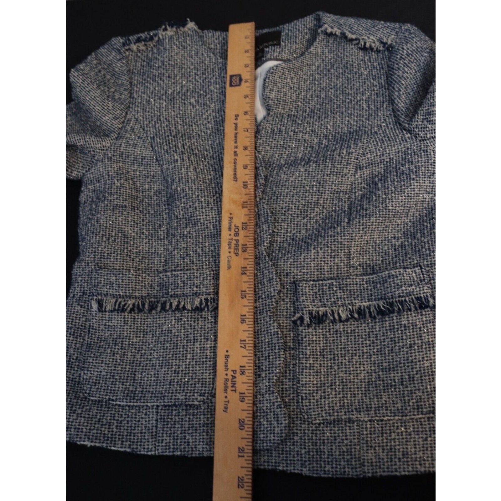 Add a pop of color to your wardrobe with this Banana Republic Tweed Blazer in Blue. This blazer is perfect for any occasion, whether it's casual, workwear, or business. The jacket/coat length is short and the fabric type is tweed, giving it a classic and timeless look. The blazer is made of a blend of polyester, cotton, and arcylic materials, while the lining is made of polyester. The blazer also features fringe accents, adding a touch of fun and flair to the overall design. This blazer is a size 8 and is suitable for regular size types. It is perfect for the fall, winter, and spring seasons.