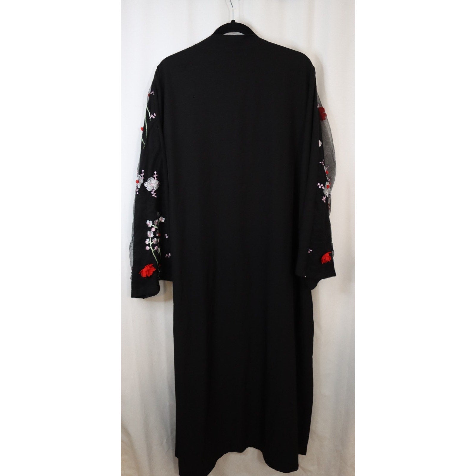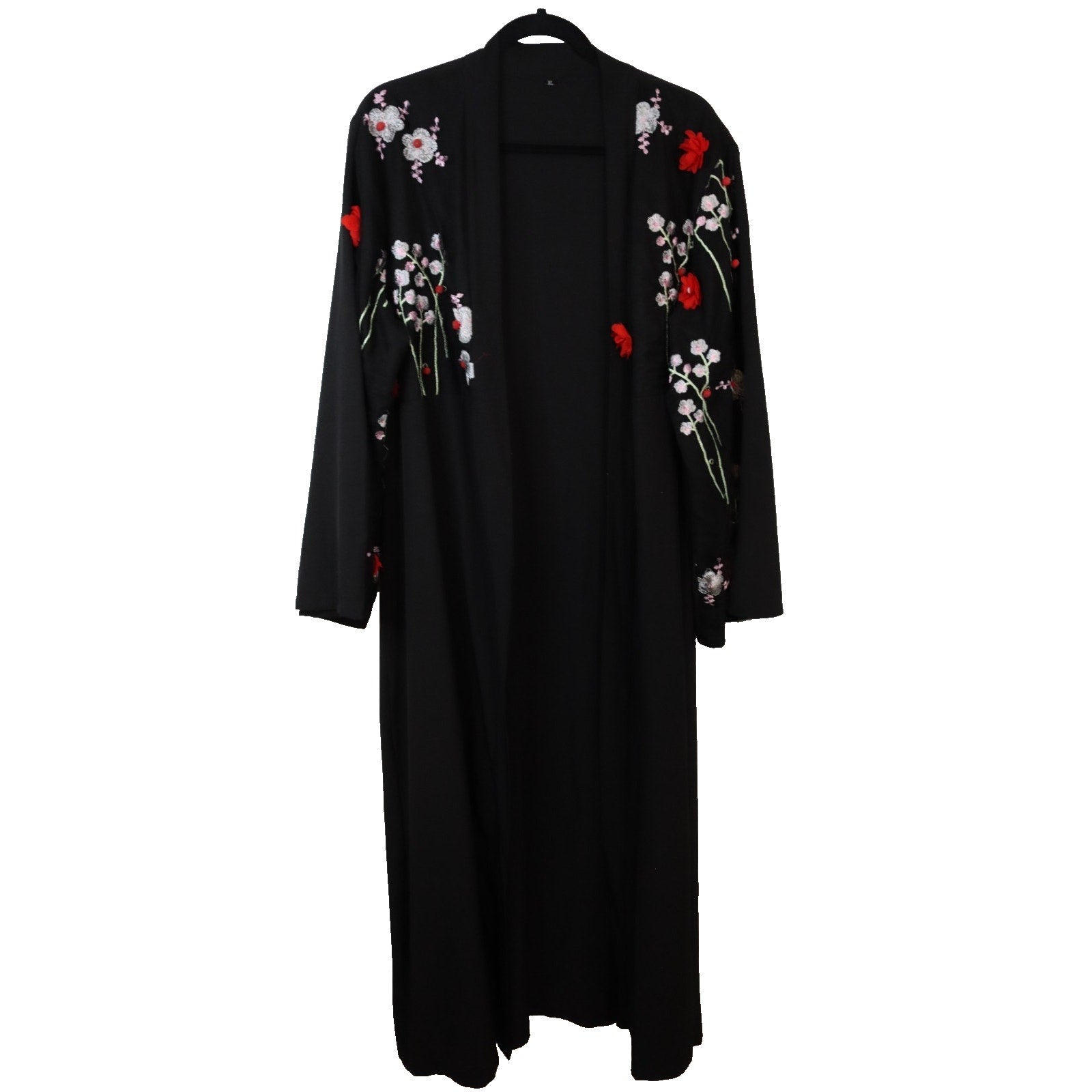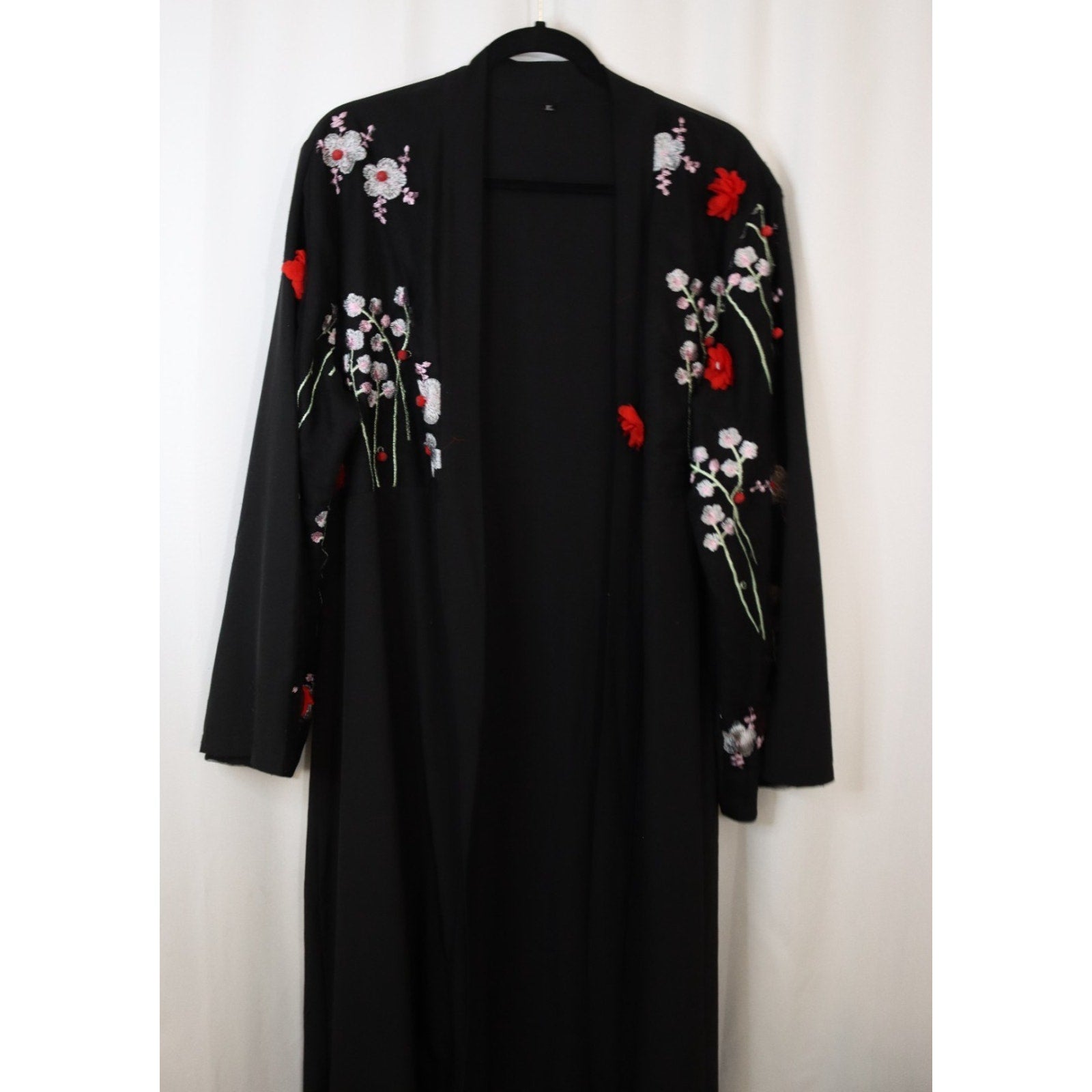 This product is an XL black abaya with intricate flower embroidery, specifically designed for women. It falls under the category of Middle Eastern traditional clothing, making it a unique and stylish choice for those looking for a special outfit. The black color and intricate embroidery add a touch of elegance and sophistication to the attire, making it suitable for various occasions or religious events.