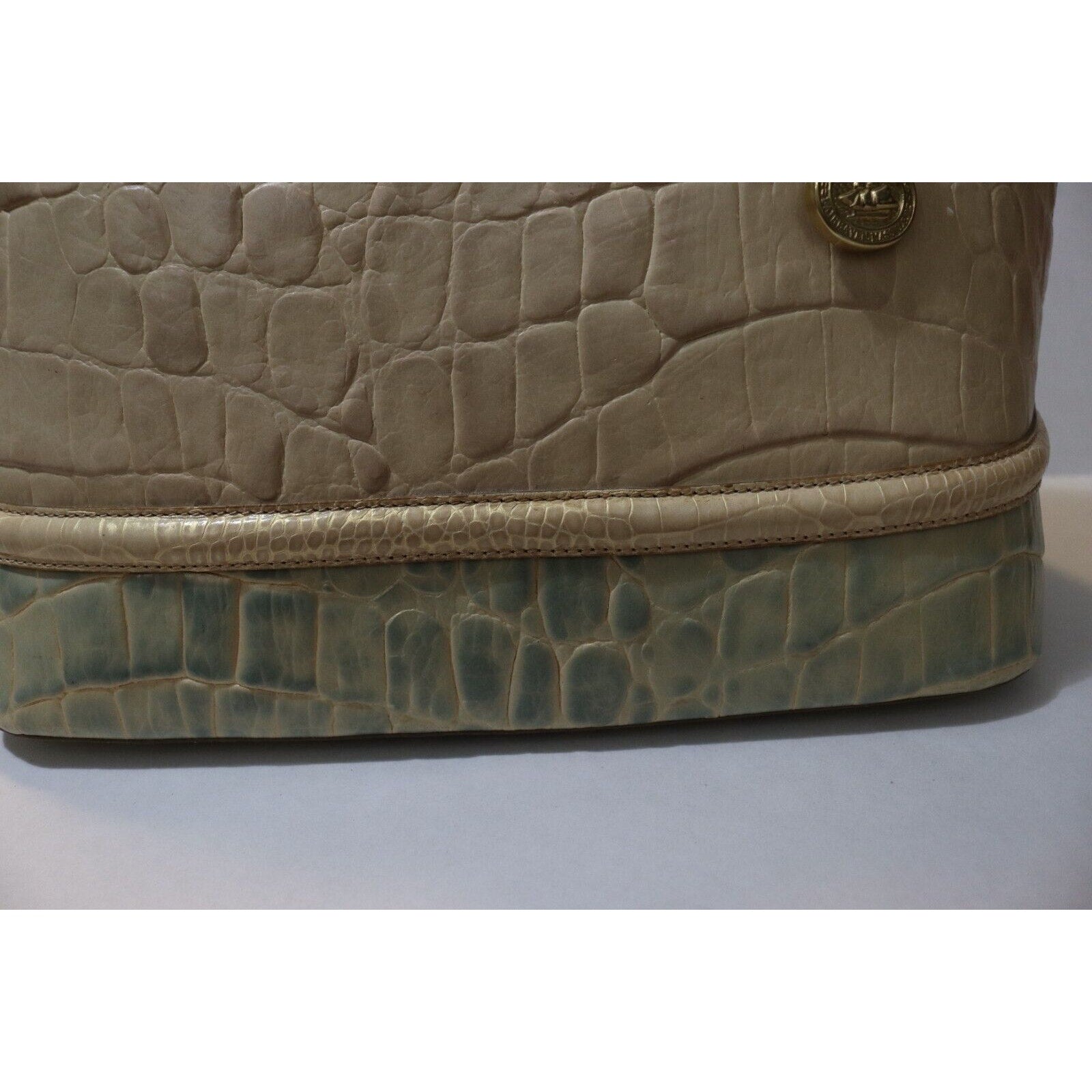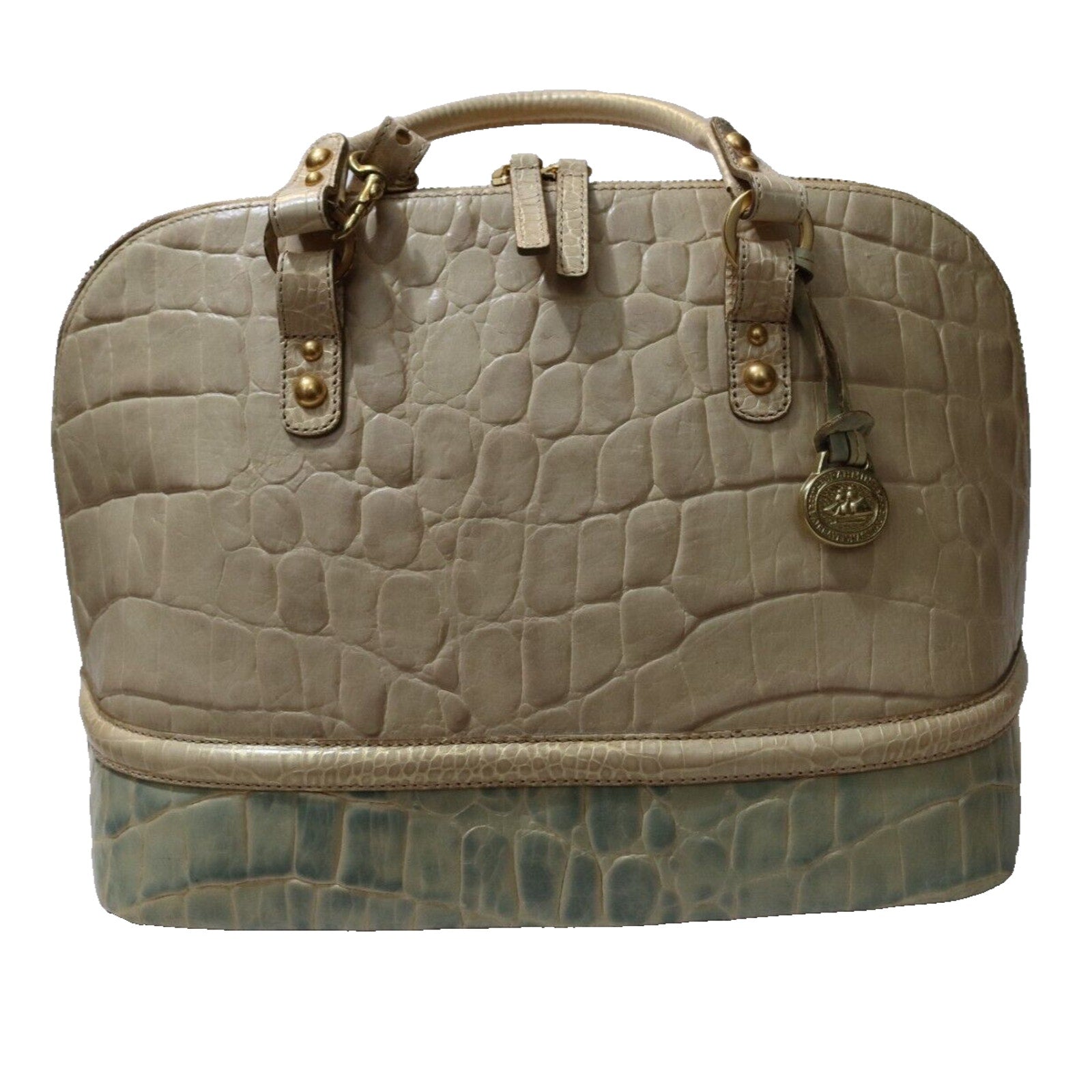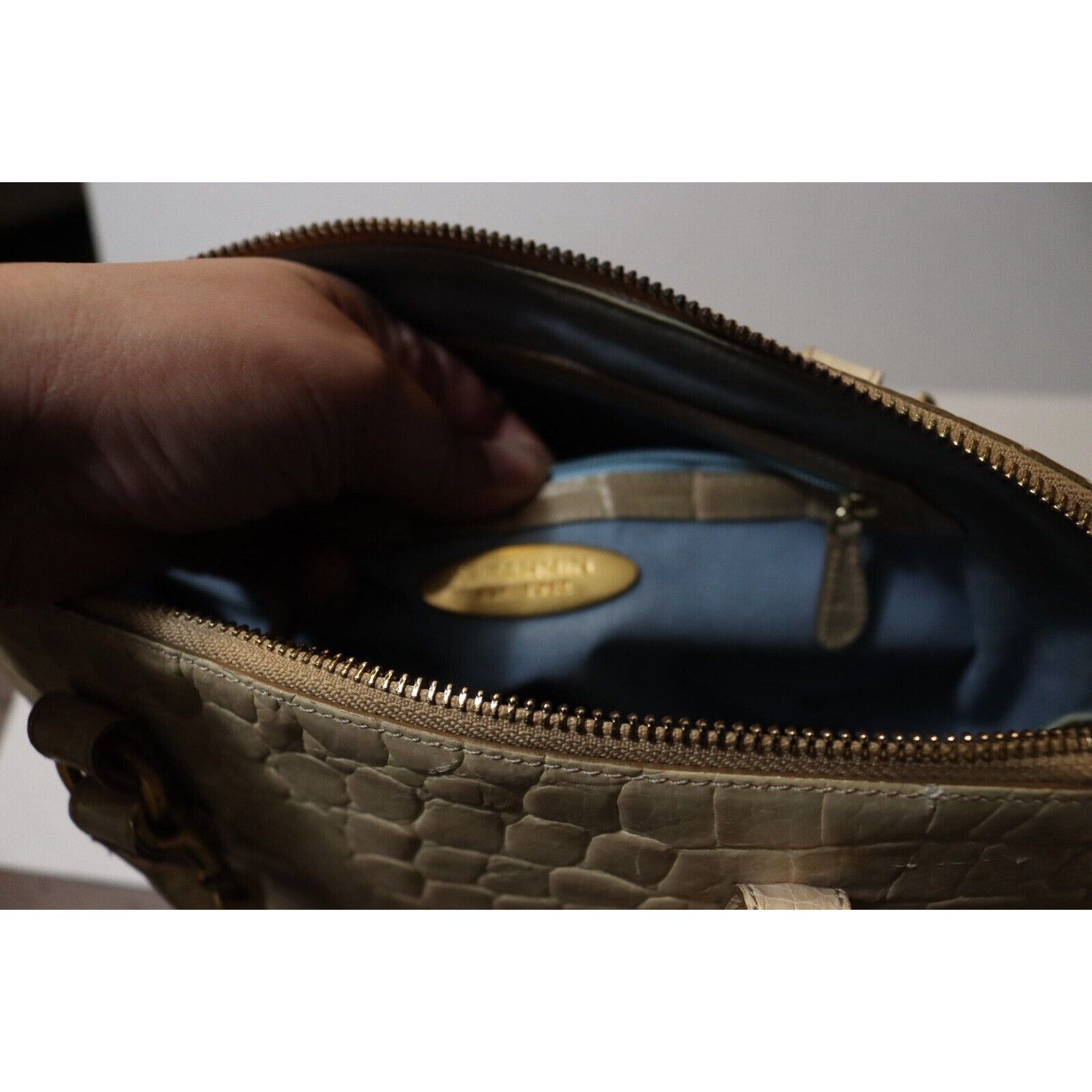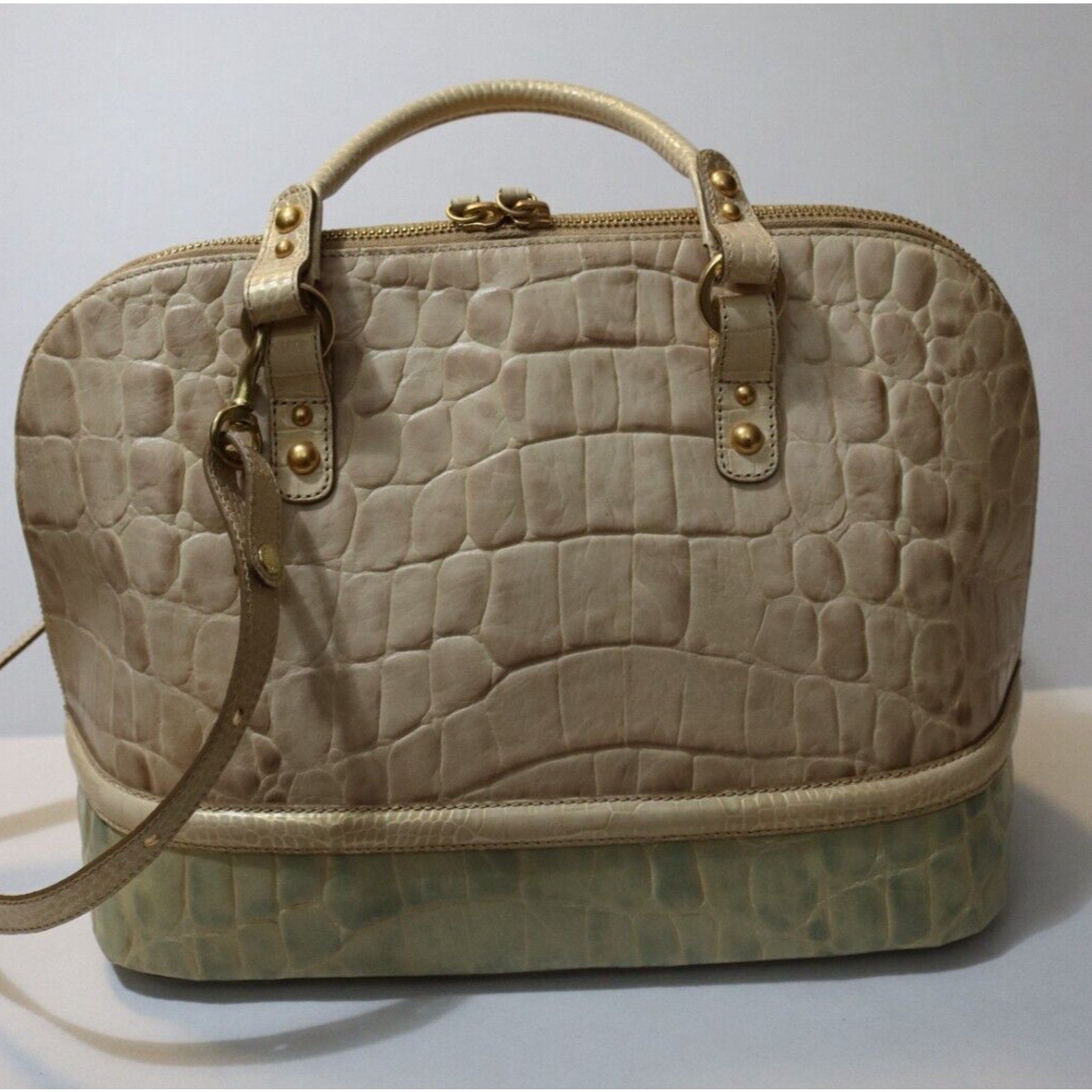 This Brahmin handbag is a stylish and versatile accessory for women. Made of alligator leather in a two tone pattern, it features a zip closure, gold hardware, and a suede lining in blue. The bag can be carried as a top handle satchel or worn crossbody with the beige leather strap. With a spacious size and elegant design, it is perfect for business occasions.