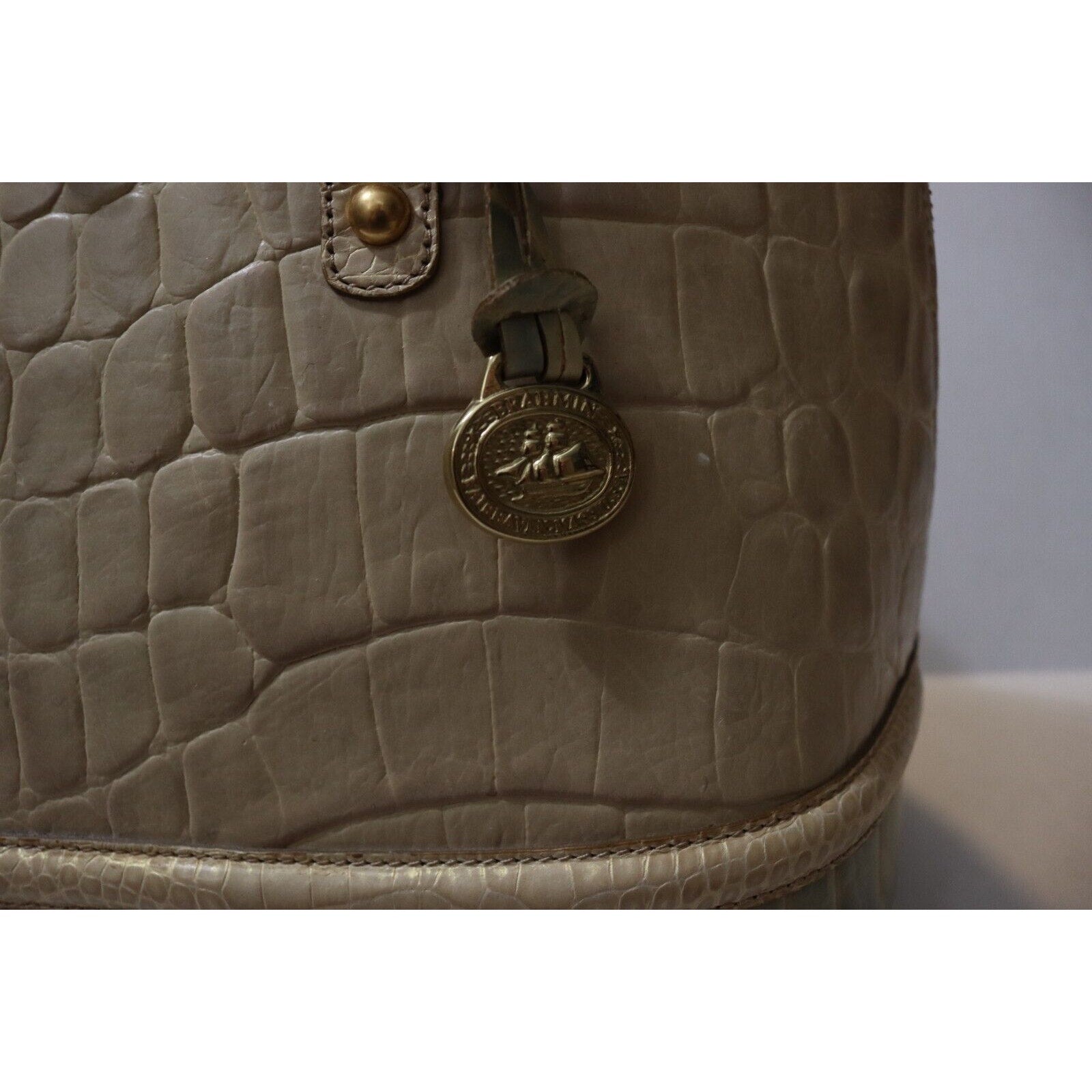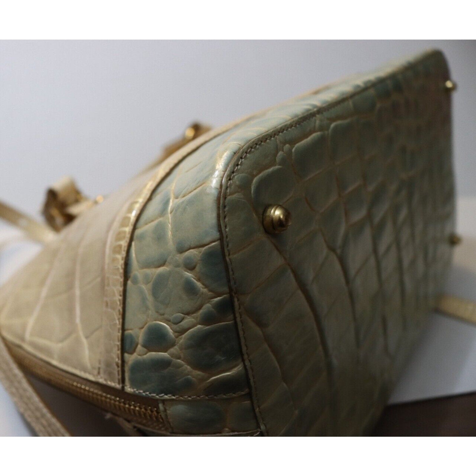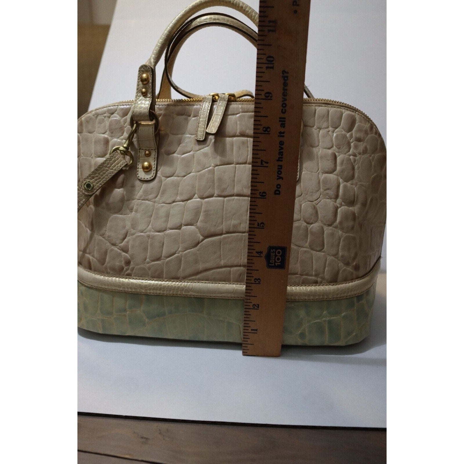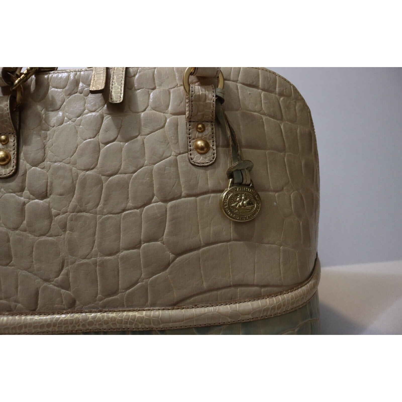 This Brahmin handbag is a stylish and versatile accessory for women. Made of alligator leather in a two tone pattern, it features a zip closure, gold hardware, and a suede lining in blue. The bag can be carried as a top handle satchel or worn crossbody with the beige leather strap. With a spacious size and elegant design, it is perfect for business occasions.