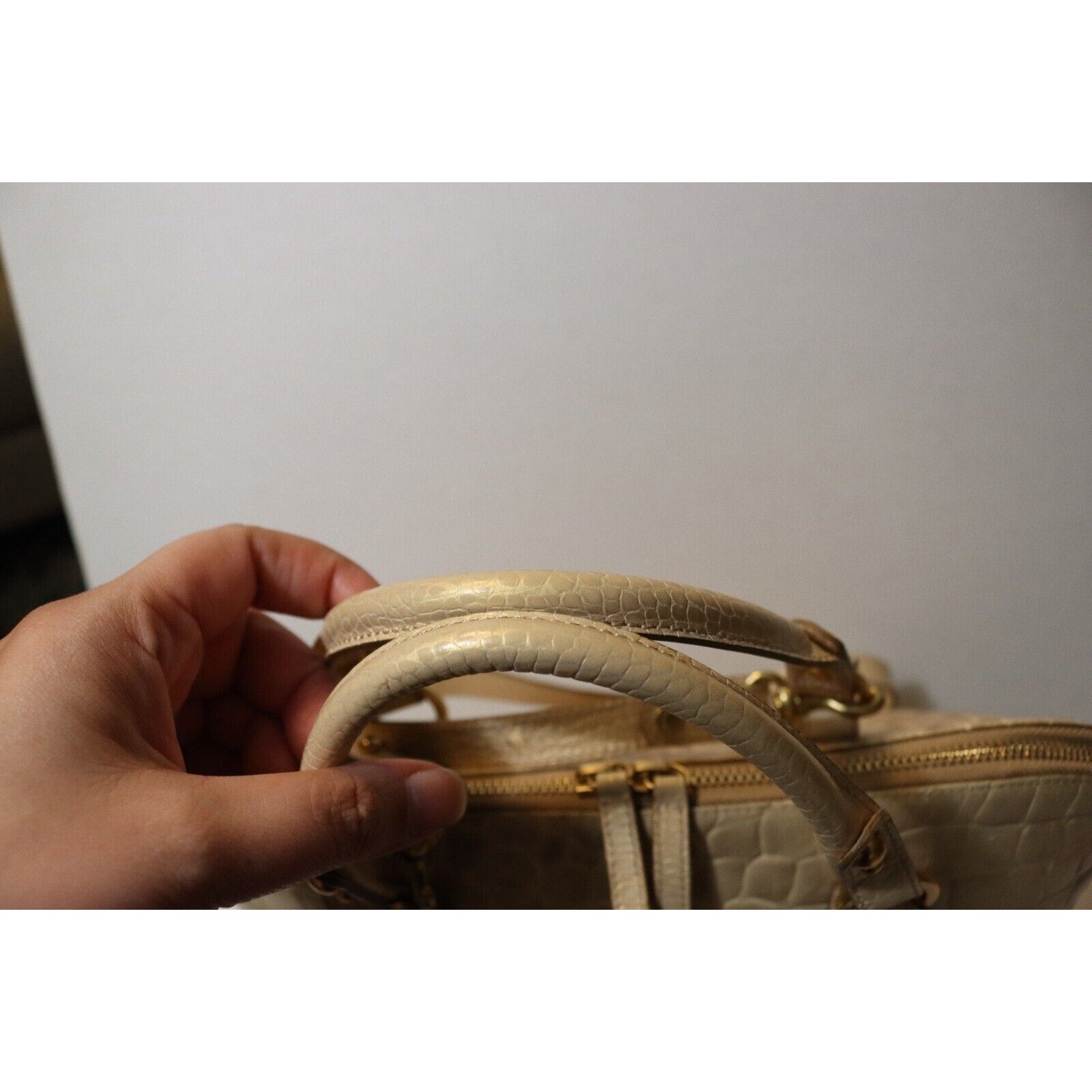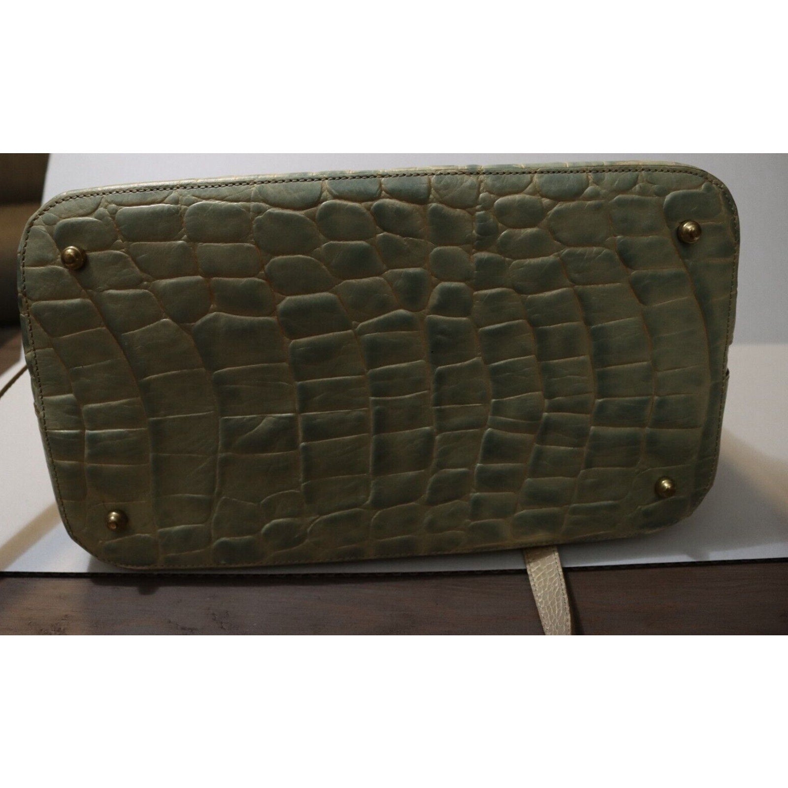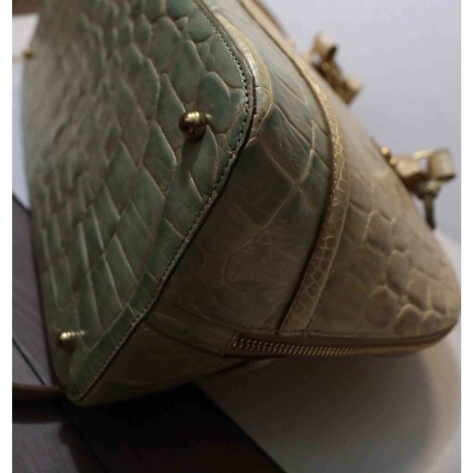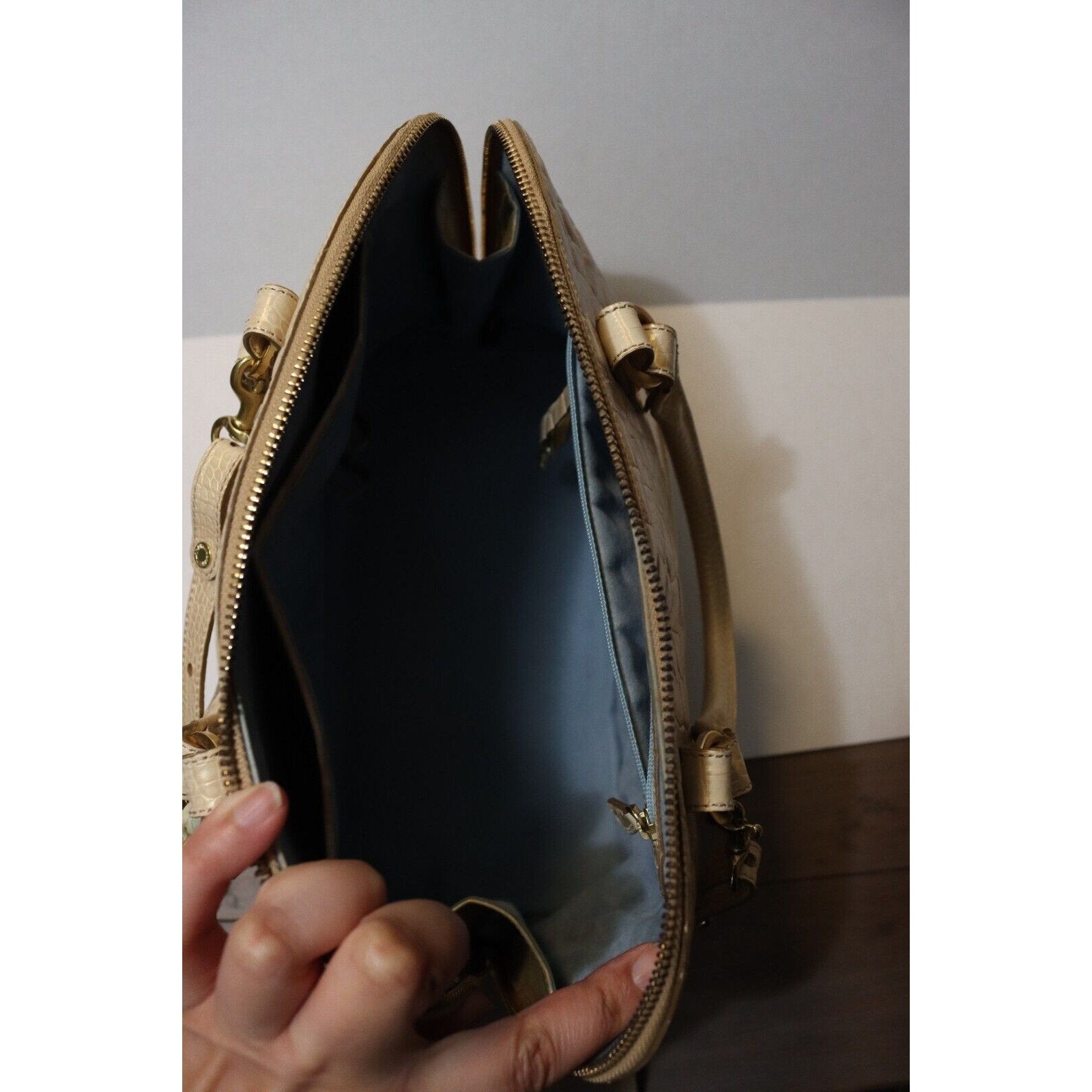 This Brahmin handbag is a stylish and versatile accessory for women. Made of alligator leather in a two tone pattern, it features a zip closure, gold hardware, and a suede lining in blue. The bag can be carried as a top handle satchel or worn crossbody with the beige leather strap. With a spacious size and elegant design, it is perfect for business occasions.
