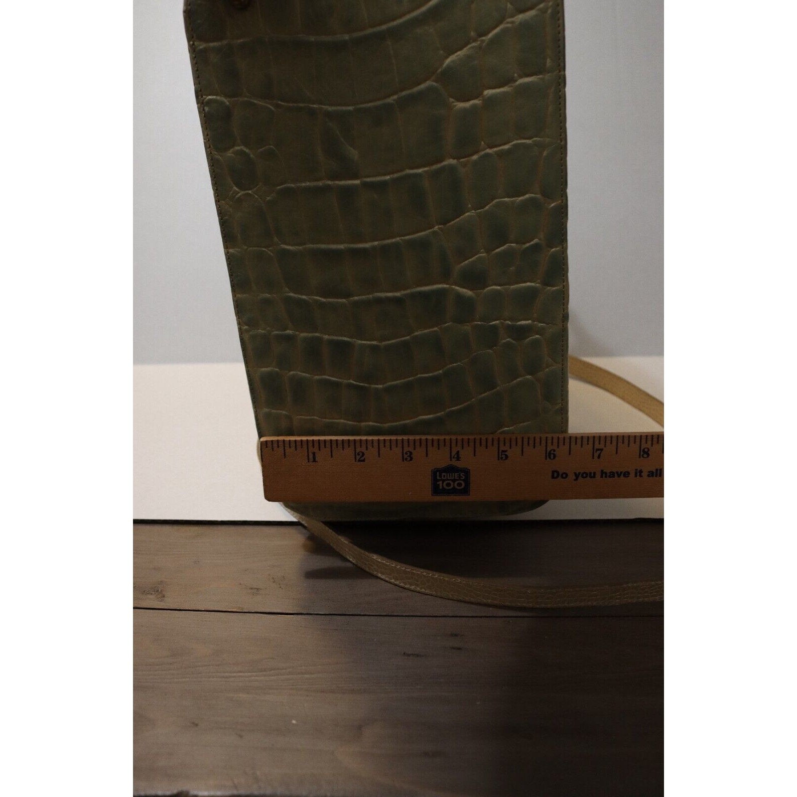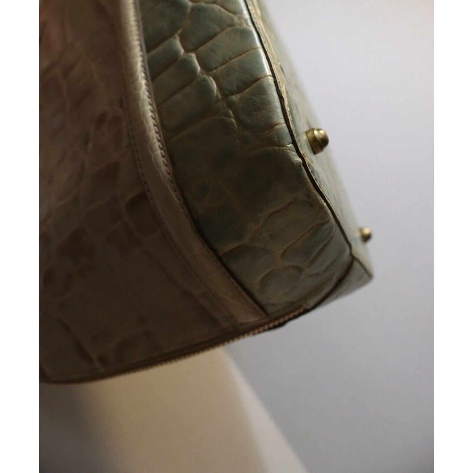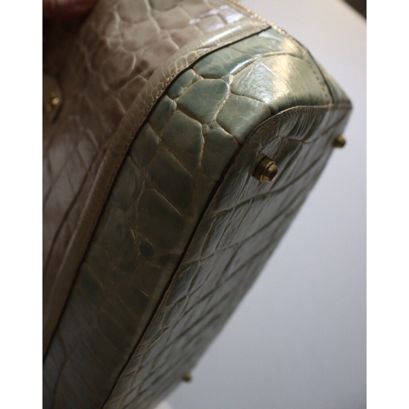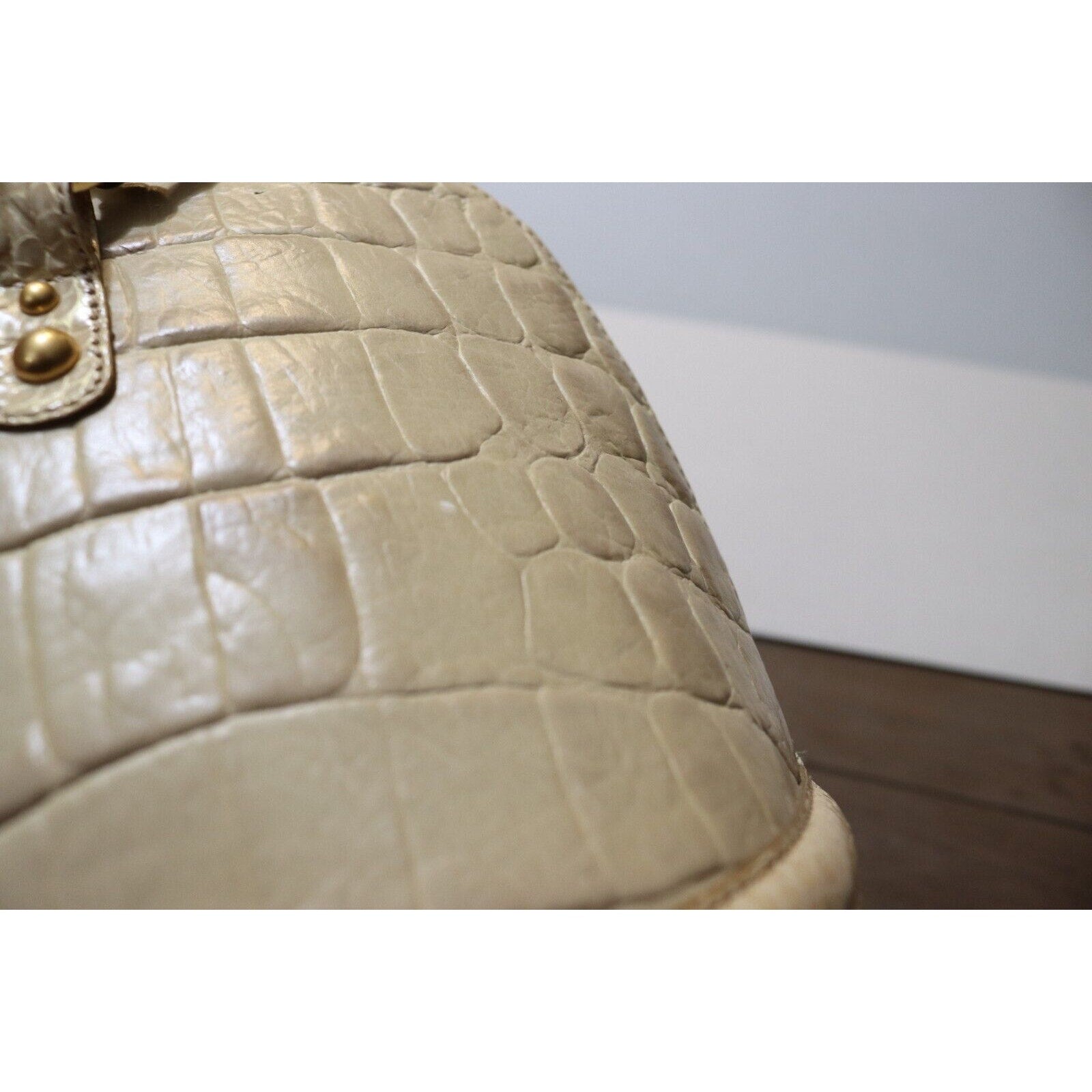 This Brahmin handbag is a stylish and versatile accessory for women. Made of alligator leather in a two tone pattern, it features a zip closure, gold hardware, and a suede lining in blue. The bag can be carried as a top handle satchel or worn crossbody with the beige leather strap. With a spacious size and elegant design, it is perfect for business occasions.
