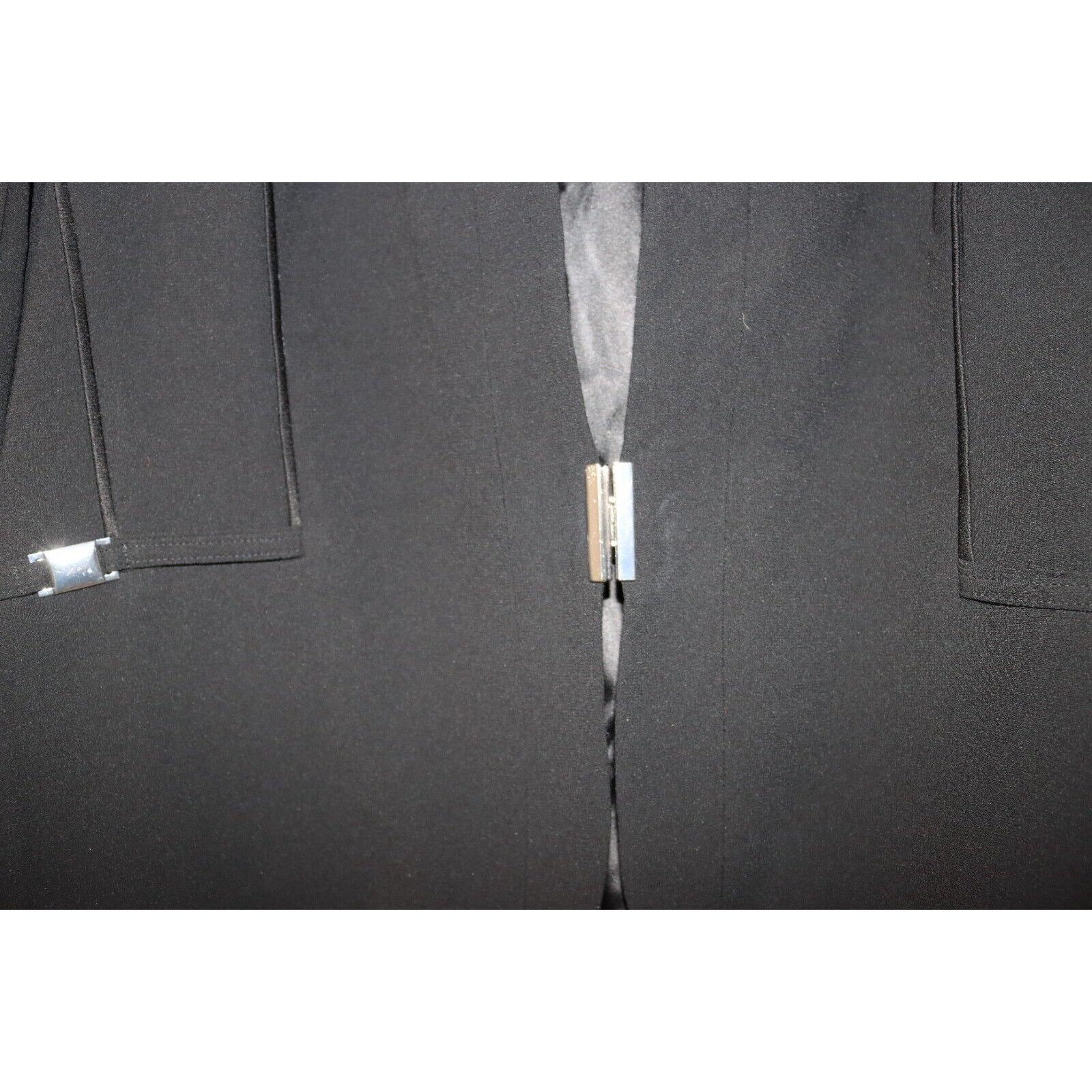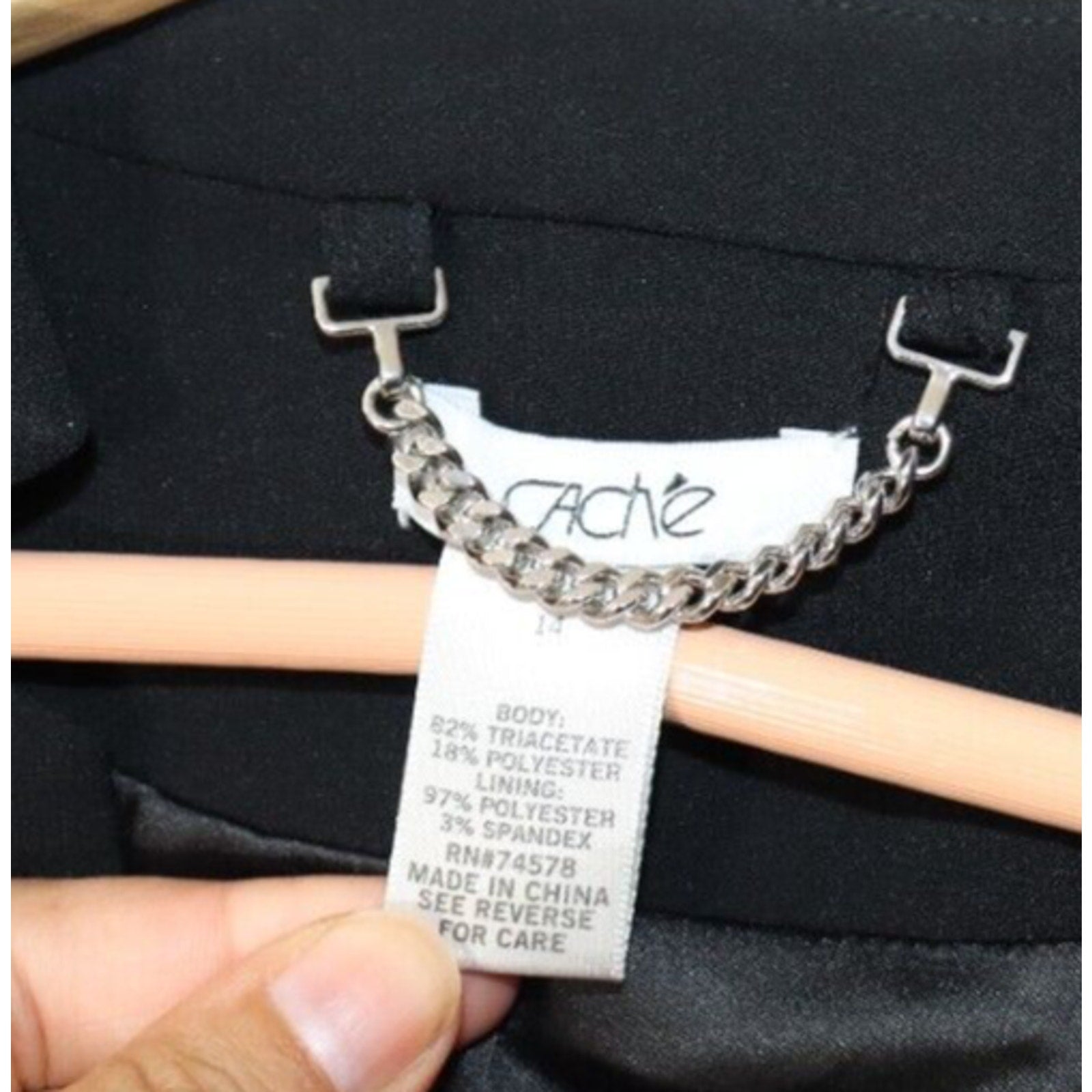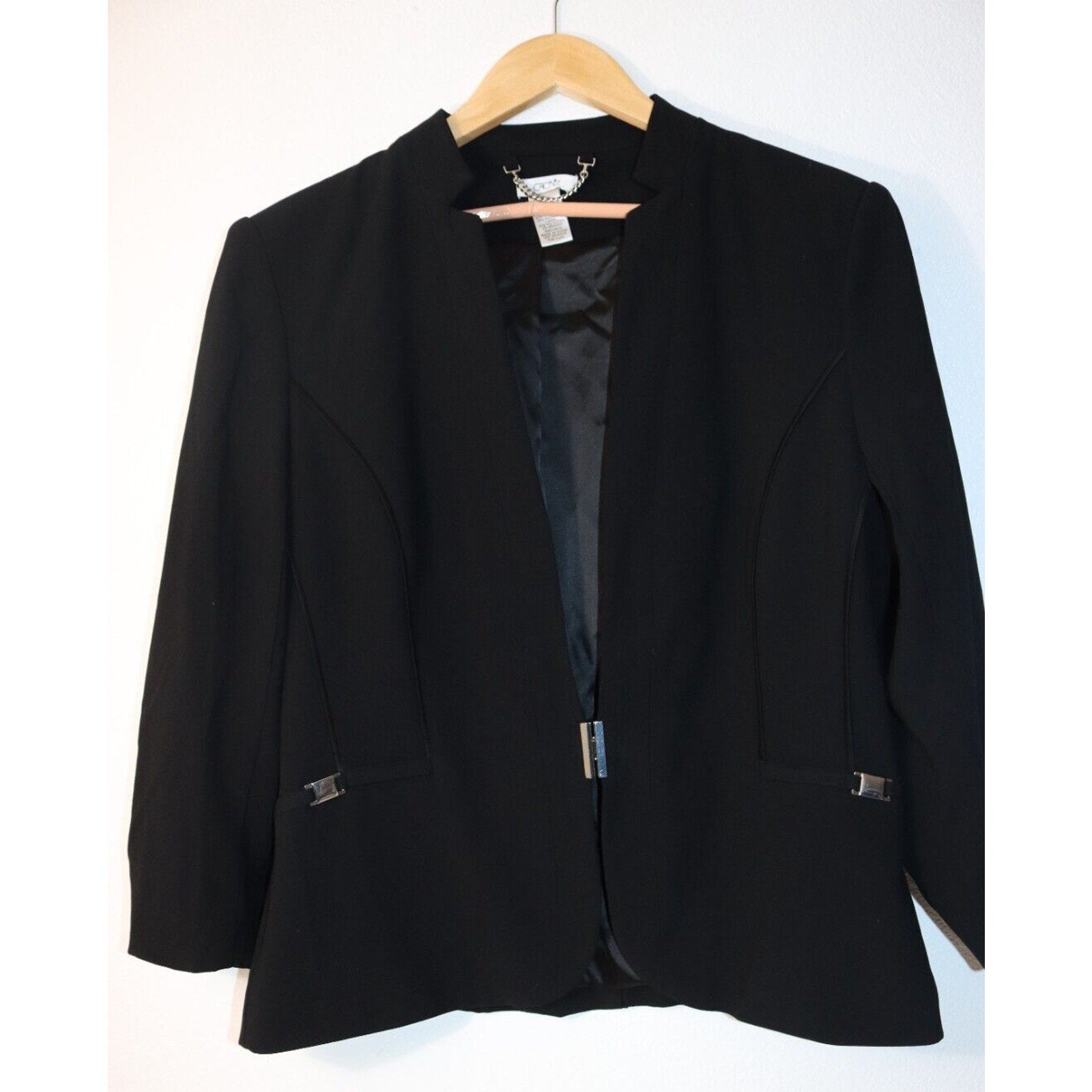 This black blazer from Caché is a classic addition to any wardrobe. The blazer features a solid pattern, short length, and silver hardware. It is made from a triacetate outer shell material and lined with polyester for added comfort. This blazer is perfect for a casual, formal, or business occasion and is available in size 14. The blazer is suitable for women and has a regular size type. It is a basic jacket style and is part of the Winter, Fall, and Spring seasons.
