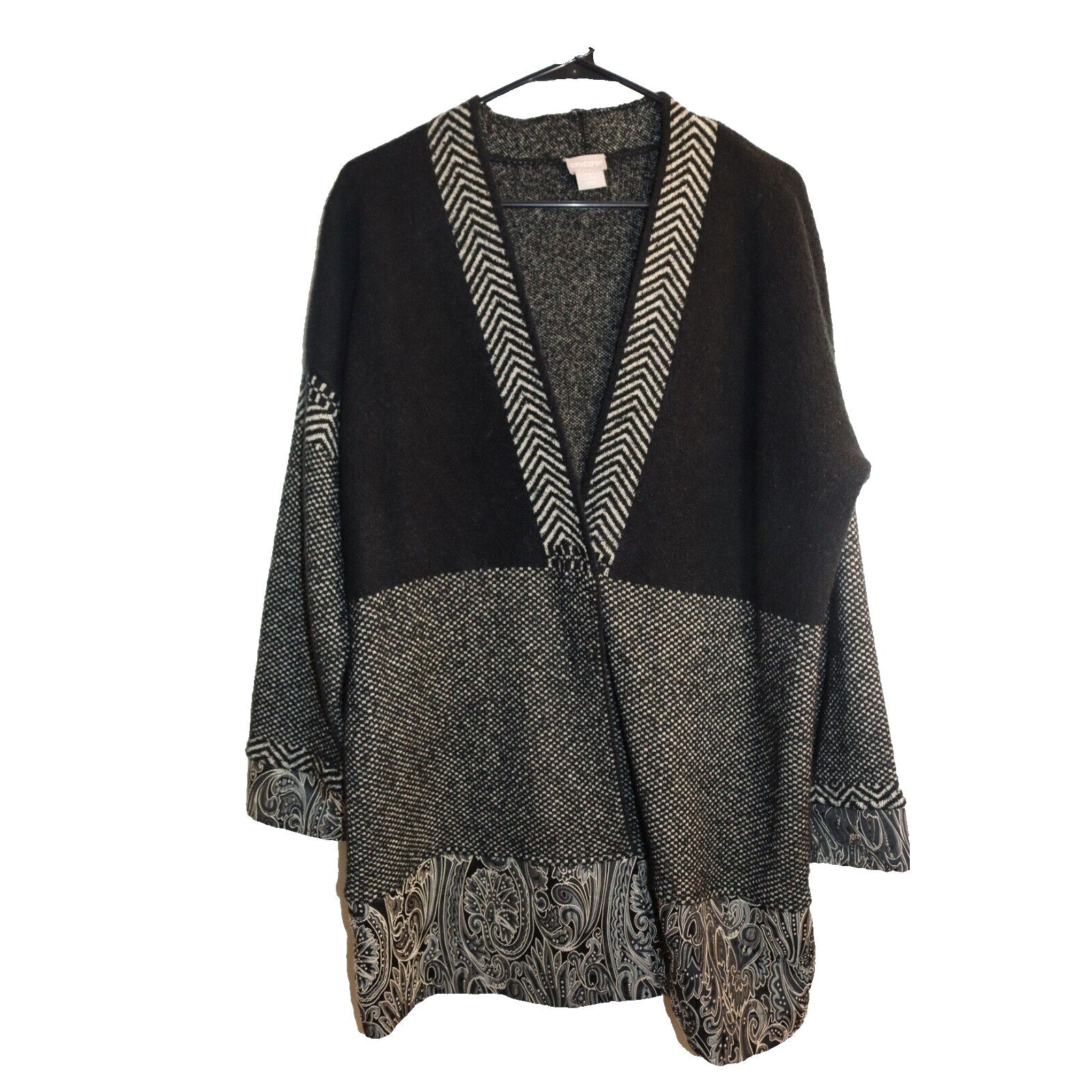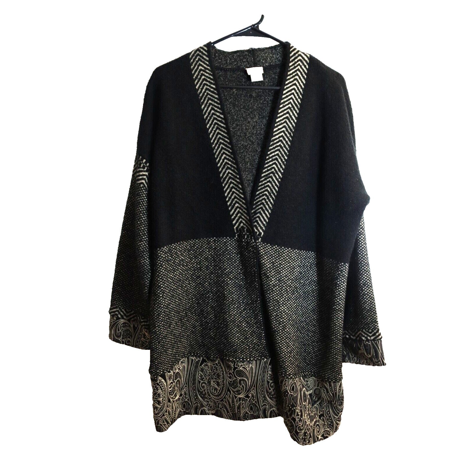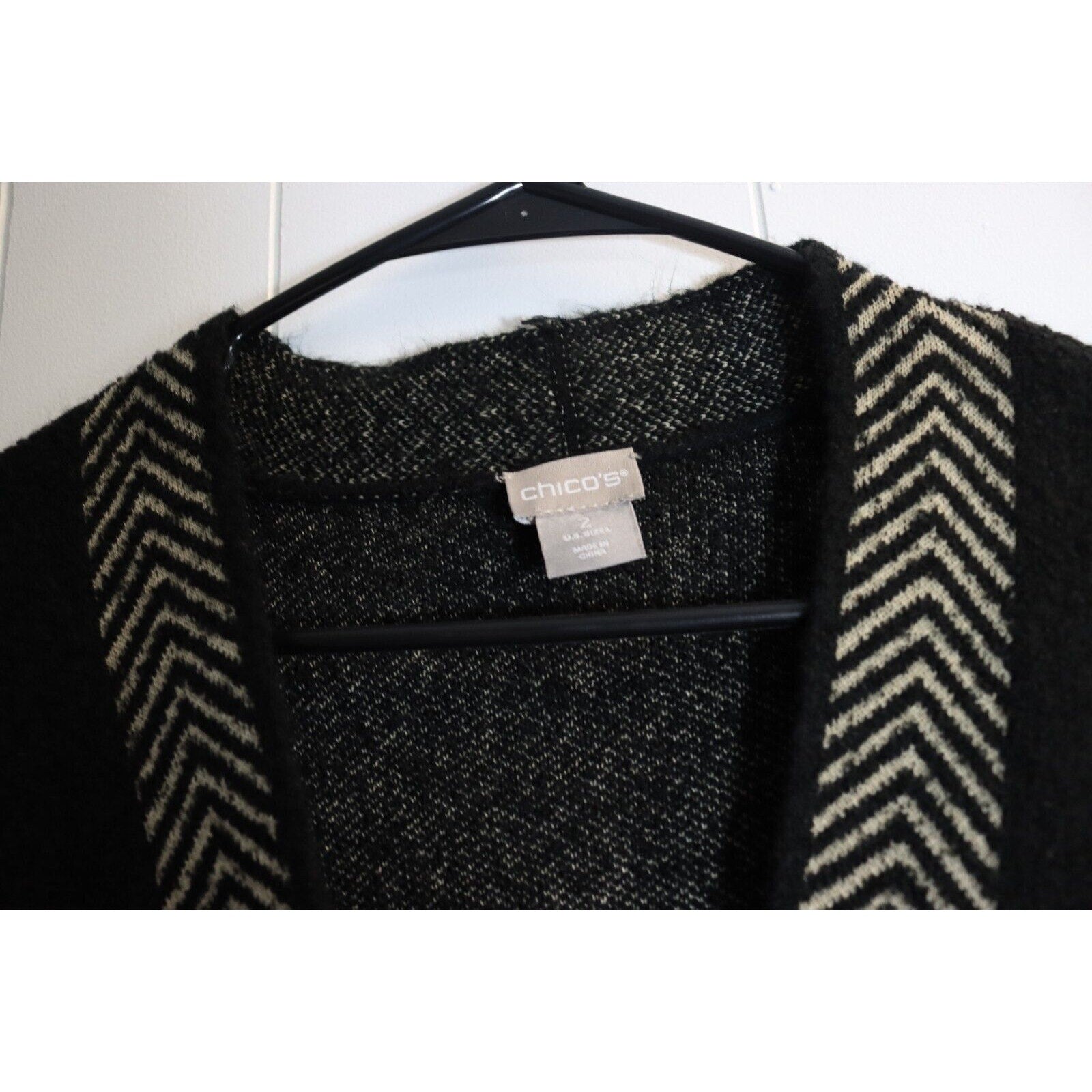 This beautiful black and grey Chico's cardigan is a must-have for any fashion-forward woman's wardrobe. Made from a comfortable and durable blend of polyester, nylon, spandex, cotton, and acrylic, this sweater is perfect for the fall and winter seasons. The long sleeve design and knit fabric type make it both cozy and stylish, while the cardigan style adds an extra touch of sophistication. Whether dressing it up for a night out or dressing it down for a casual day out, this cardigan is versatile and perfect for any occasion. It is a size 2/L and would be a great addition to any wardrobe. Don't miss out on the opportunity to own this stylish and comfortable sweater.