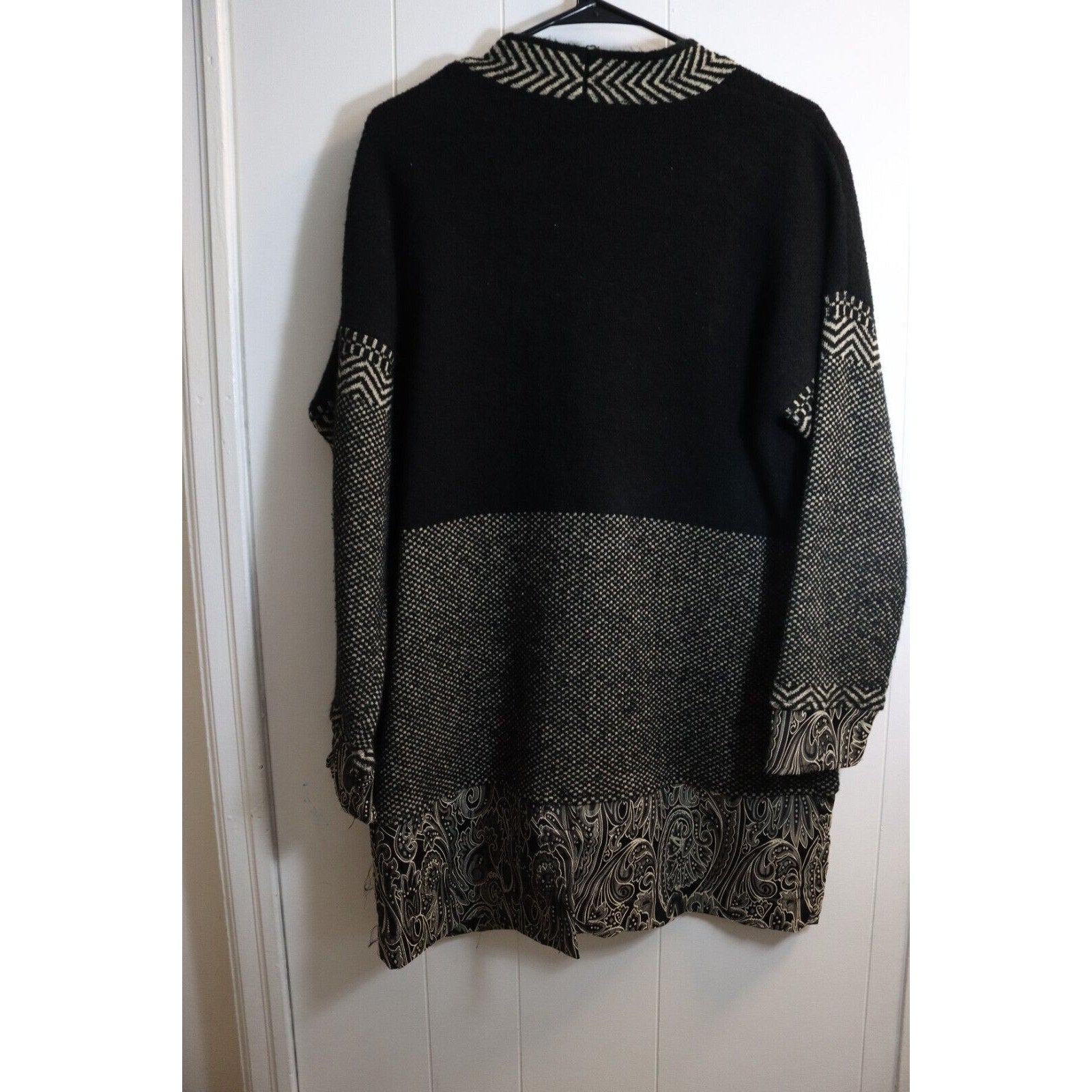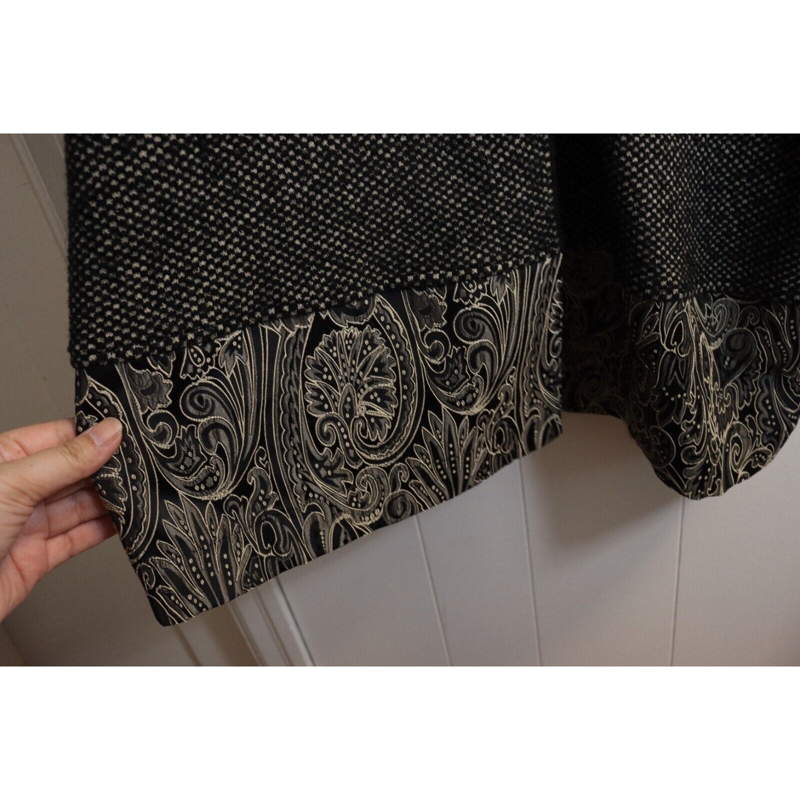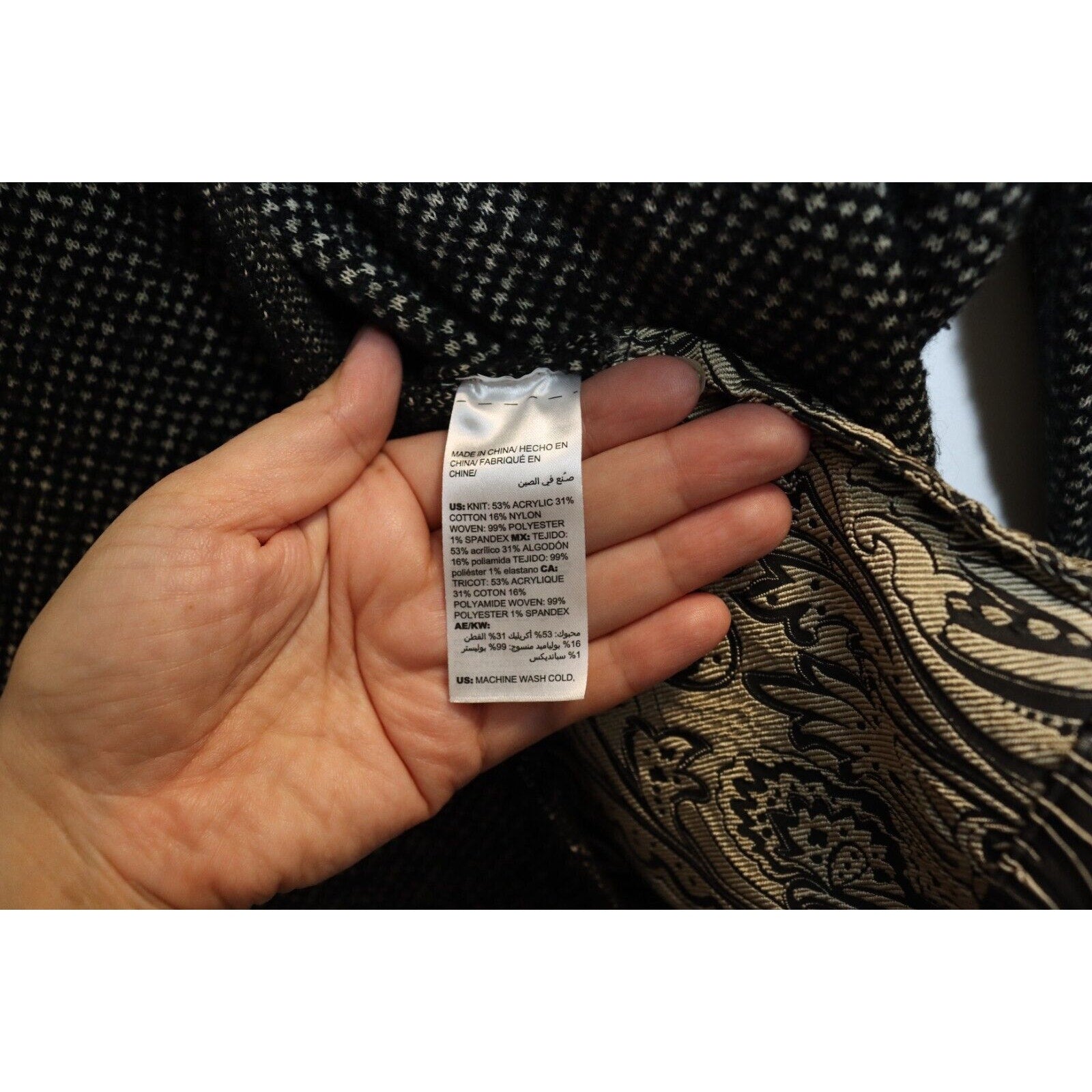 This beautiful black and grey Chico's cardigan is a must-have for any fashion-forward woman's wardrobe. Made from a comfortable and durable blend of polyester, nylon, spandex, cotton, and acrylic, this sweater is perfect for the fall and winter seasons. The long sleeve design and knit fabric type make it both cozy and stylish, while the cardigan style adds an extra touch of sophistication. Whether dressing it up for a night out or dressing it down for a casual day out, this cardigan is versatile and perfect for any occasion. It is a size 2/L and would be a great addition to any wardrobe. Don't miss out on the opportunity to own this stylish and comfortable sweater.