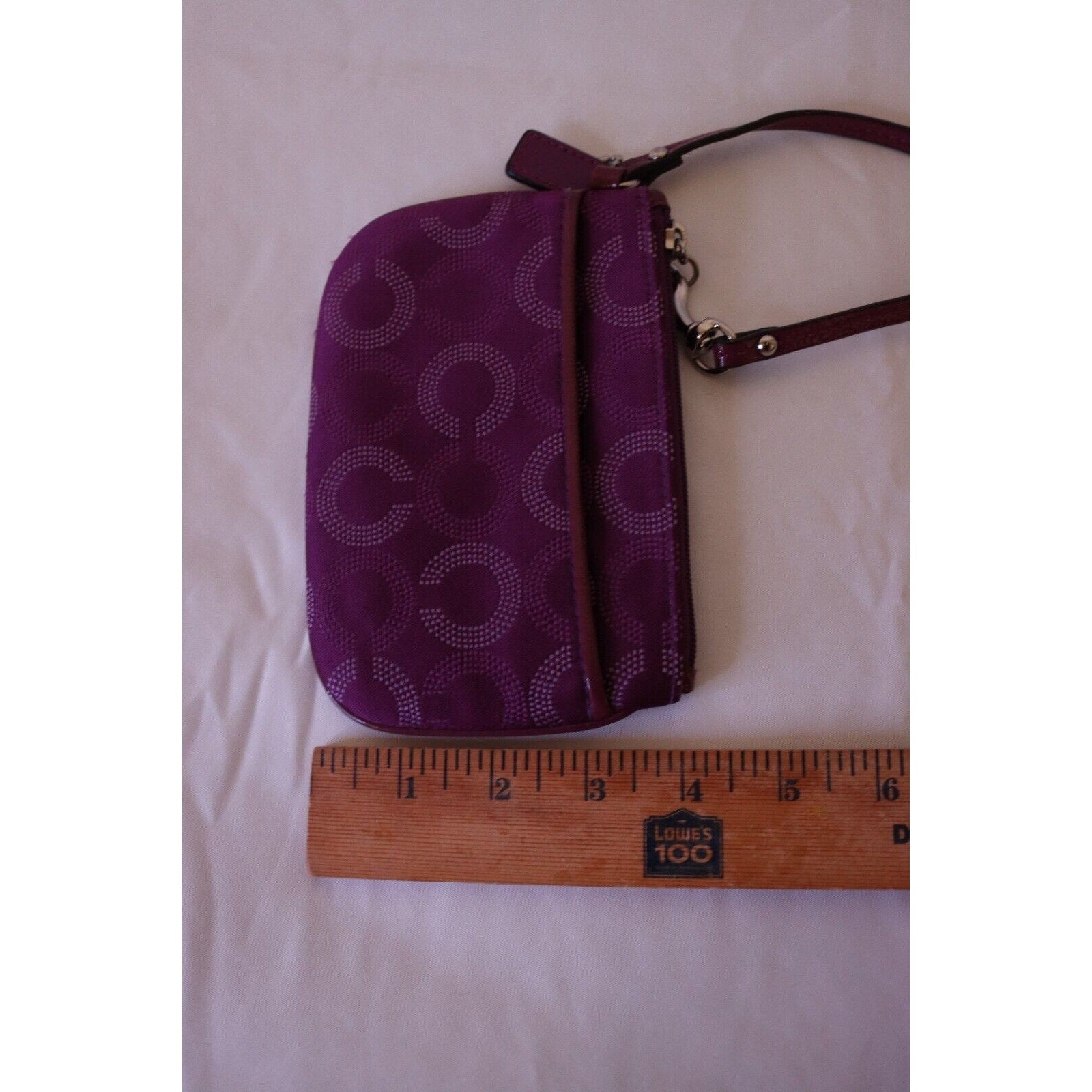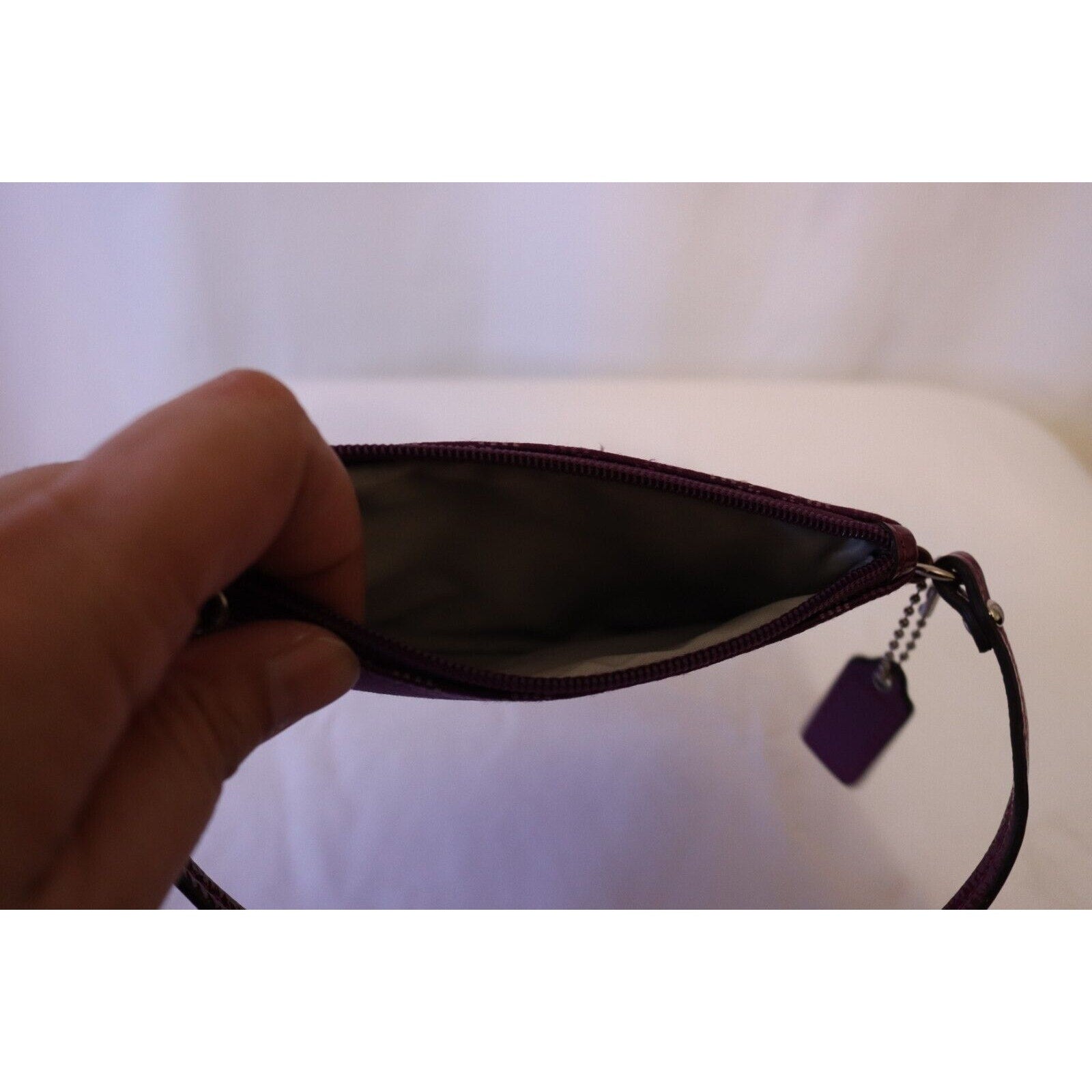 The Coach Purple Wristlet C Logo Hangtag is a stylish accessory designed for women. This wallet features the signature Coach logo on a purple background. With its small size and wristlet style, this accessory is perfect for on-the-go use and adds a touch of luxury to any outfit. Perfect for those who love the Coach brand and appreciate classic yet trendy accessories.