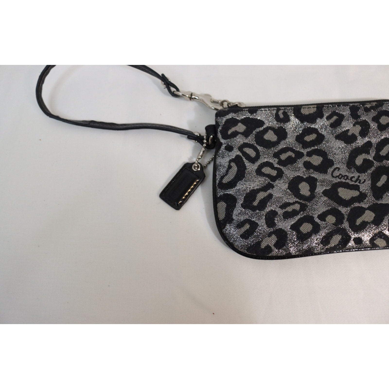 The Coach Wristlet in Leopard Black Grey Metallic is a stylish and compact accessory designed for women. This wristlet features a bold animal print pattern with a zip closure and a black wrist strap, making it easy to carry on the go. Made of fabric with black leather accents, this small wristlet is perfect for keeping essentials organized in a chic and fashionable way. With its iconic Coach branding and on-trend leopard theme, this wristlet is a must-have for any fashion-forward individual.