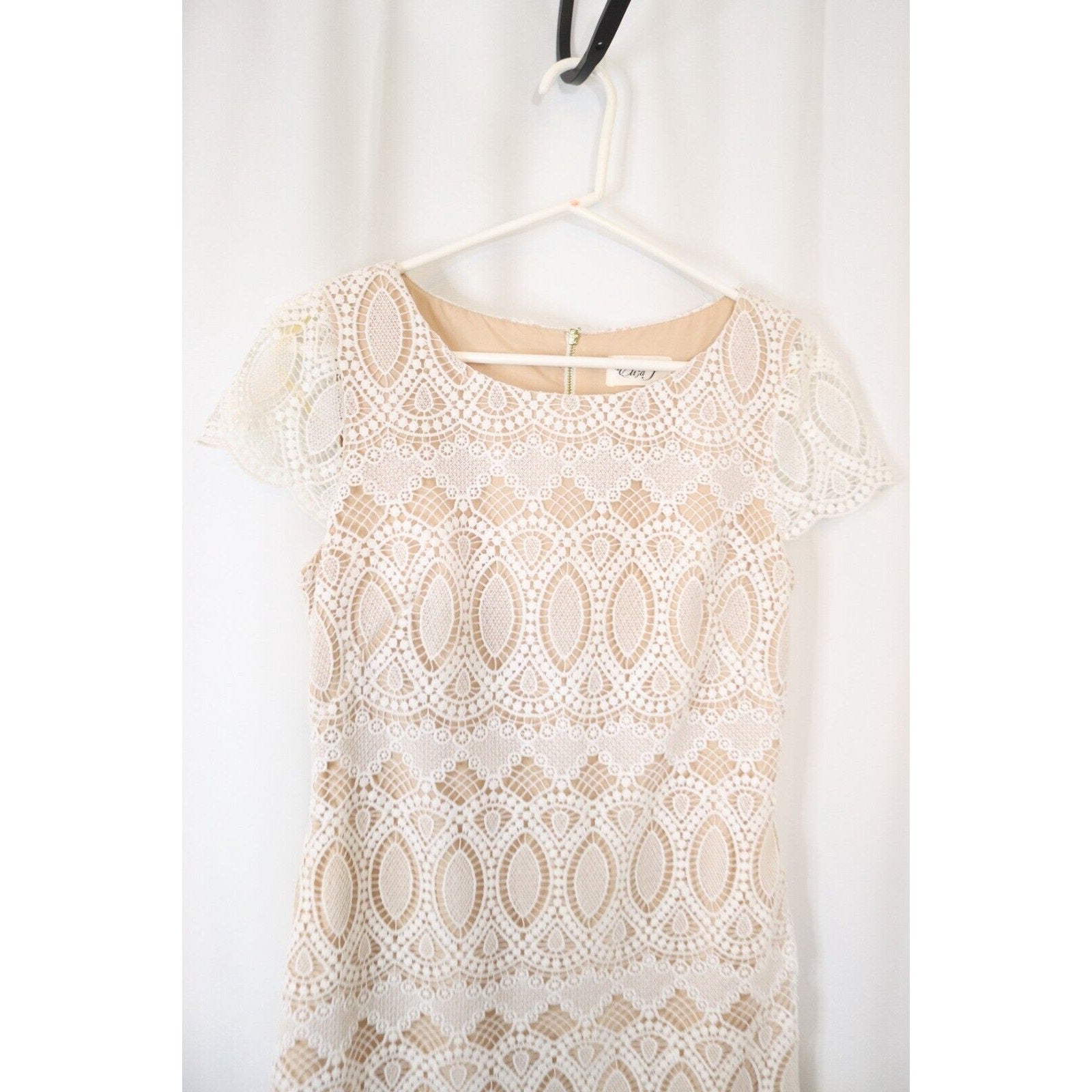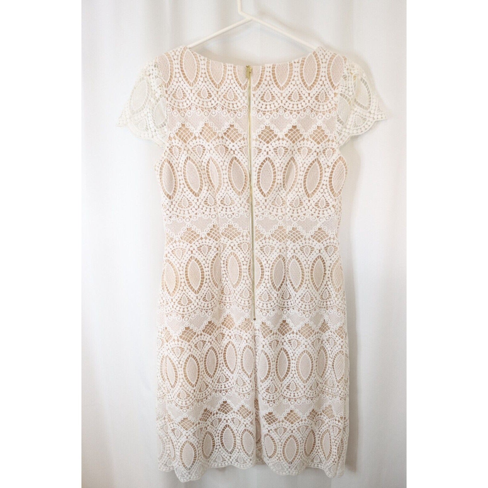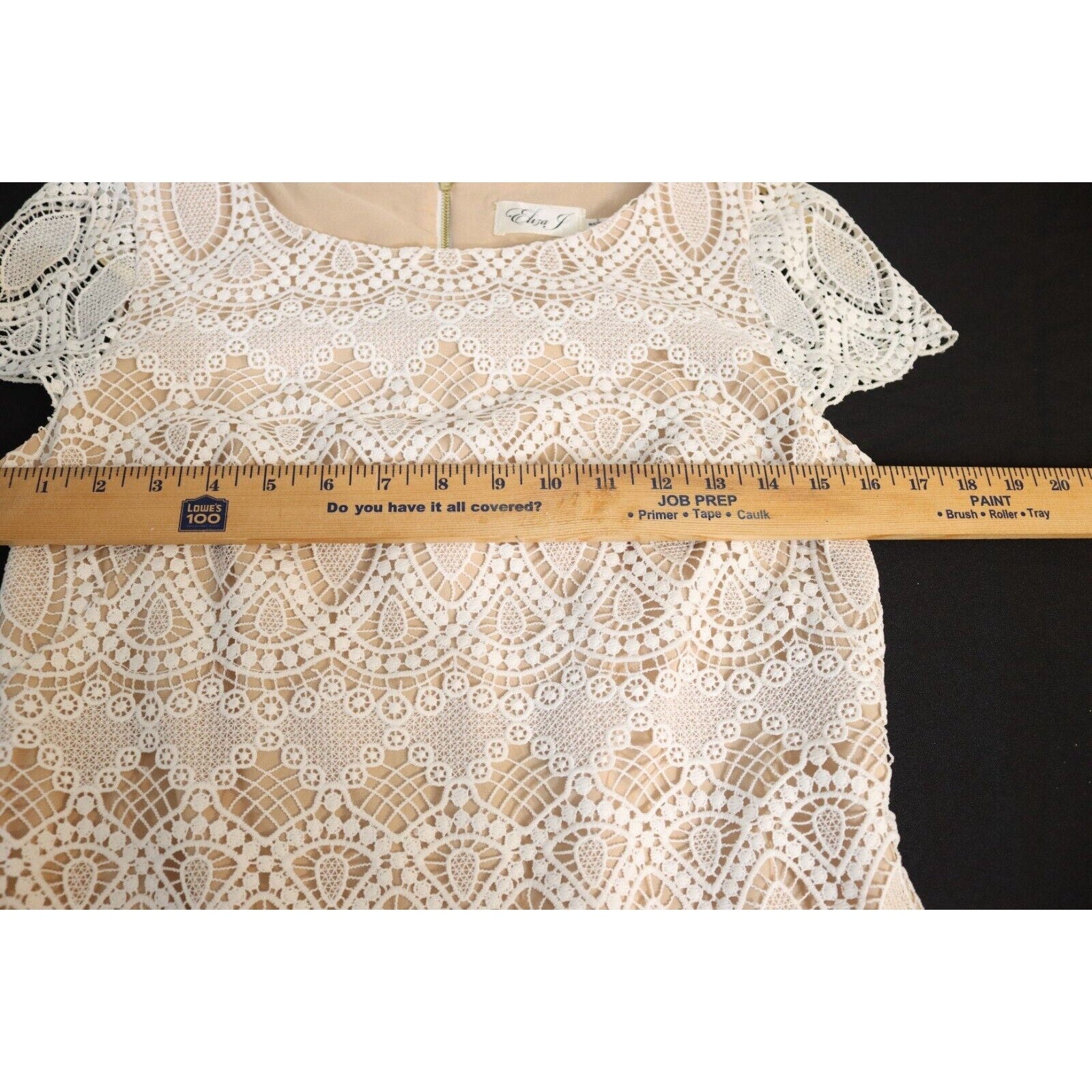 This stunning Eliza J. dress is perfect for any formal occasion or party. The lace fabric is delicate and elegant, while the nude lace detailing adds a touch of sophistication. The short sleeves and zip closure make it easy to wear, and the mini length adds a hint of playfulness to the dress. The dress is available in size 2 and is suitable for women of all sizes. The dress is perfect for summer, fall, and spring seasons. Whether you're attending a wedding or a cocktail party, this dress is sure to turn heads.