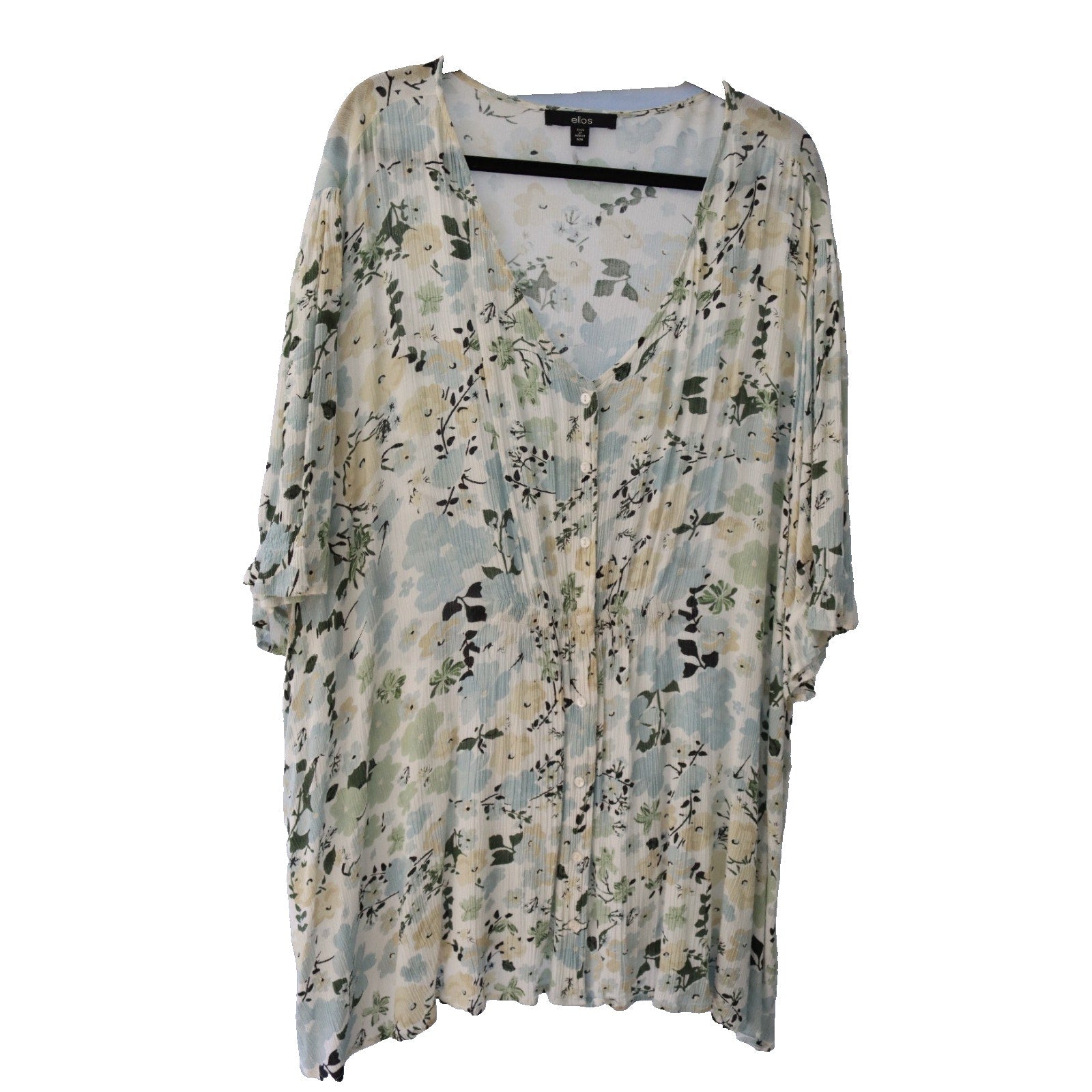 The Ellos Cream and Floral Top in size 26/28/2X is a stylish and versatile button-up blouse perfect for casual occasions during the summer, fall, and spring seasons. The floral pattern and V-neckline add a touch of bohemian flair to this ivory-colored top, making it a chic addition to any woman's wardrobe. With short sleeves and accents of button closures, this blouse offers both comfort and style, embodying a basic yet trendy look for the modern woman.