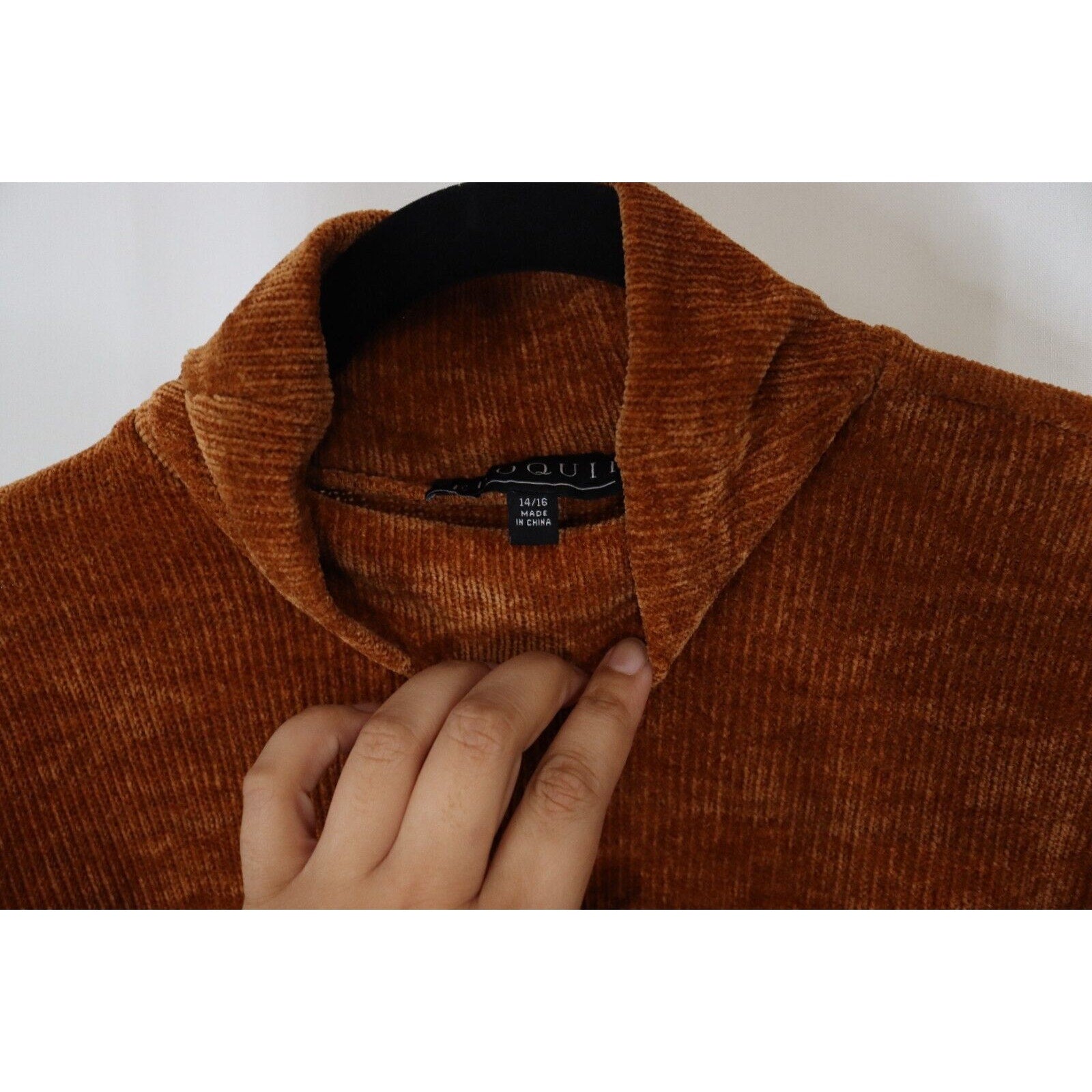 Add a pop of color to your wardrobe with this Eloquii burnt orange turtleneck sweater. The soft corduroy material and long sleeves make it perfect for cooler weather, while the tight-knit pattern and pullover style add a touch of retro charm. Ideal for travel, party, cocktail, casual, or workwear occasions, this sweater is machine washable for easy care. Available in size 14, this regular fit sweater features a solid design and is made of polyester fabric.