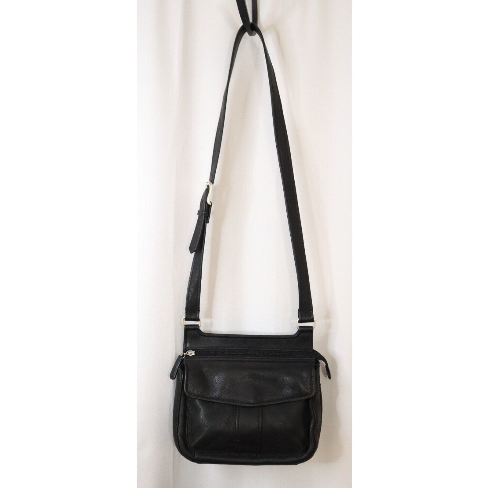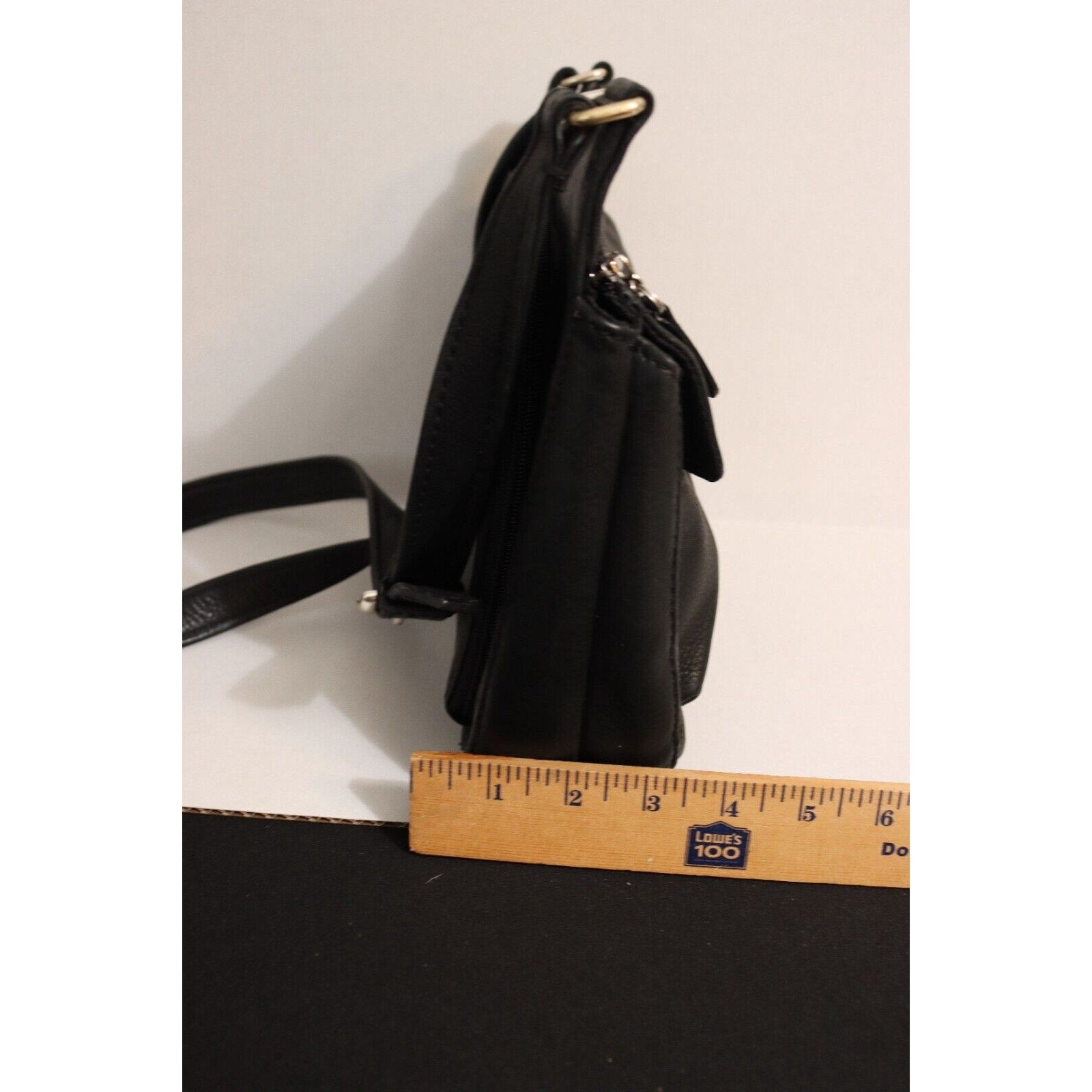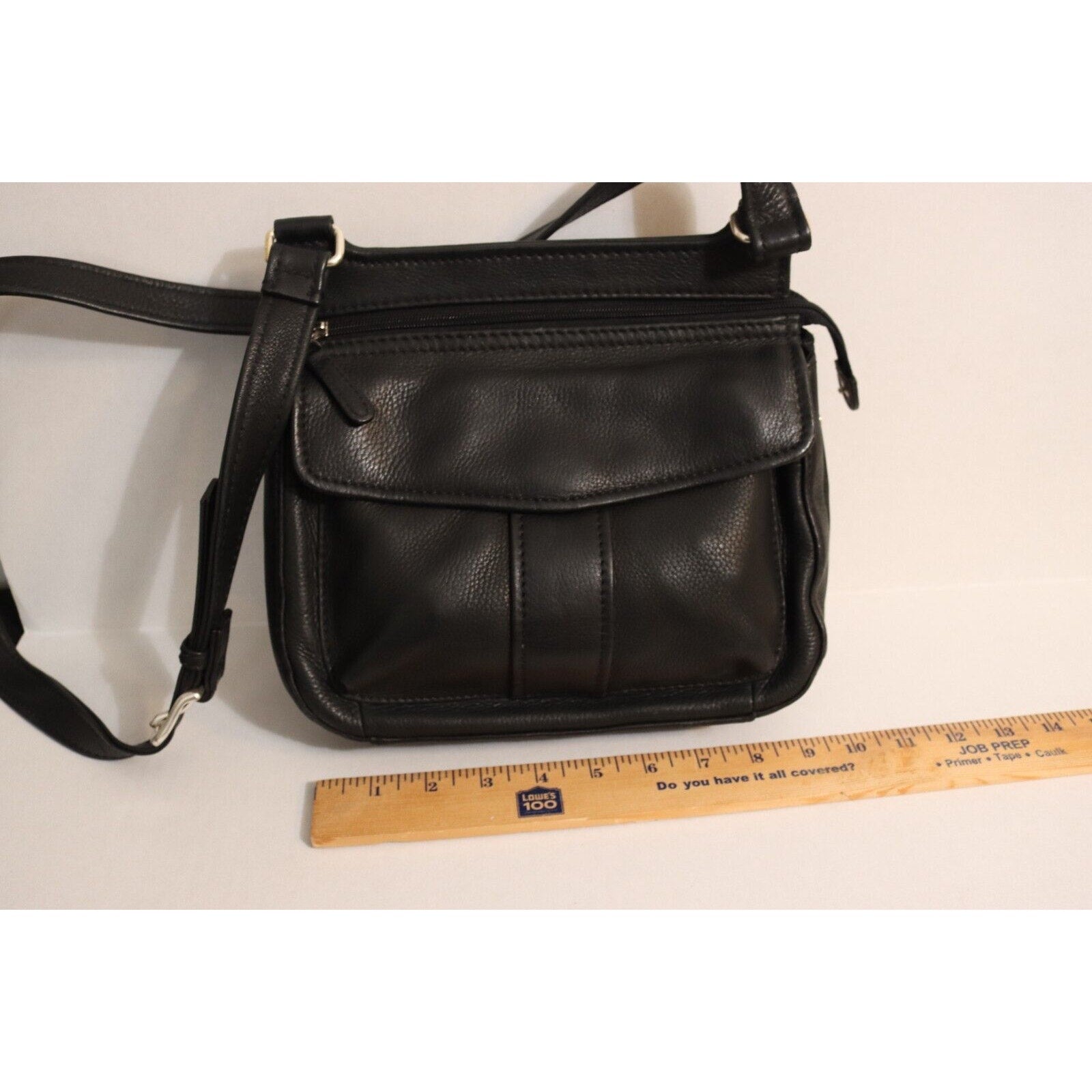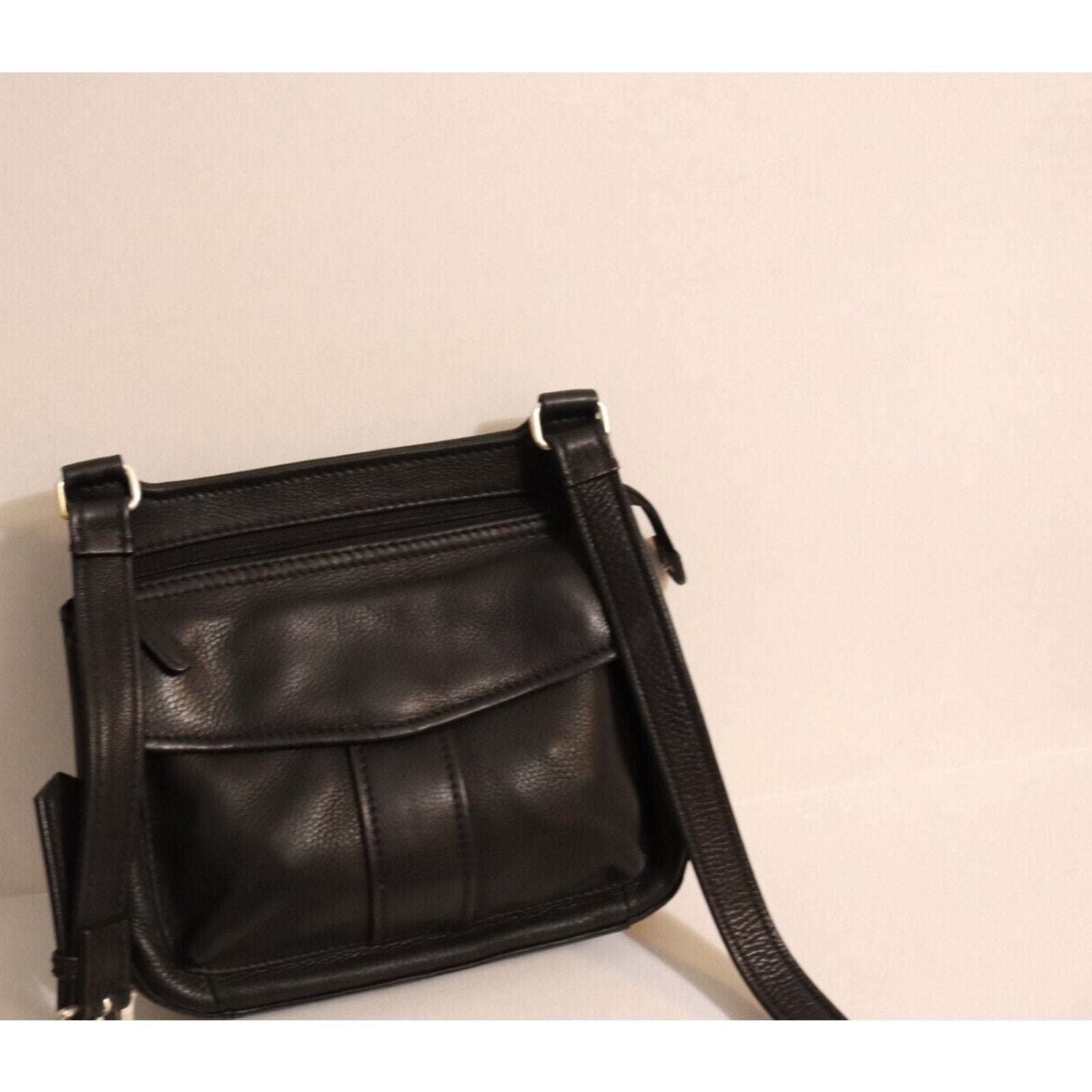 This is a Fossil black leather crossbody bag with a credit card organizer feature. It has a zip closure, silver hardware, and a medium size. The bag includes a crossbody strap with a black handle and lining. It is suitable for women and has adjustable straps. Top zipper does not open wide.