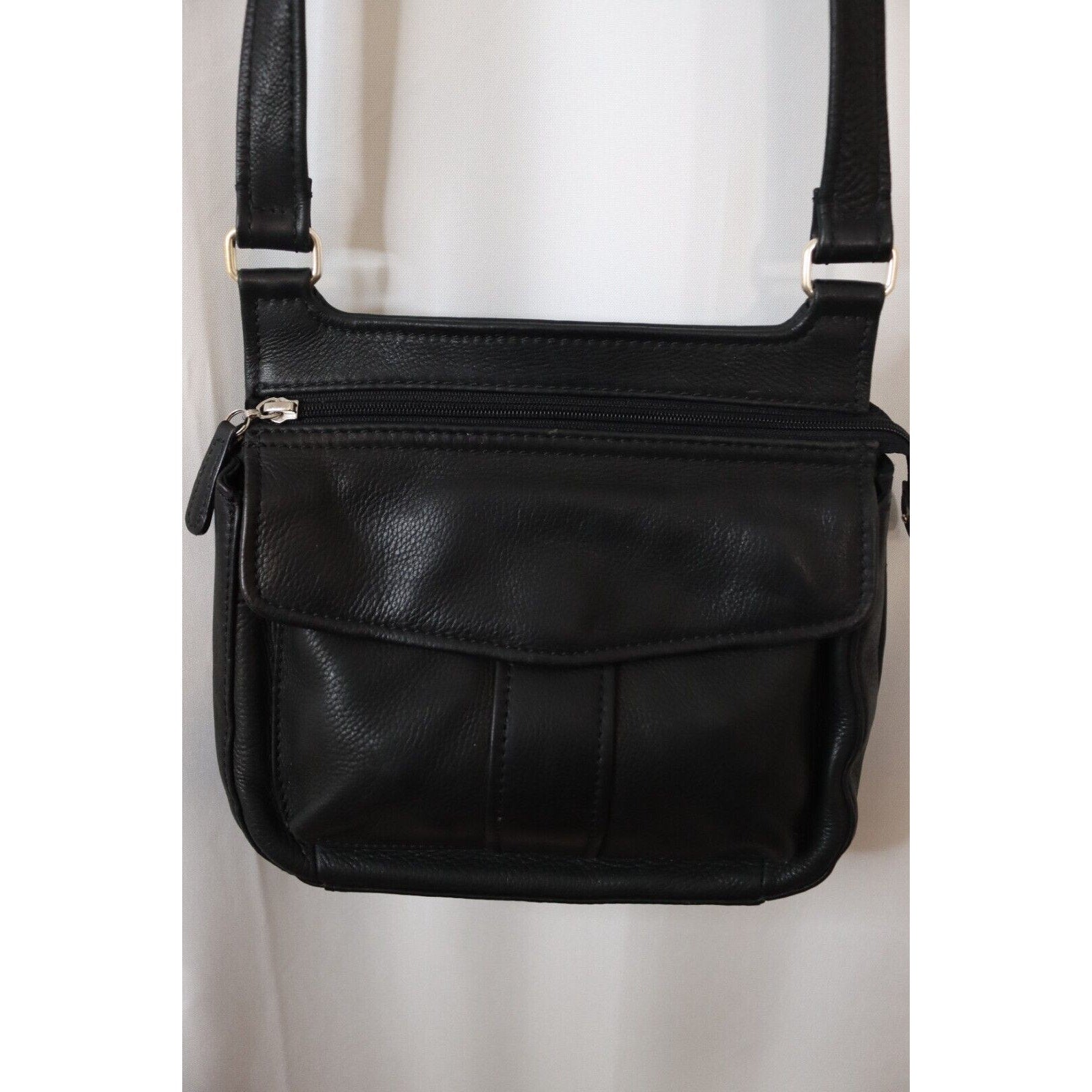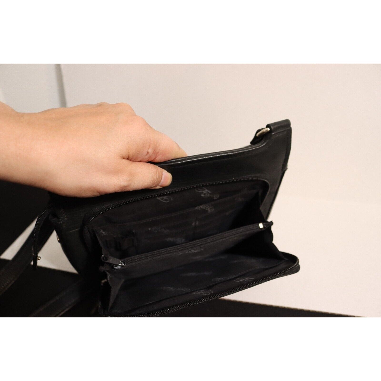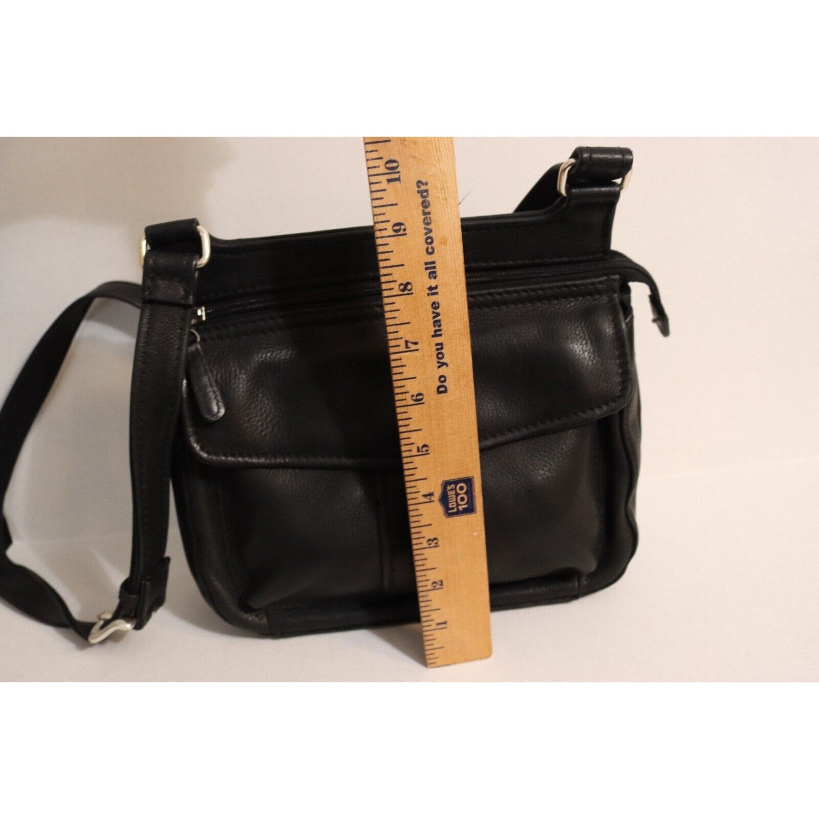 This is a Fossil black leather crossbody bag with a credit card organizer feature. It has a zip closure, silver hardware, and a medium size. The bag includes a crossbody strap with a black handle and lining. It is suitable for women and has adjustable straps. Top zipper does not open wide.