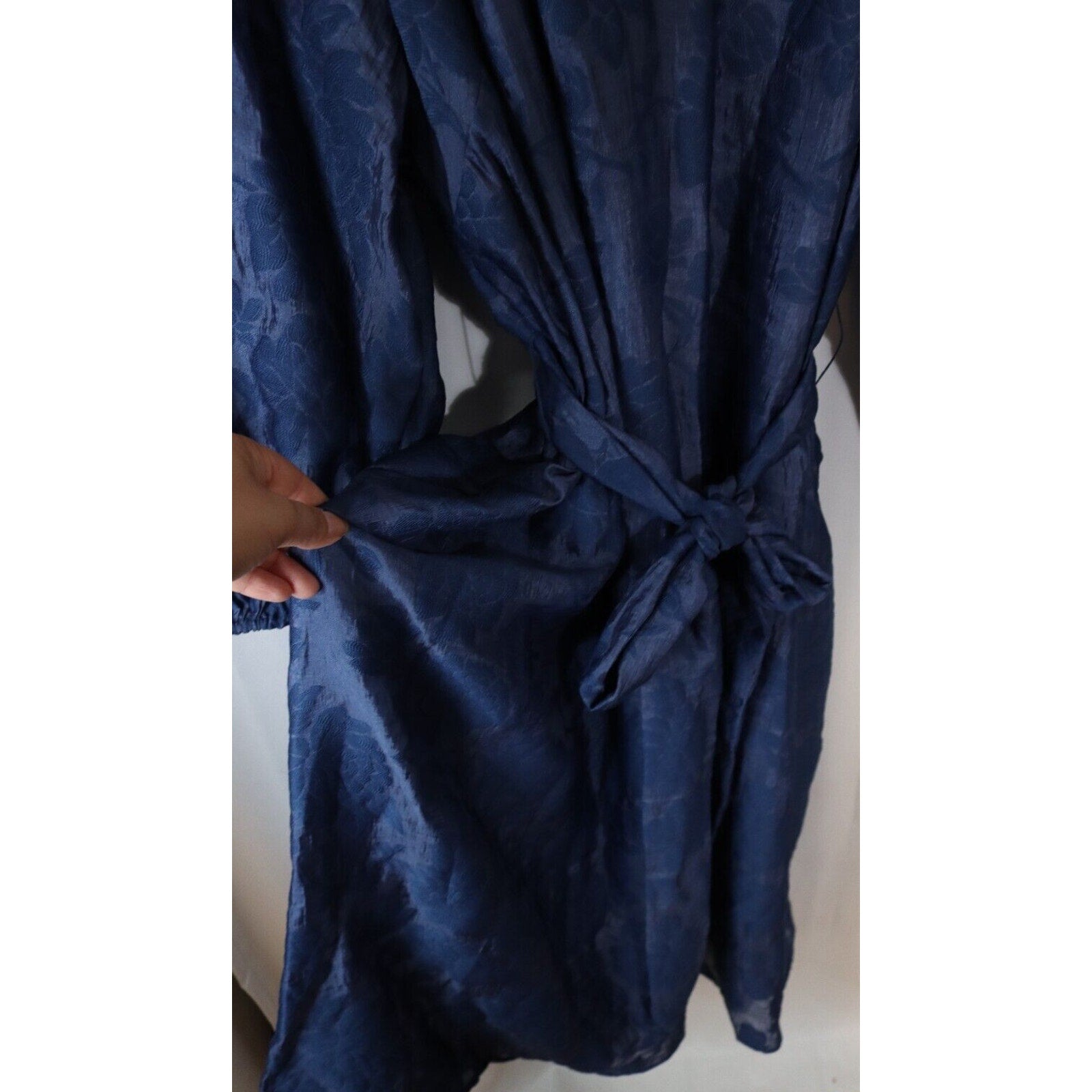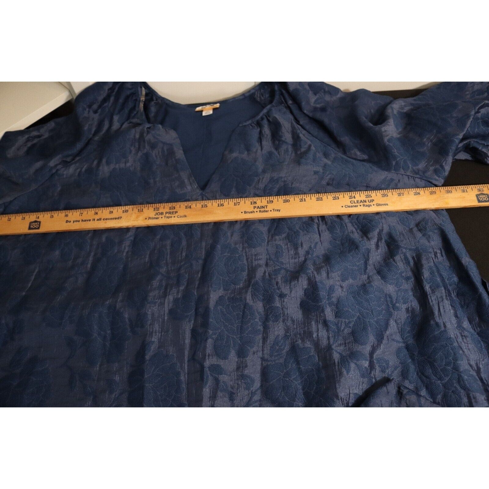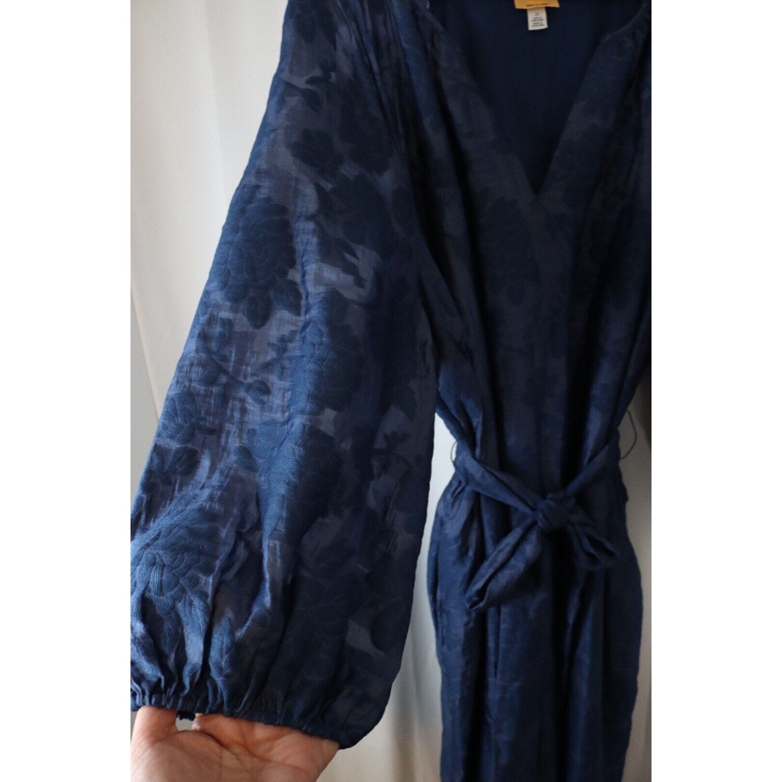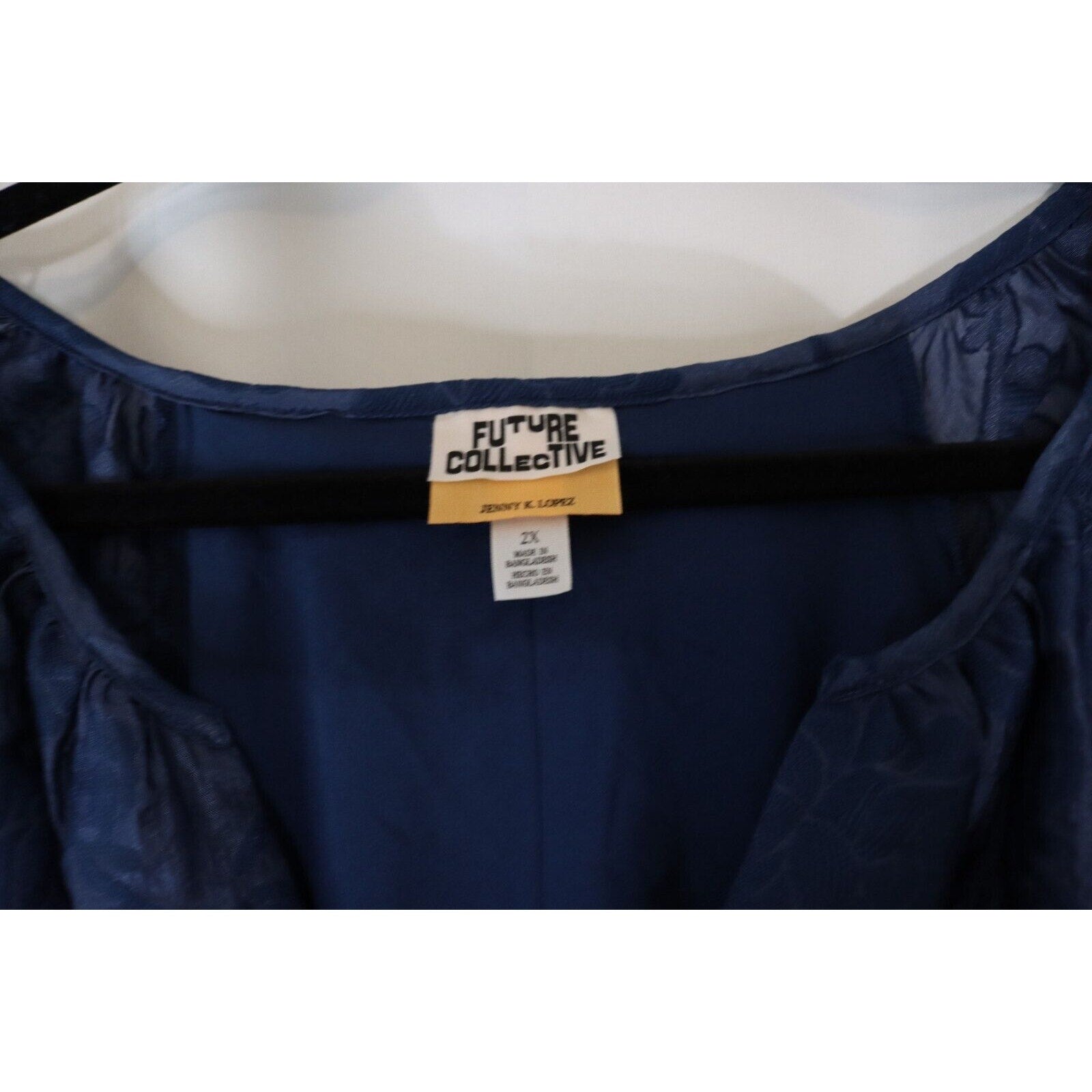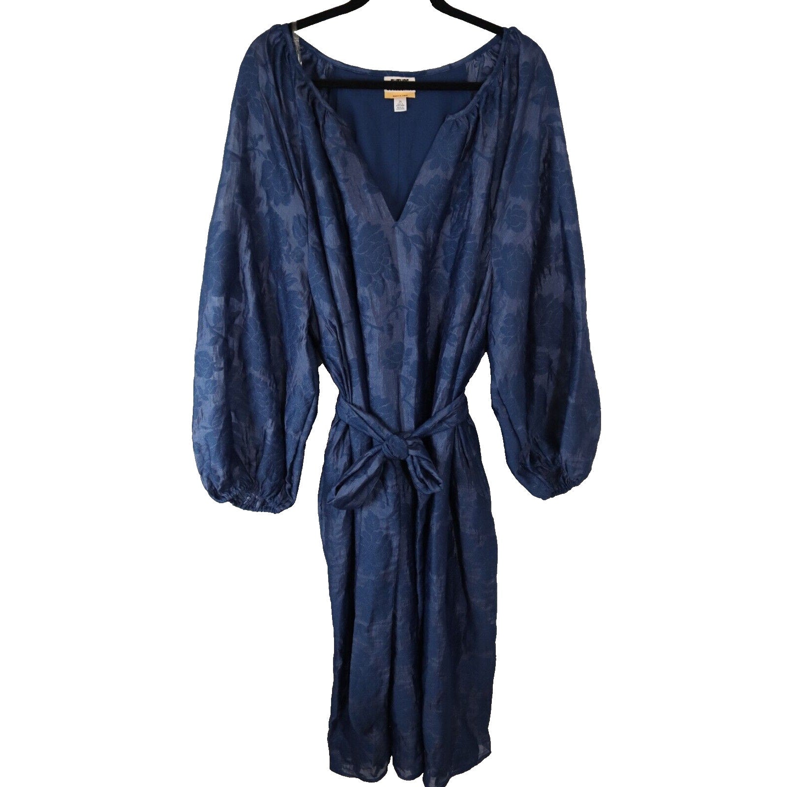 This is a stylish blue puff sleeve midi dress from Future Collective, designed by Jenny K. Lopez. It is a size 2XL, perfect for parties, casual outings, or formal events during the summer, fall, or spring seasons. The dress features a belted waist and is ideal for plus-sized women looking for a fashionable and comfortable outfit.