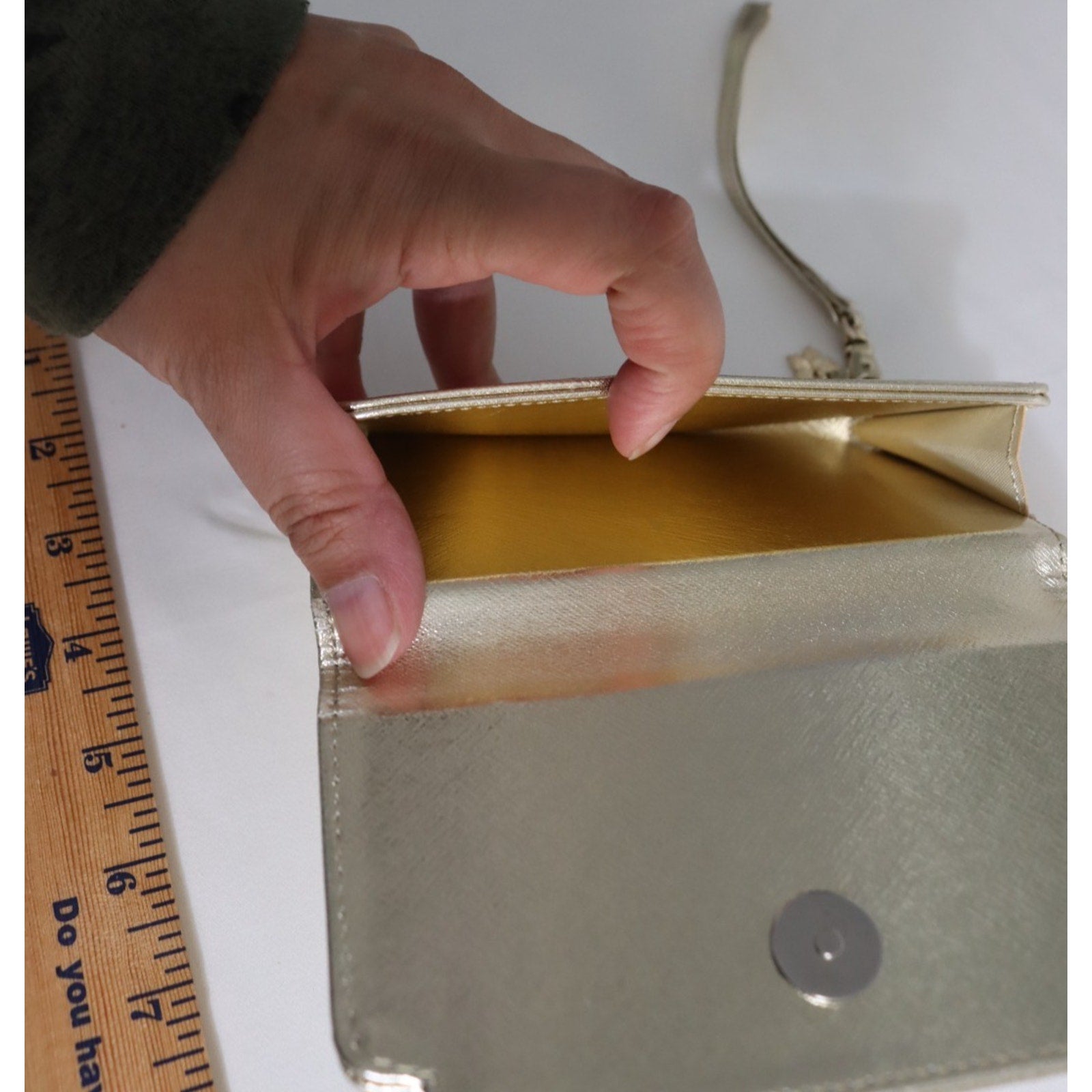 The Hanae Mori Paris Gold Wallet Wristlet is a luxurious accessory designed for women. With a solid gold color and charming accents, this one-size wallet features a wristlet style that is both elegant and practical. Perfect for carrying essentials while adding a touch of glamour, this wallet is a chic addition to any outfit.