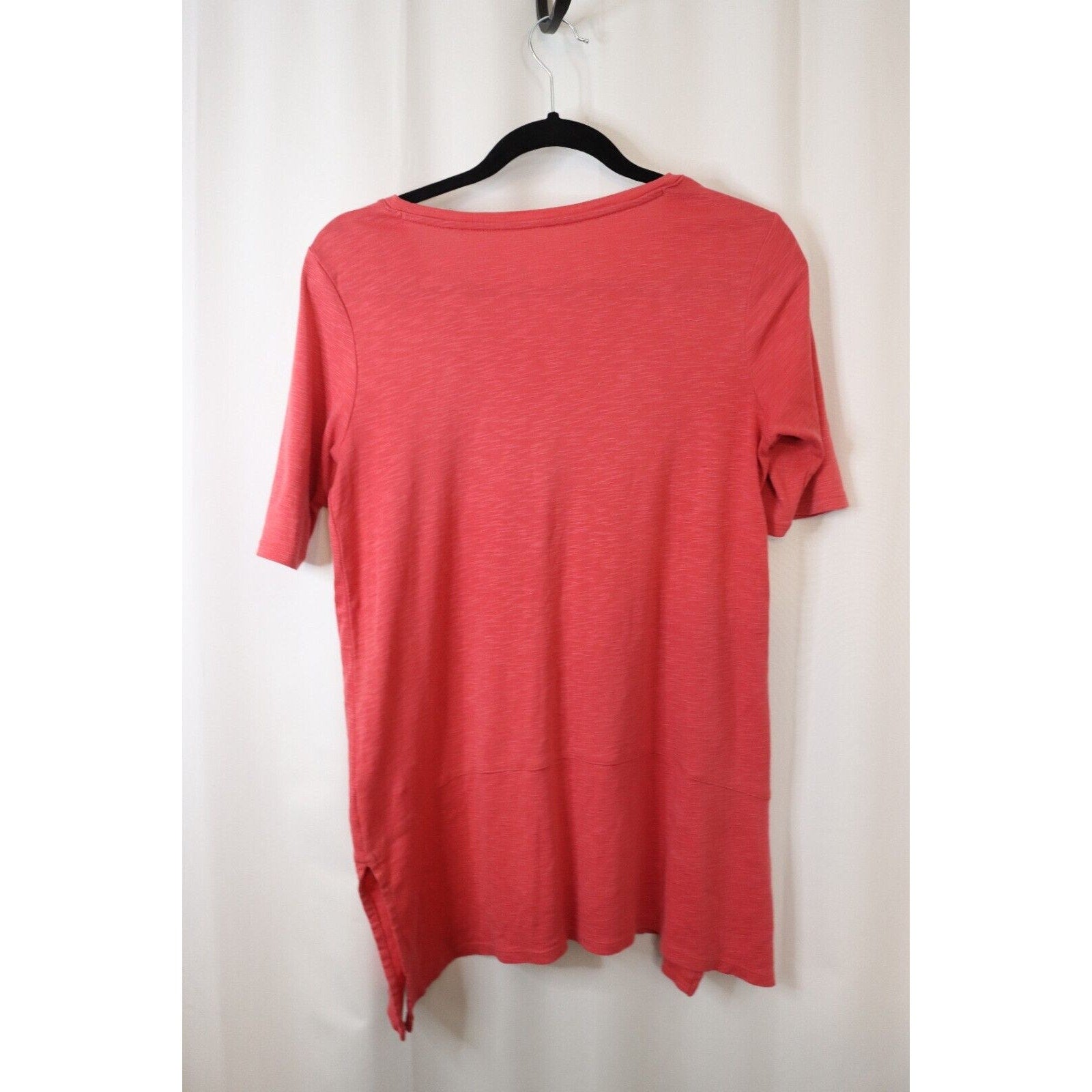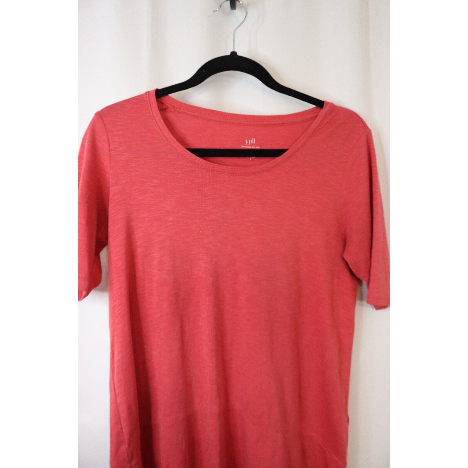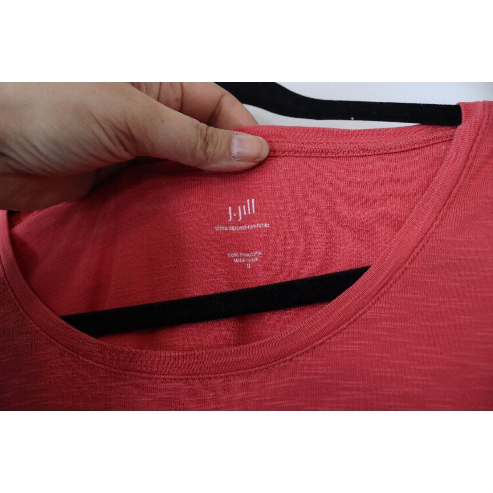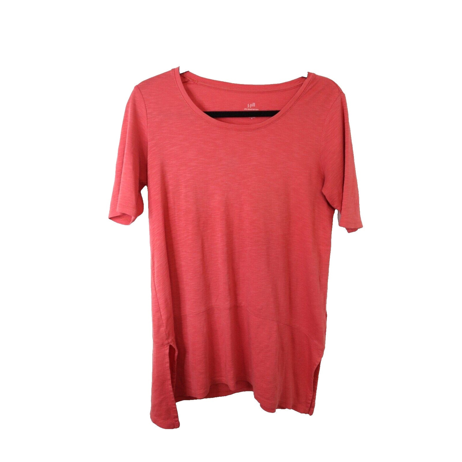 This is a J. Jill Pima Cotton Tunic in size Small. It features a round neck, pullover closure, and a solid pink color. Made of 100% cotton, this tunic has a dipped hem and falls under the categories of tops and women's clothing. The style is classic with a touch of elegance, suitable for various occasions such as travel, casual outings, or workwear in the summer, fall, and spring seasons.