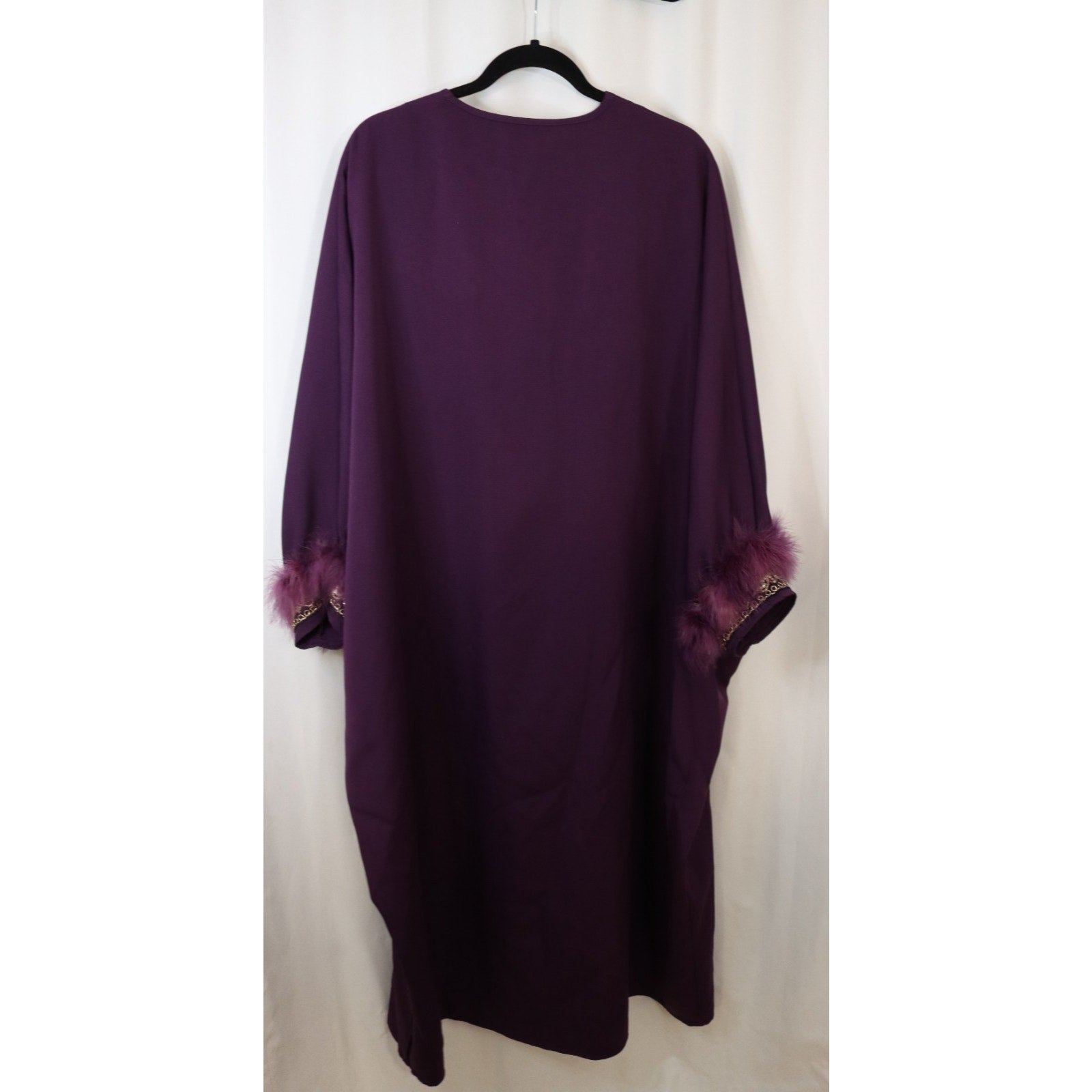 The product is a purple batwing thick kaftan abaya jilbab designed for women. The one-size-fits-all garment features short sleeves and is perfect for those looking to make a statement with their traditional Middle Eastern attire. The rich purple color adds a touch of elegance to the kaftan's style, making it a versatile piece for various occasions.