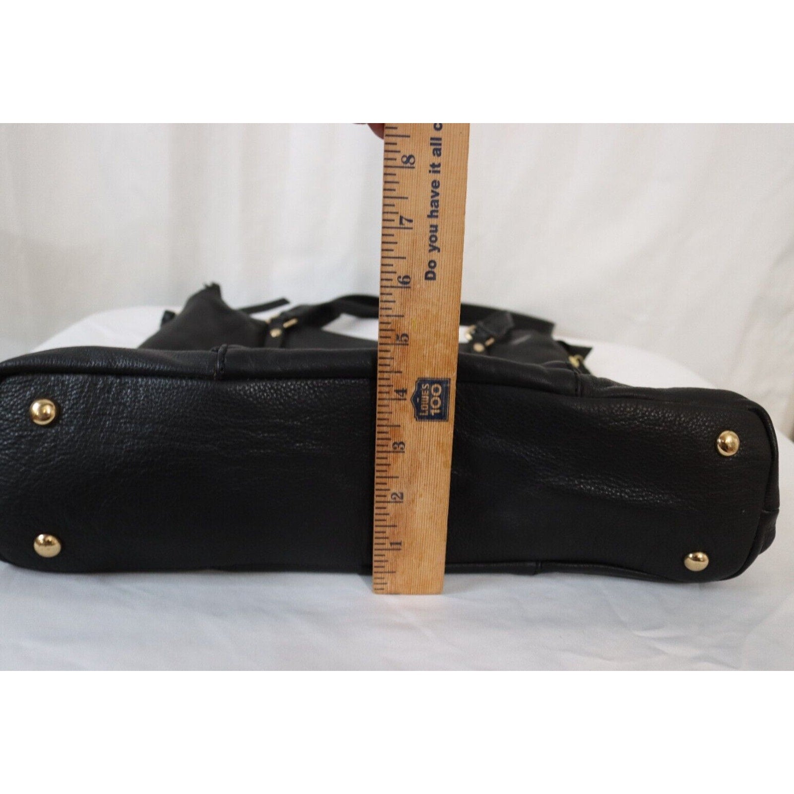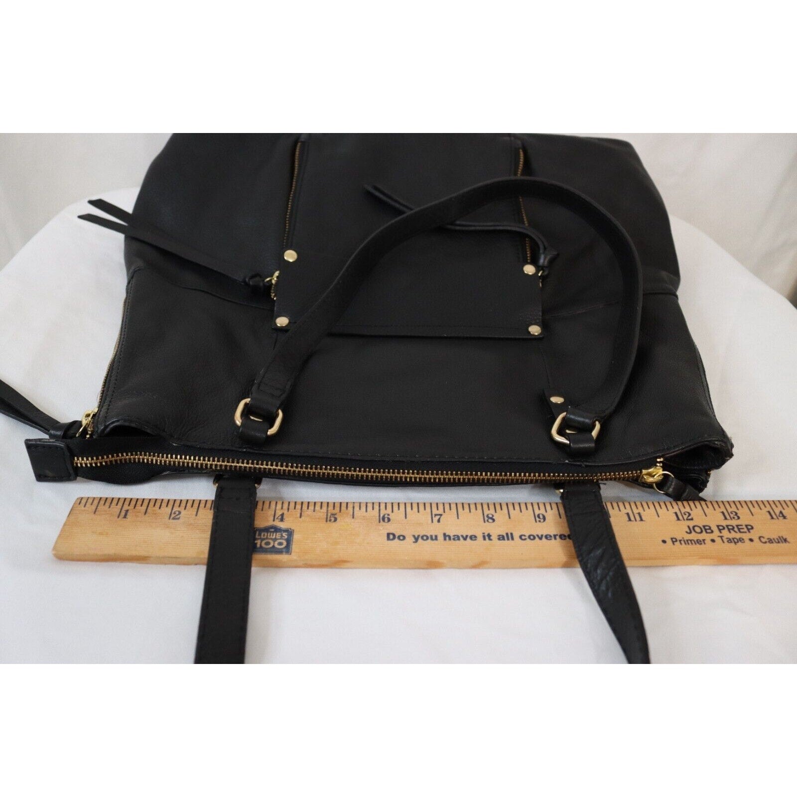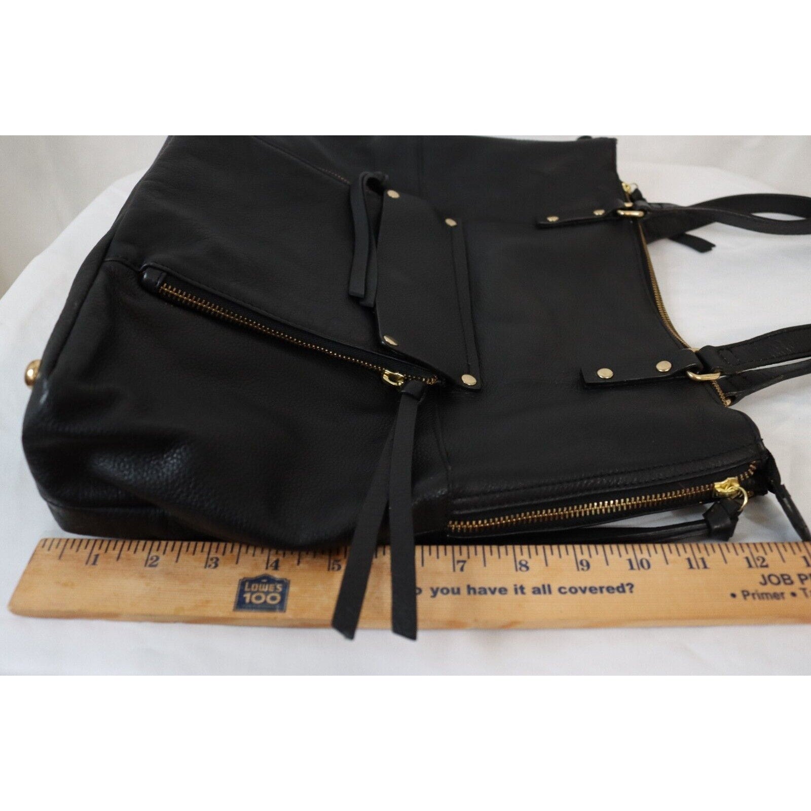 This is a Kooba Black Soft Leather Tote Satchel Bag with Double Handles, a Zip closure, and Gold hardware. It features a Tassel accent, Multicolor lining, and multiple pockets. The bag is large in size and has a Solid pattern. Made of leather, it also has Zipper accents and stands on feet. Ideal for Women, this stylish accessory is a versatile choice for everyday use.