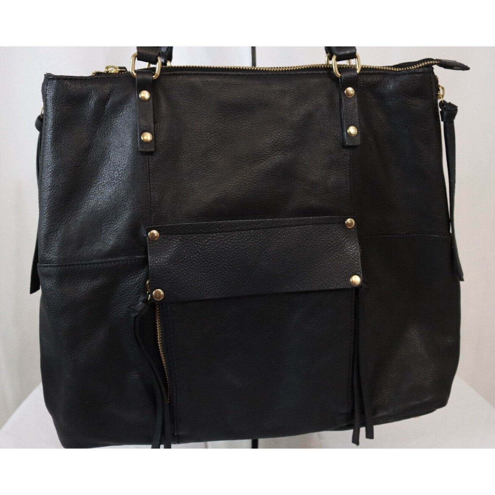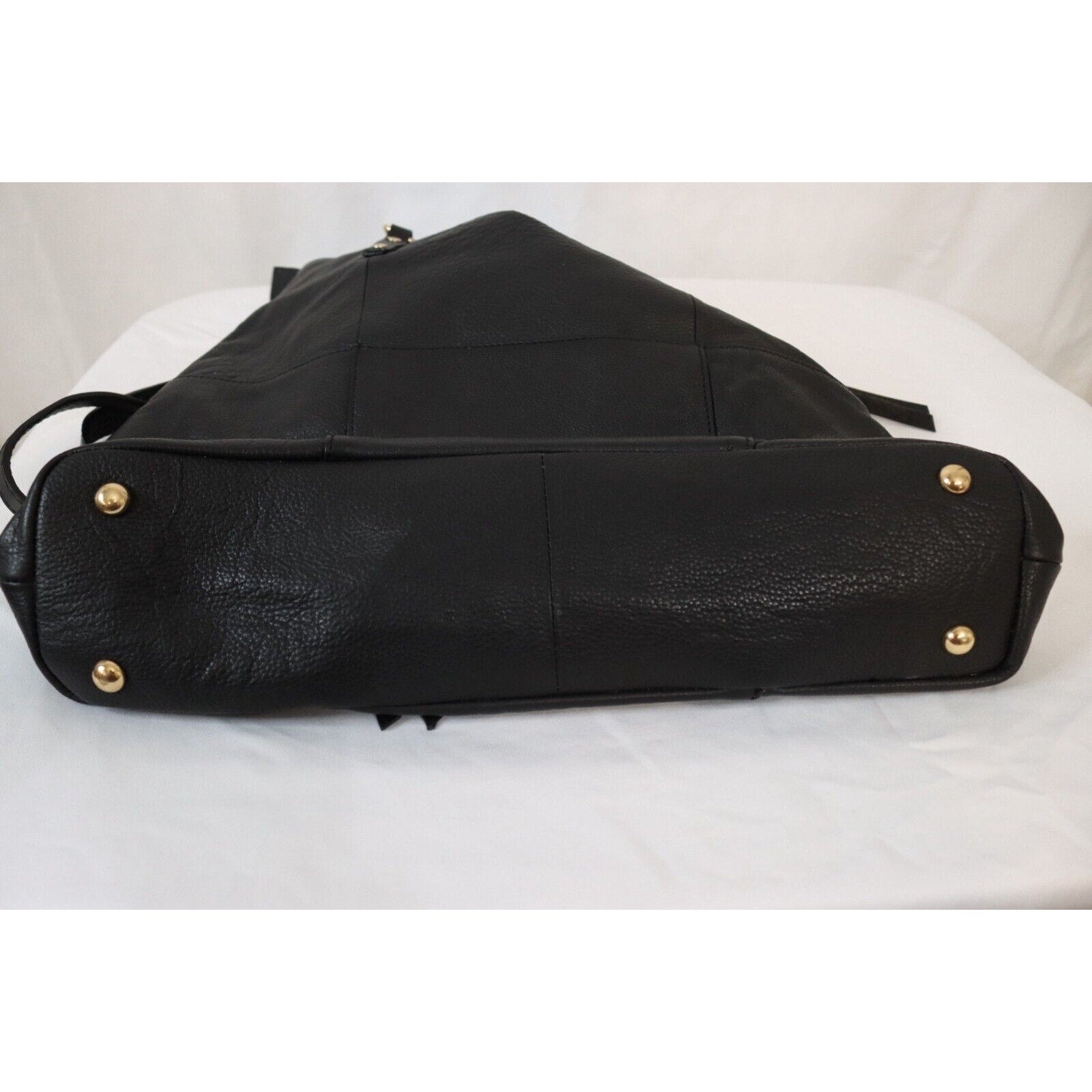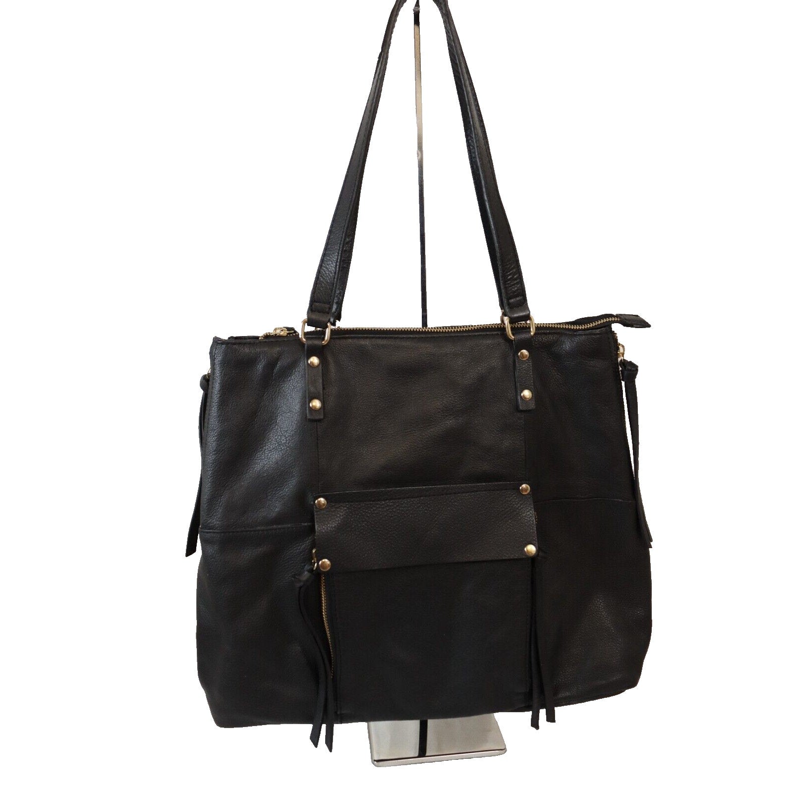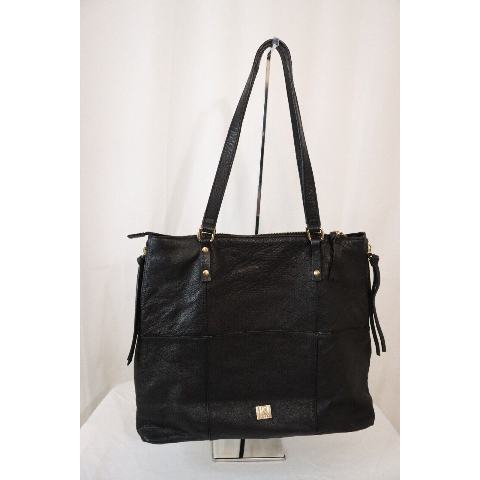 This is a Kooba Black Soft Leather Tote Satchel Bag with Double Handles, a Zip closure, and Gold hardware. It features a Tassel accent, Multicolor lining, and multiple pockets. The bag is large in size and has a Solid pattern. Made of leather, it also has Zipper accents and stands on feet. Ideal for Women, this stylish accessory is a versatile choice for everyday use.