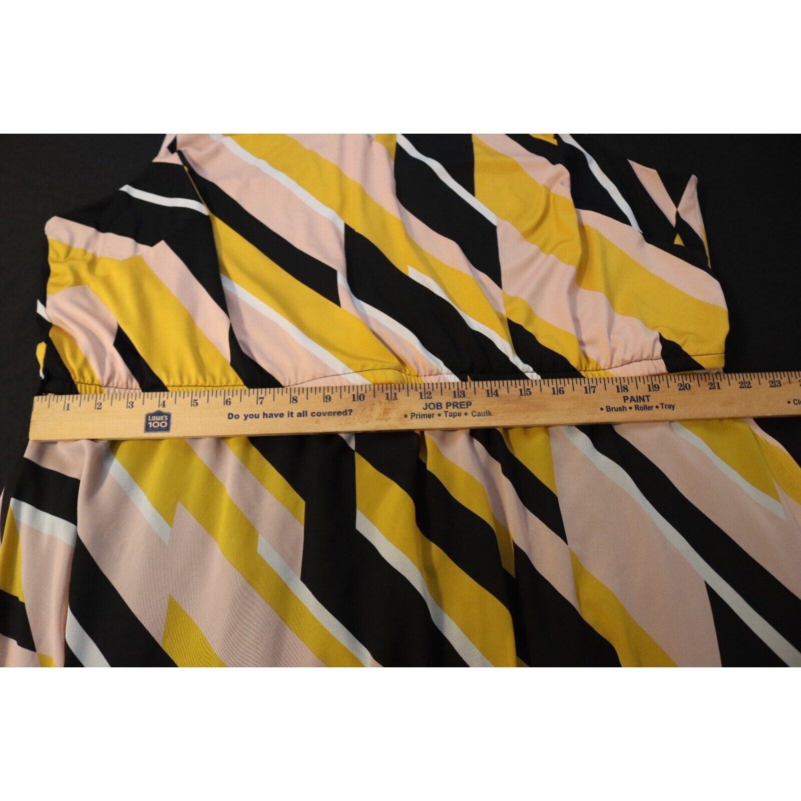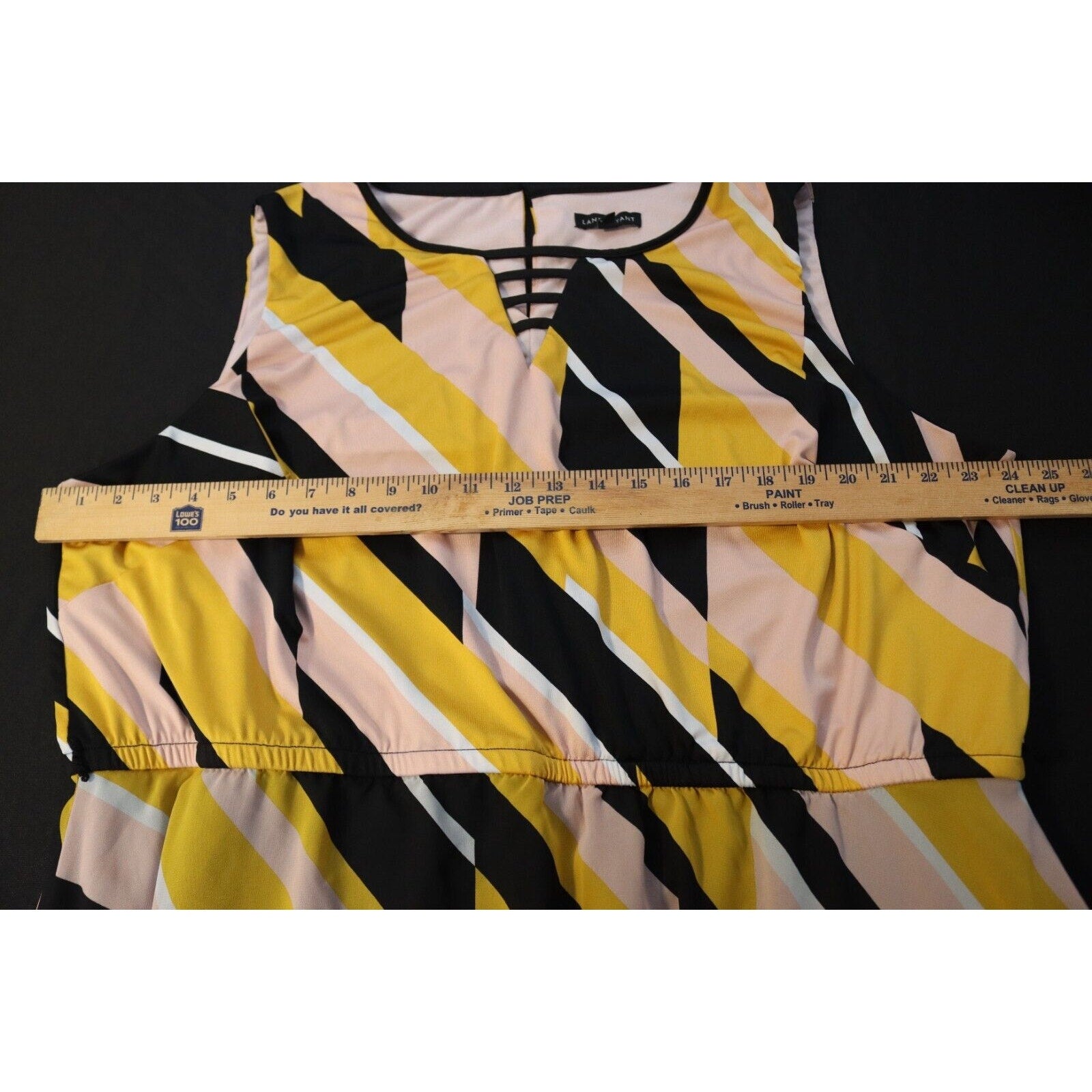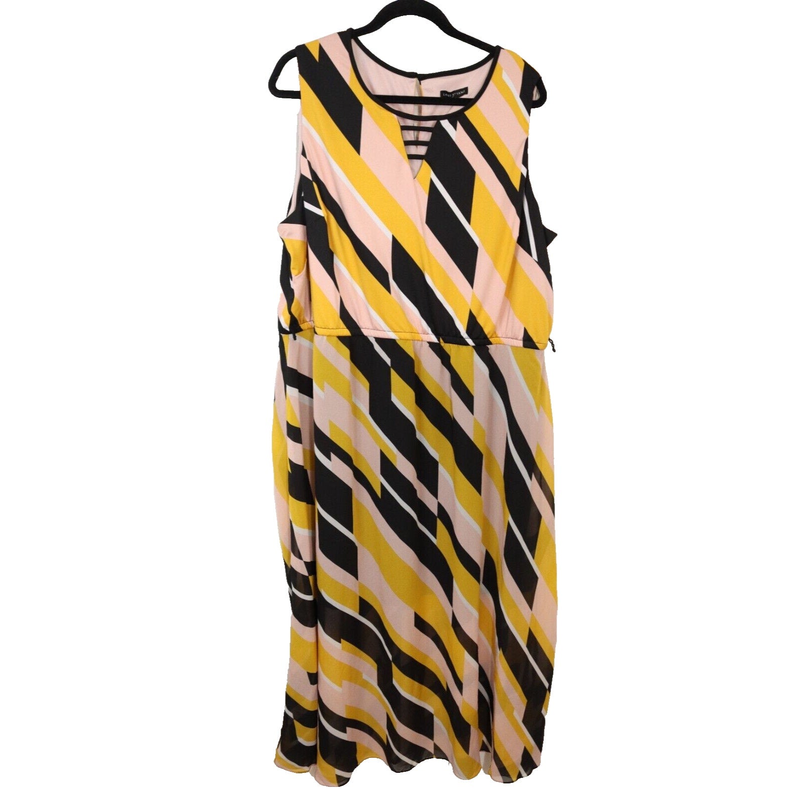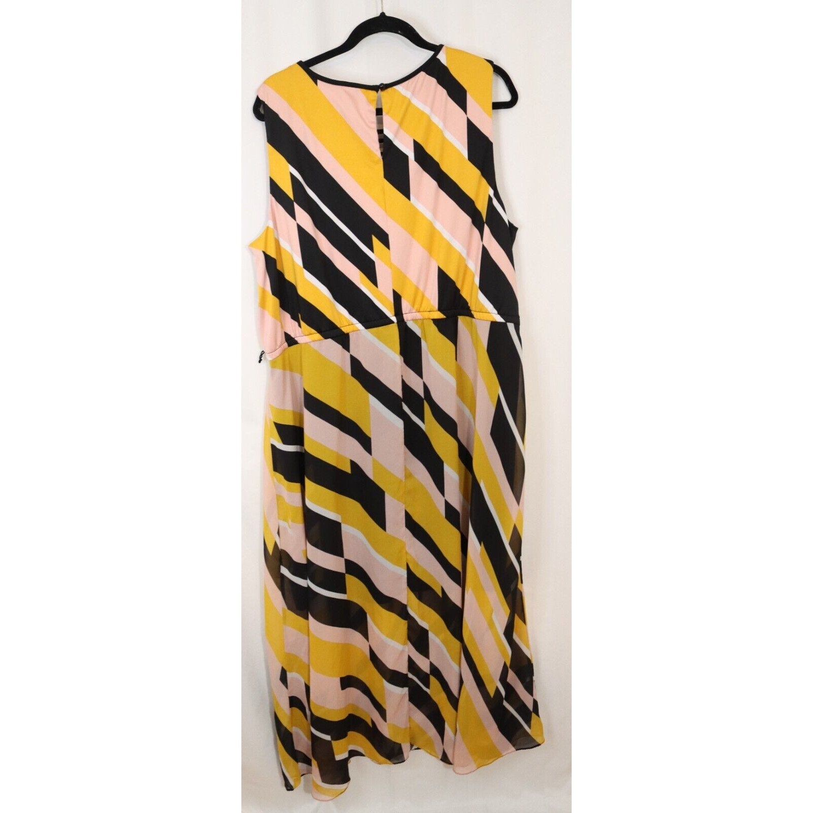 This colorful Lane Bryant dress is perfect for any summer or spring occasion. The sleeveless, pullover style features a geometric pattern in multicolor shades, made from a blend of polyester and spandex for a comfortable fit. The dress is a size 26, plus size, and has a long maxi length with a fit and flare style. The dress is perfect for travel or casual wear, and is fully lined for added comfort. Its vibrant colors and stylish design make it a great addition to any wardrobe. Whether you're going on vacation or just out for a day with friends, this Lane Bryant dress is sure to impress.