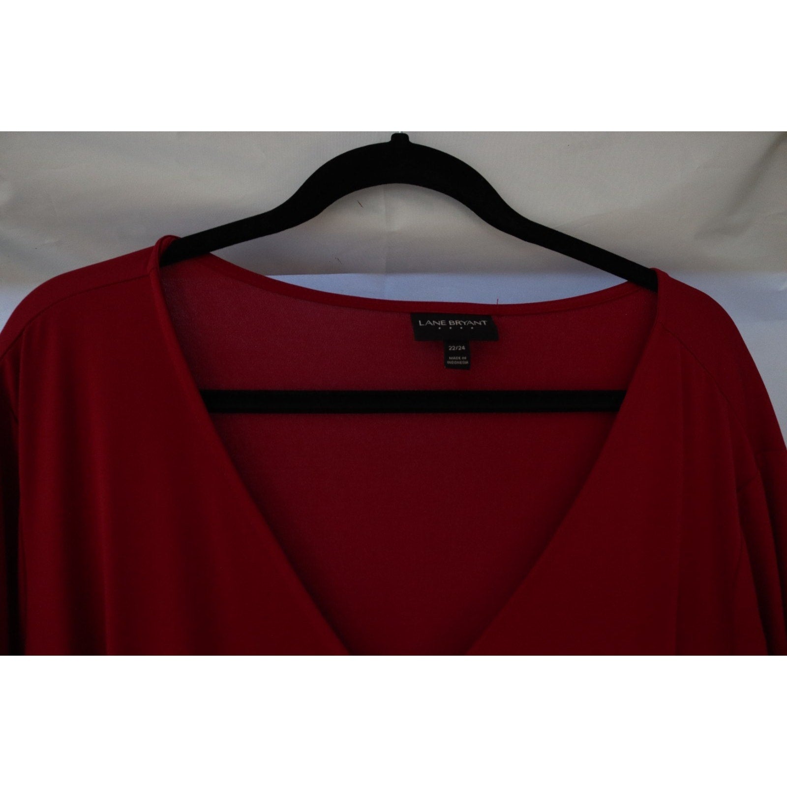 The Lane Bryant Red Faux Wrap Dress in size 22/24 is a stylish and versatile piece perfect for a party or cocktail occasion. This long sleeve dress features a flattering V-neckline and a pullover closure for easy wear. Made from a comfortable polyester and spandex blend, this midi-length dress has a solid red color and a classic wrap style that is both trendy and timeless. The stretch material ensures a comfortable and flattering fit, making it a great choice for summer, fall, or spring events.