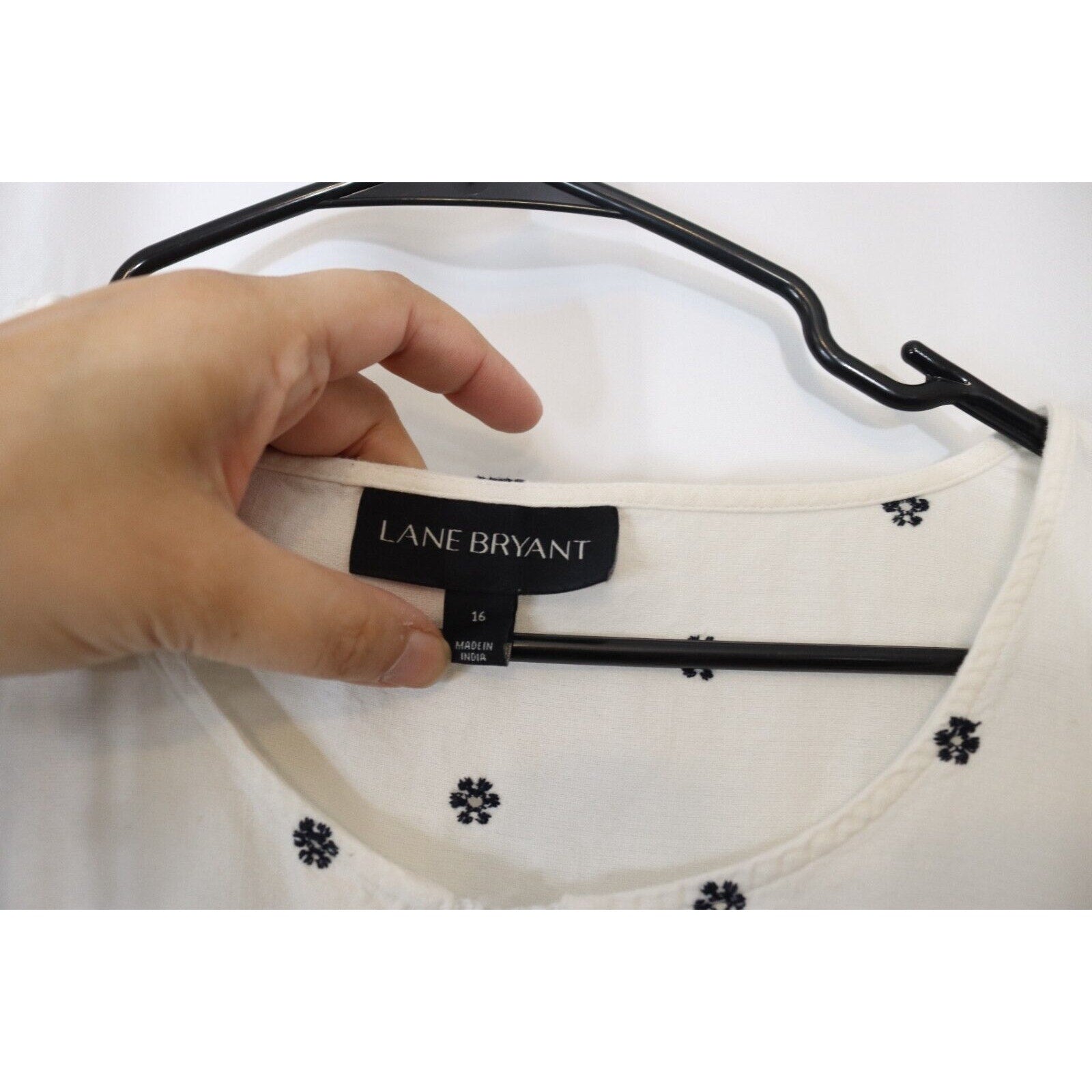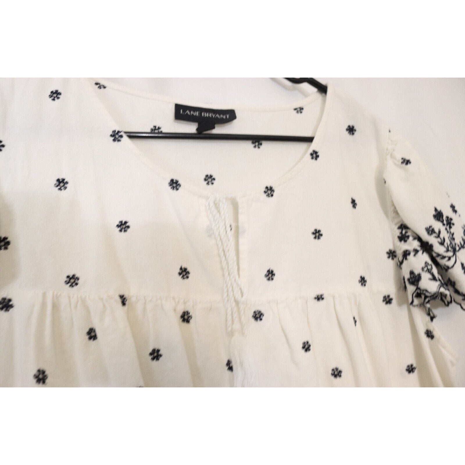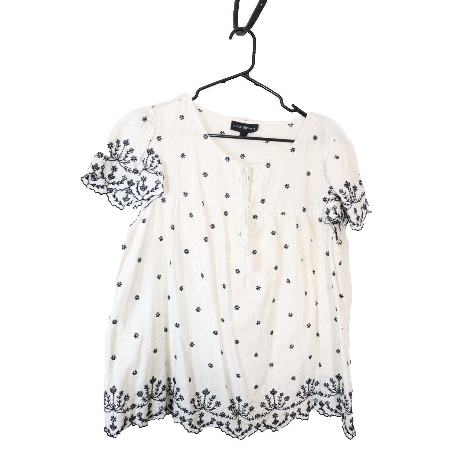 This Lane Bryant blouse is a versatile addition to any wardrobe. The white and black floral pattern is perfect for any occasion. The short sleeves and pullover closure make it easy to wear, while the embroidered accents add a touch of elegance. Made of a blend of polyester, linen, and cotton, it is comfortable and breathable. This blouse is perfect for any woman looking for a basic yet stylish top.