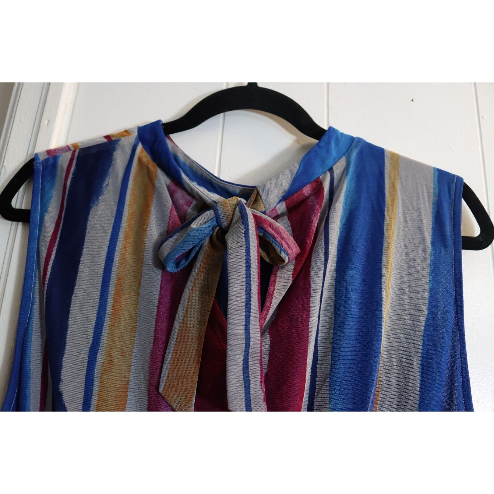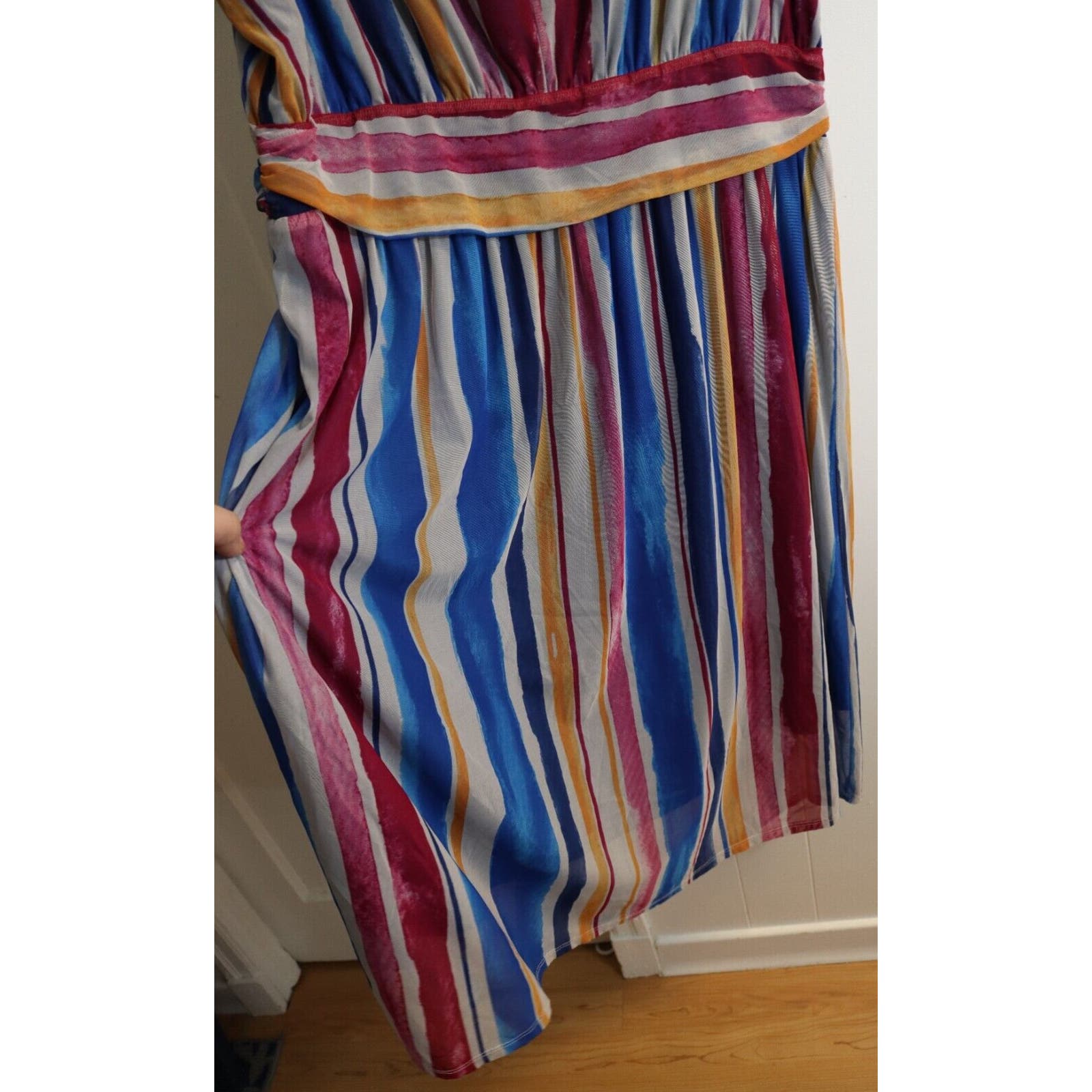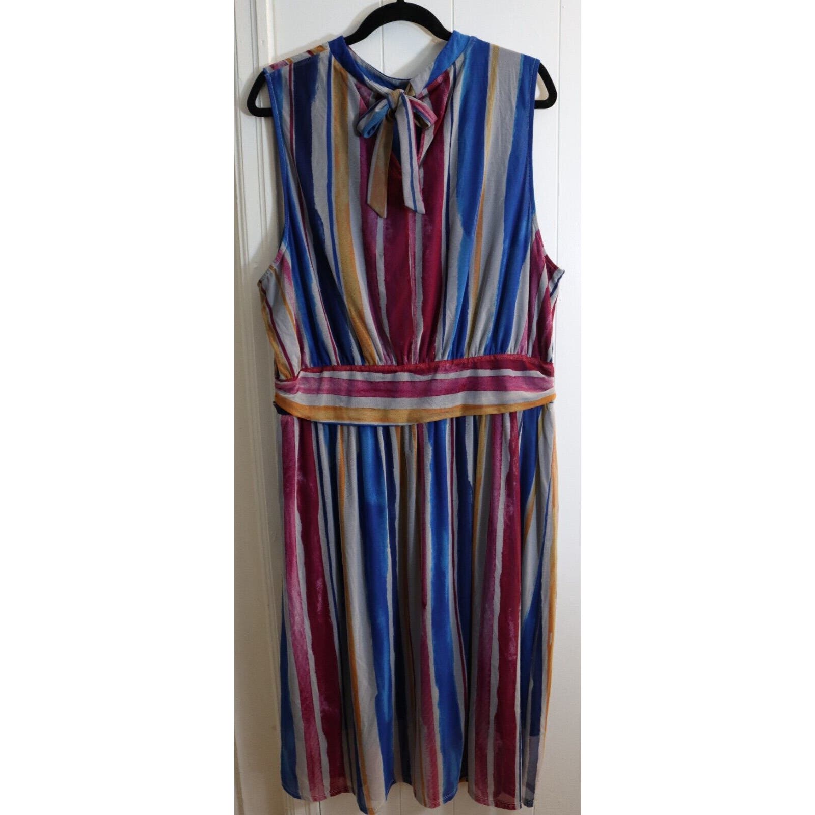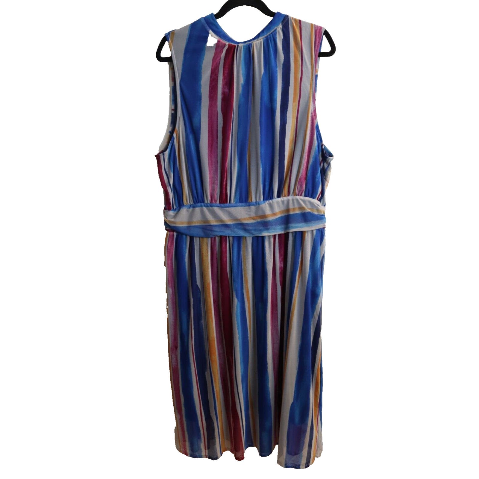 Make a stunning entrance at your next party or keep it casual in this Leota Stripe Dress. The sleeveless design add a touch of sophistication, while the fit and flare style flatters your curves. The knee-length hemline is perfect for any occasion, whether it's a party or a day out with friends. The multicolor stripes create a playful look that is perfect for summer. This dress is available in size 2X and is a must-have for any fashion-forward woman.