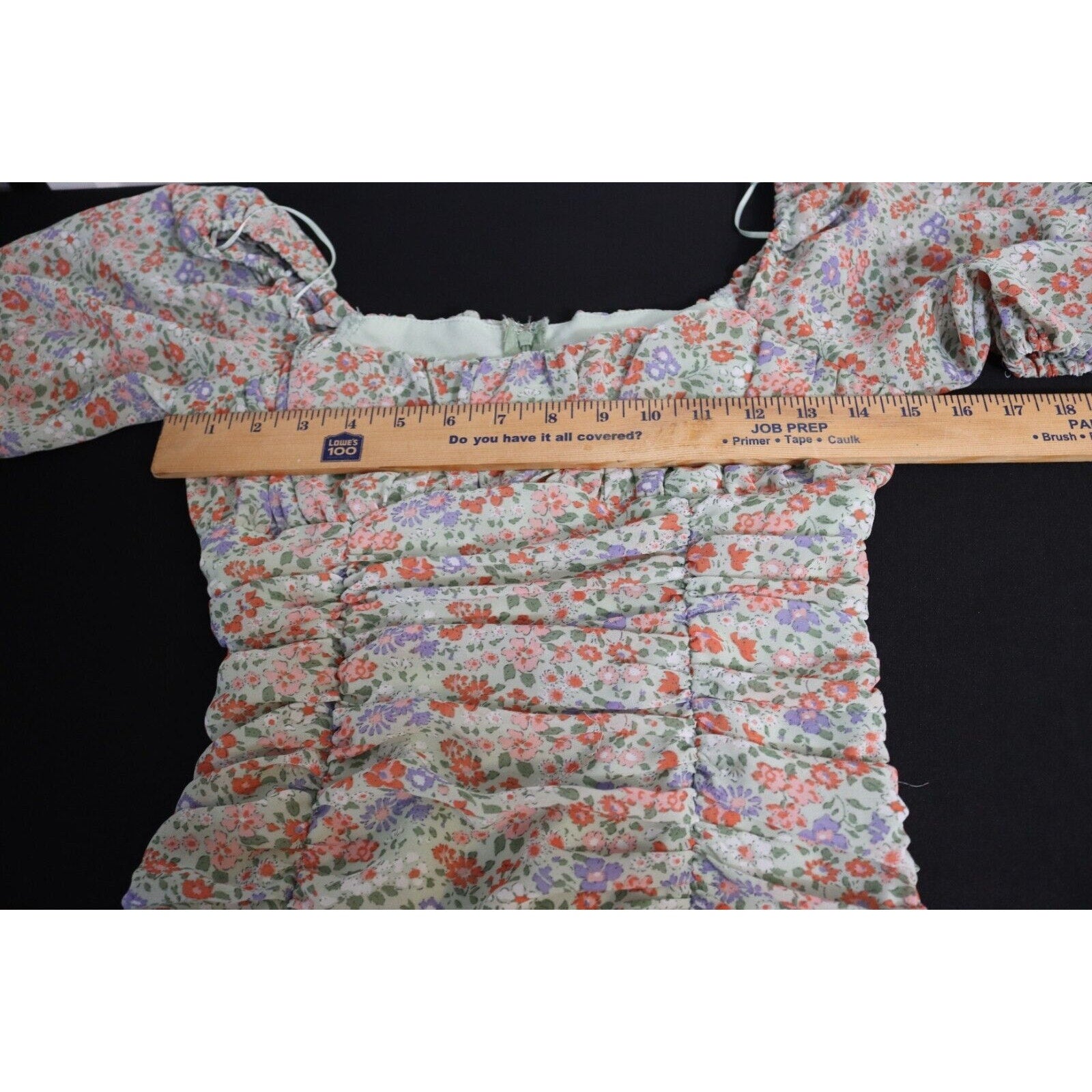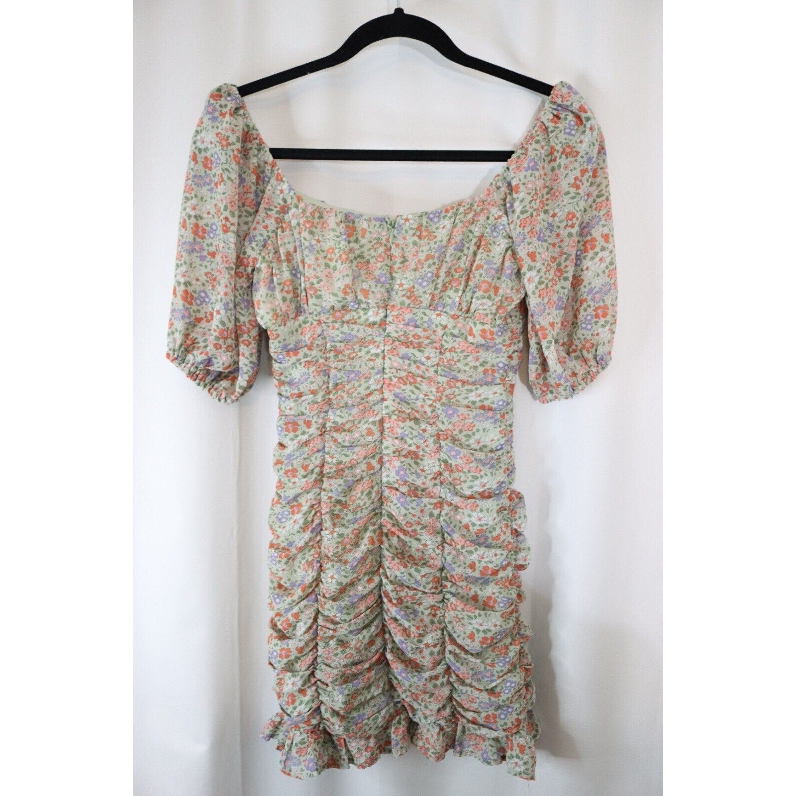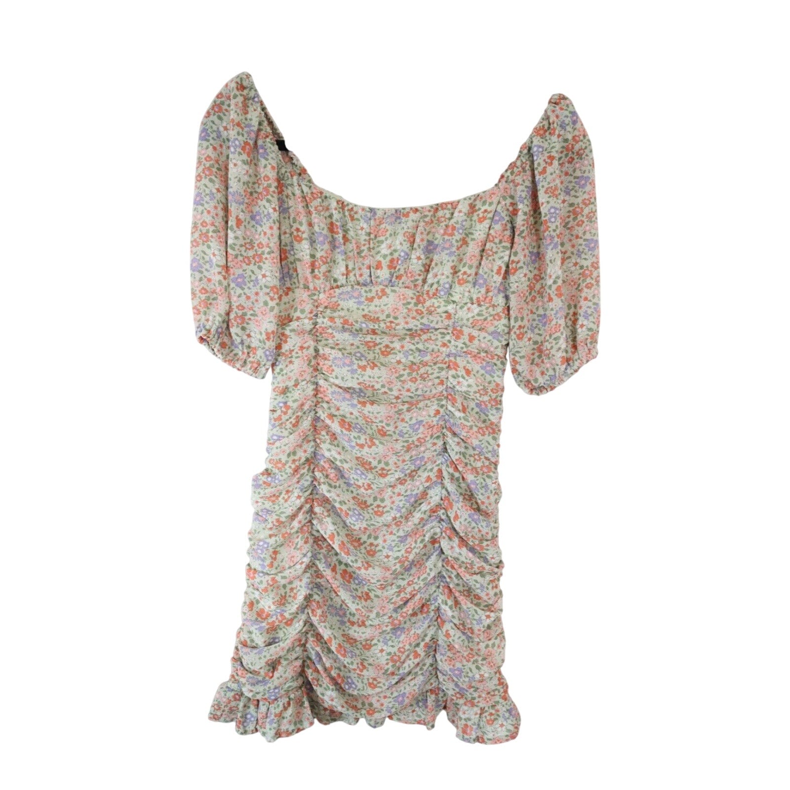 This is a stylish Lush dress with an off-the-shoulder neckline, sheer puff sleeves, and a floral pattern. The dress features ruched detailing, a zip closure, and a bodycon style. It is a short dress with half sleeves and is perfect for various occasions such as travel, parties, casual or formal events. The dress is size XS and designed for the summer and spring seasons.