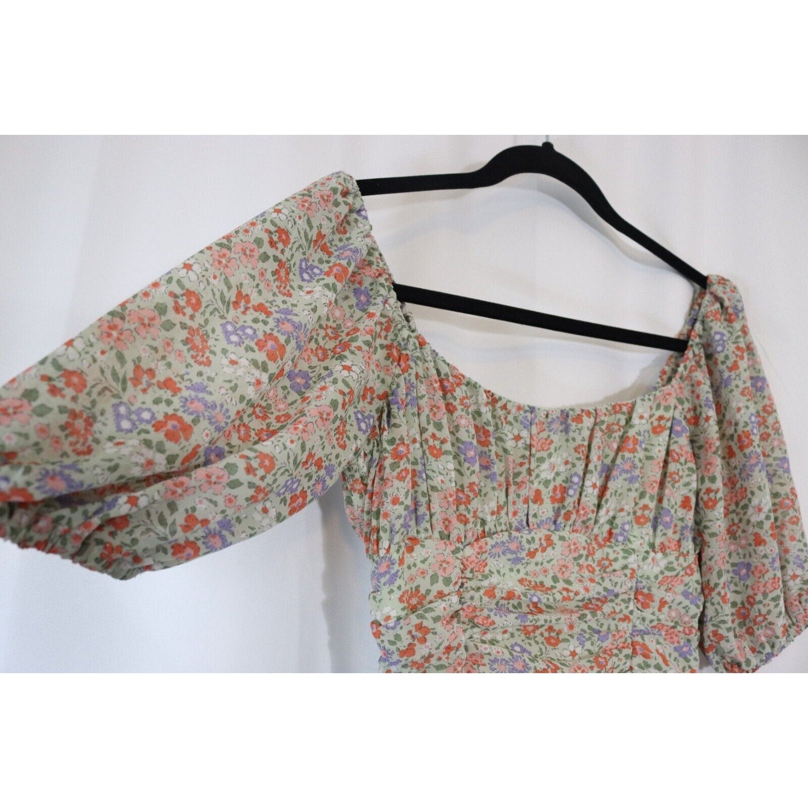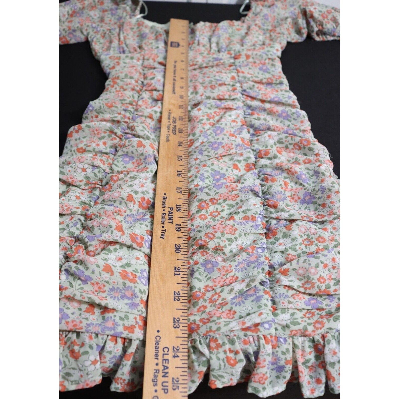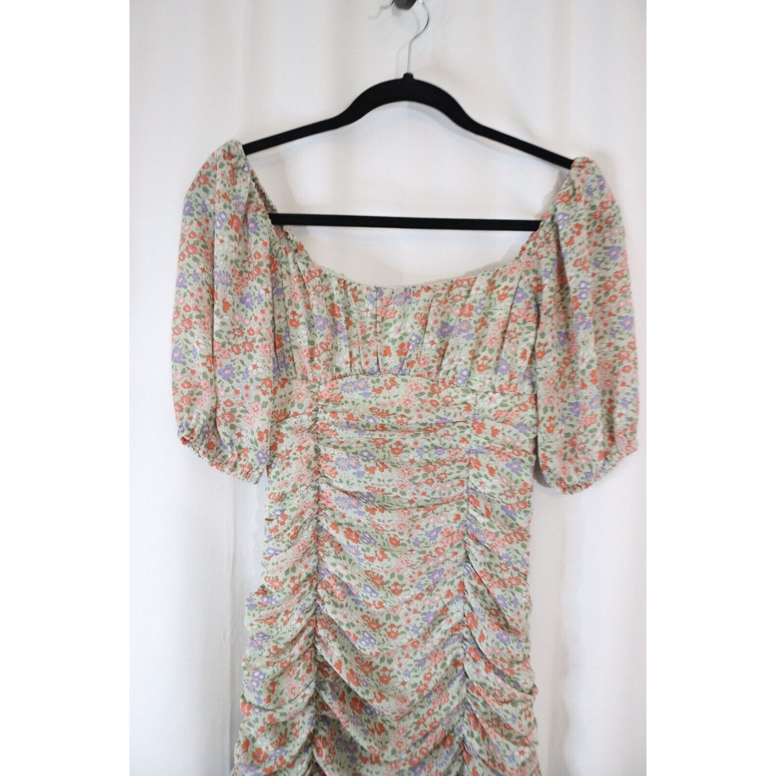 This is a stylish Lush dress with an off-the-shoulder neckline, sheer puff sleeves, and a floral pattern. The dress features ruched detailing, a zip closure, and a bodycon style. It is a short dress with half sleeves and is perfect for various occasions such as travel, parties, casual or formal events. The dress is size XS and designed for the summer and spring seasons.