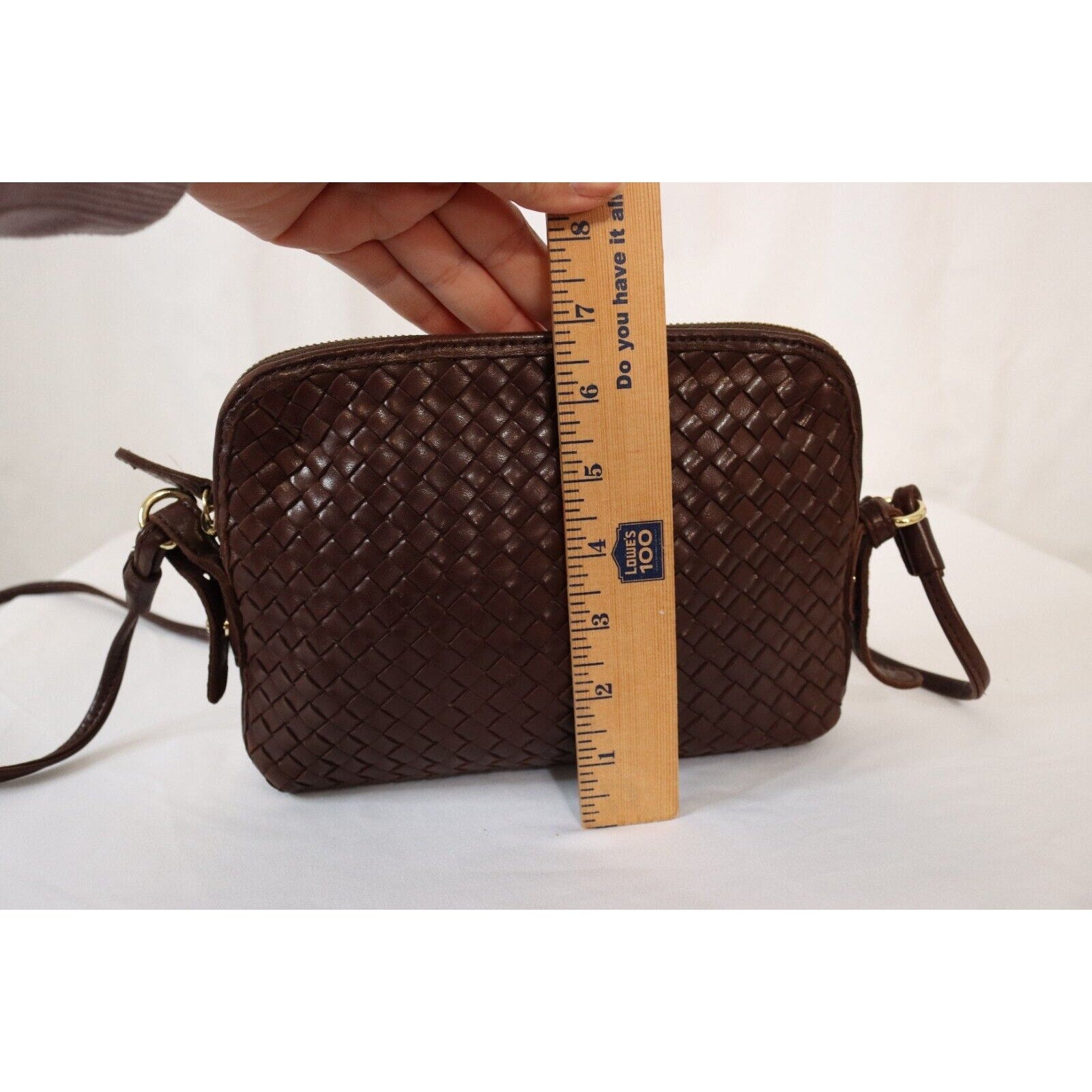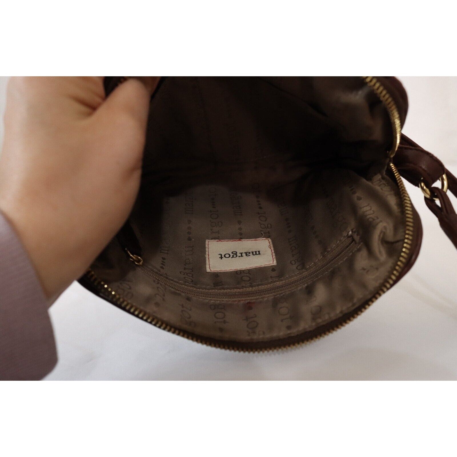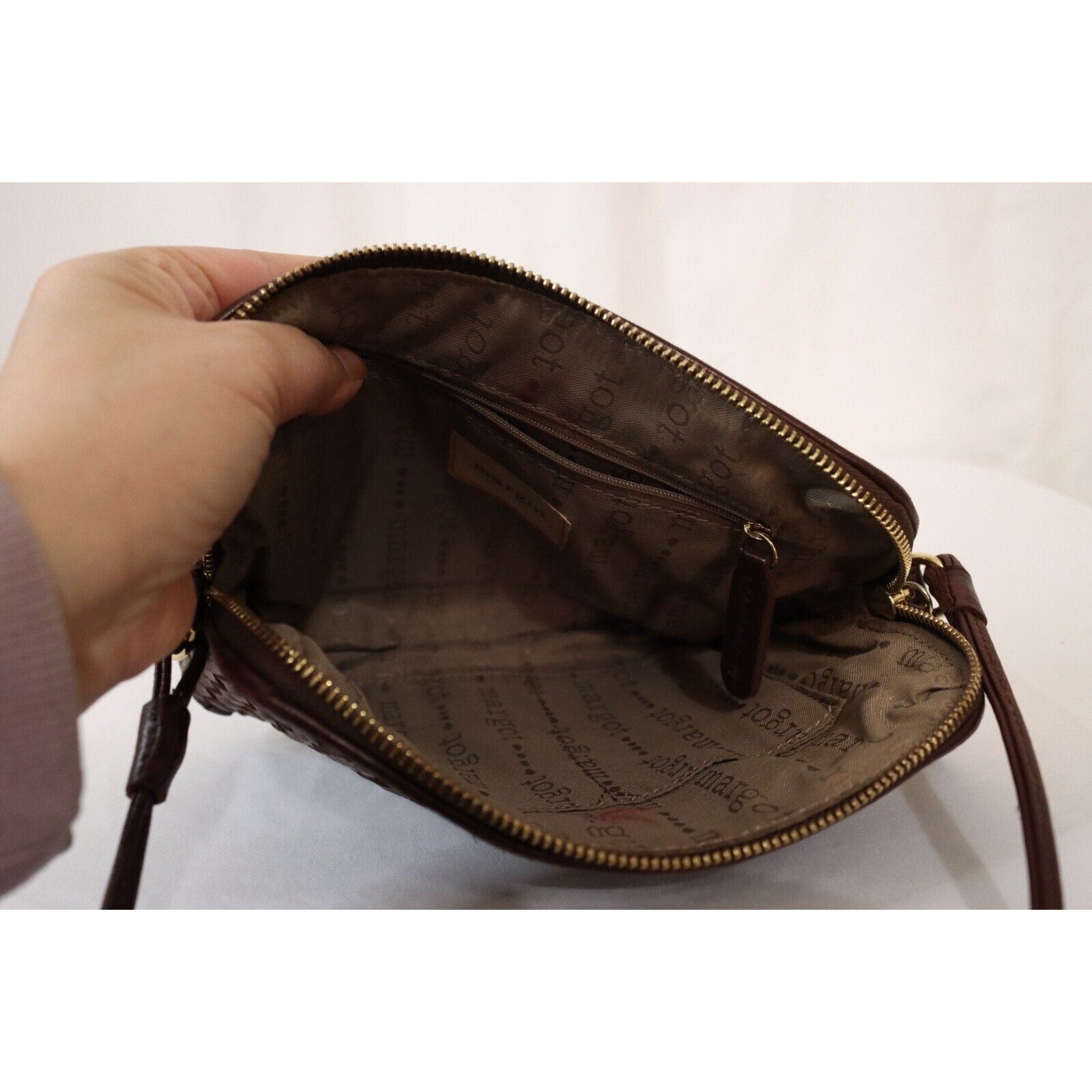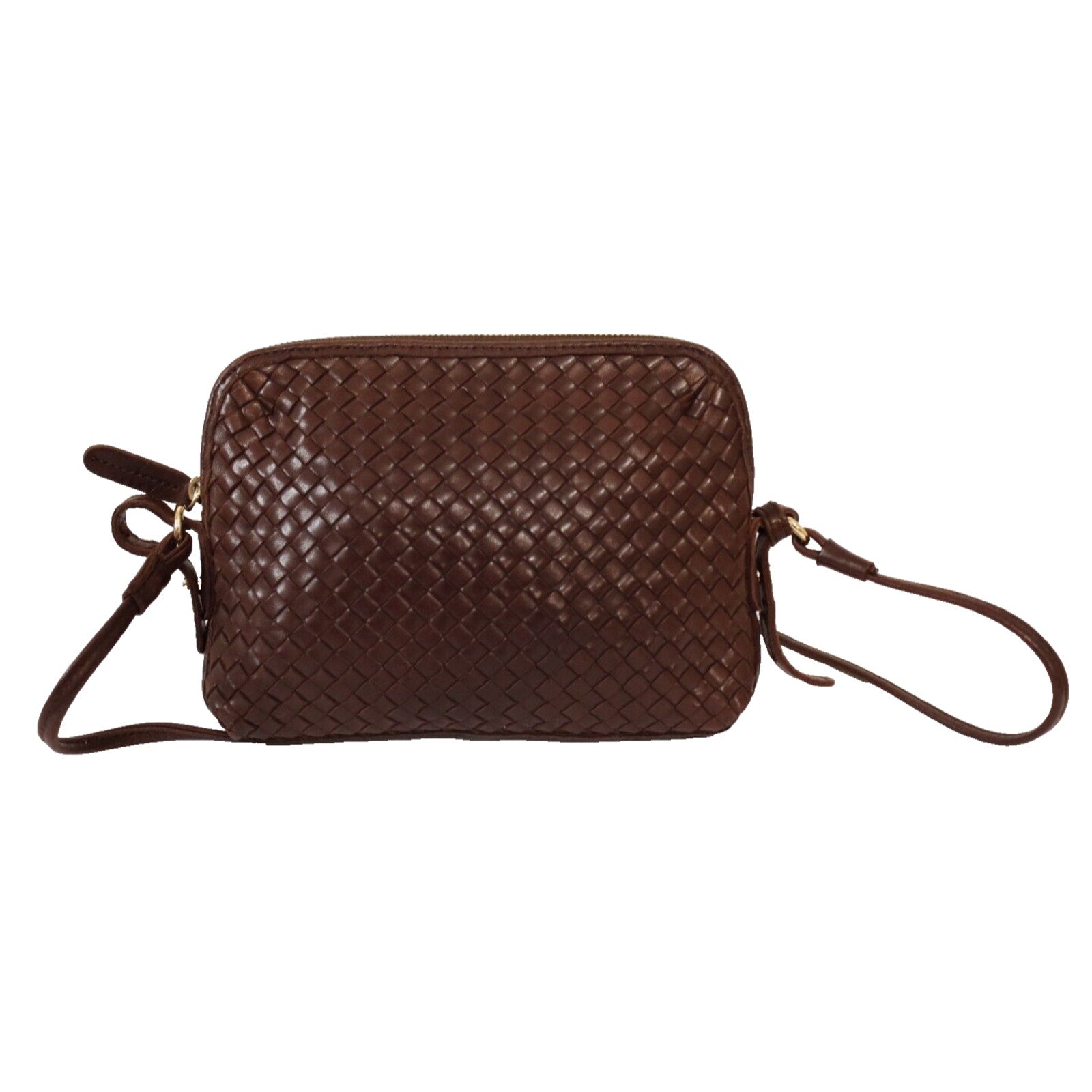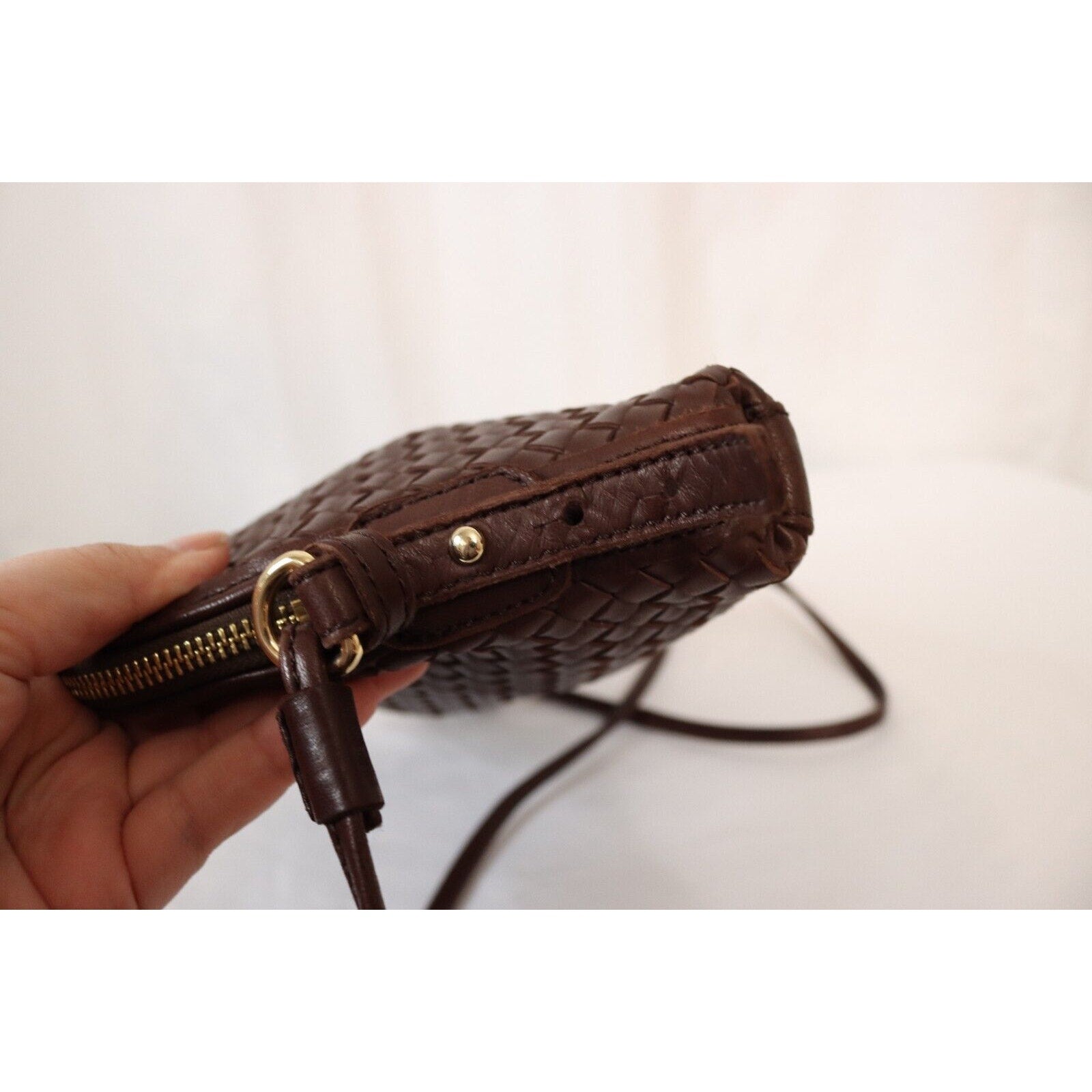 The Margot Brown Leather Woven Crossbody is a small women's bag with a zip closure. It features a woven pattern on the exterior made of leather in brown color, with a brown leather strap. The lining is gray fabric, giving it a stylish look. This crossbody bag is adjustable and designed for practicality and style.