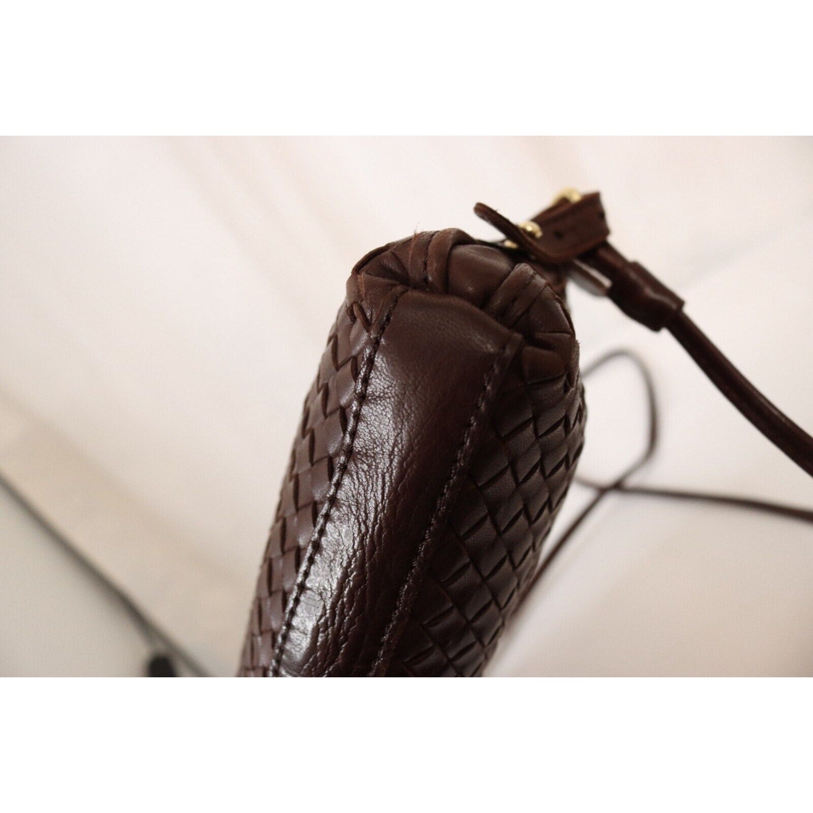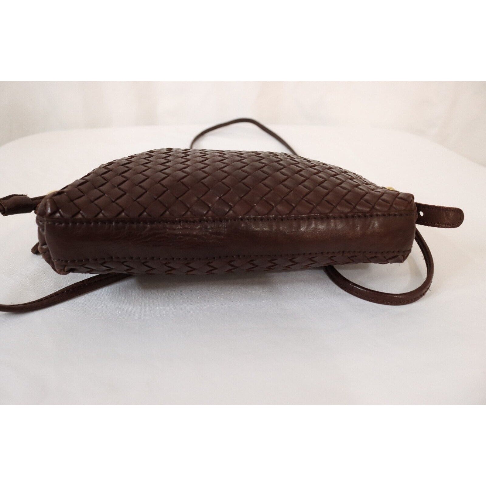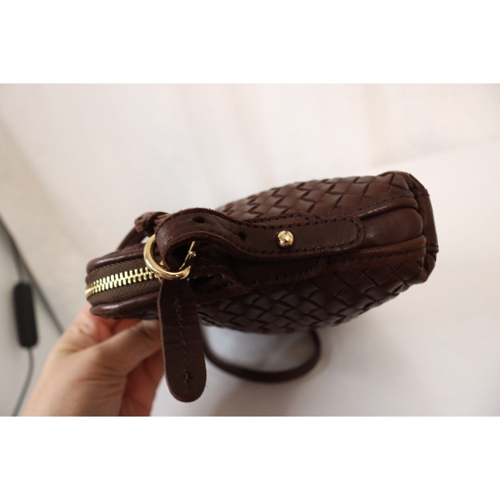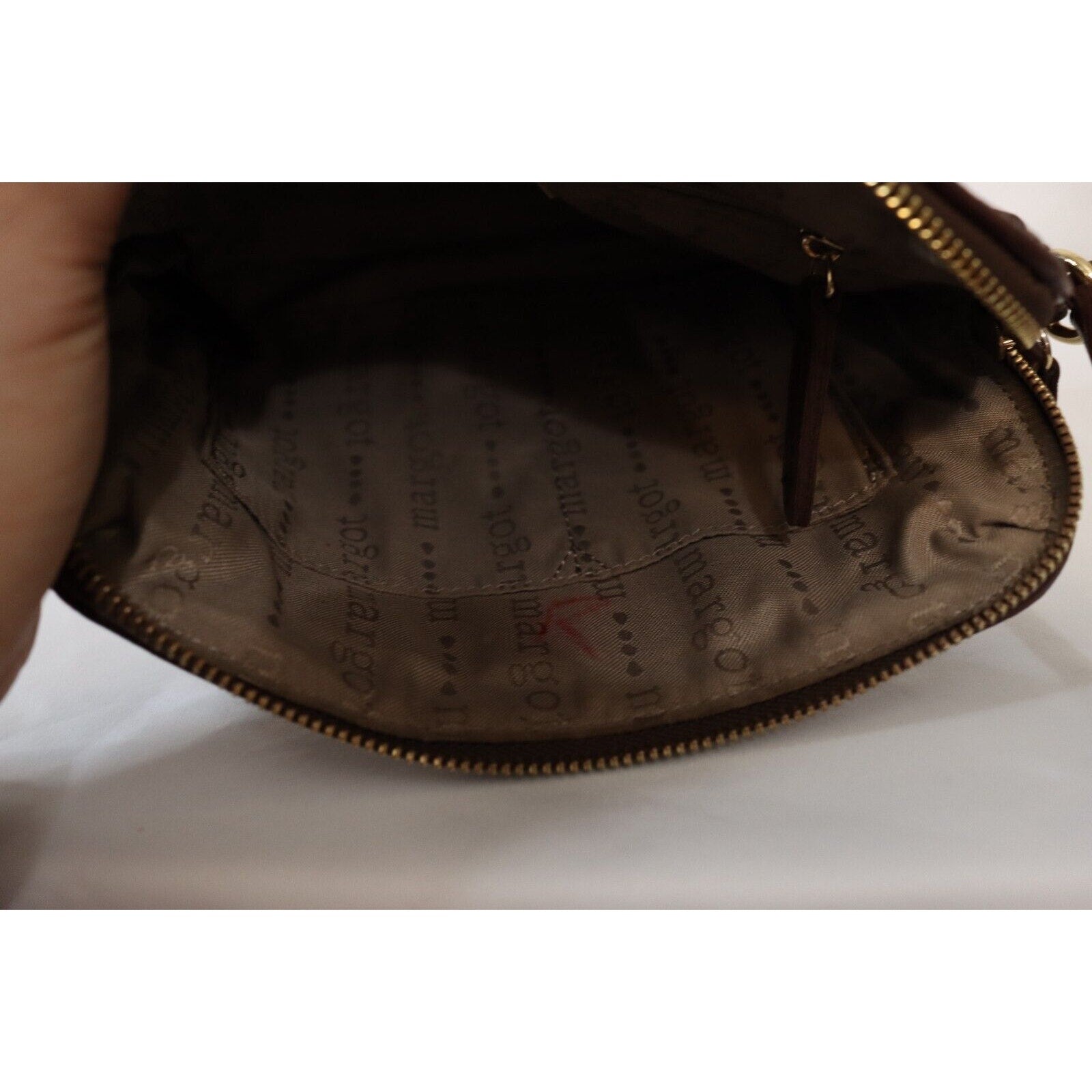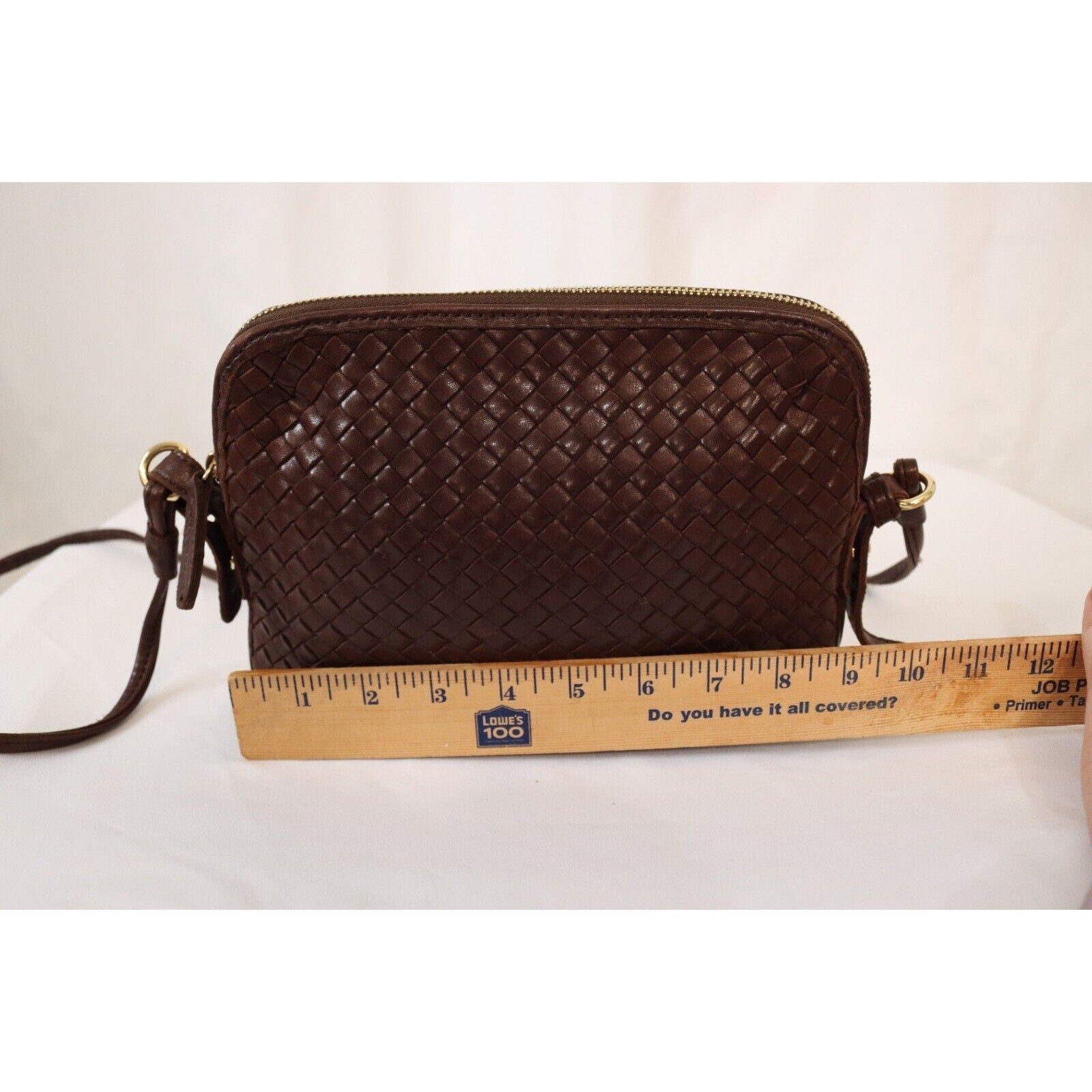 The Margot Brown Leather Woven Crossbody is a small women's bag with a zip closure. It features a woven pattern on the exterior made of leather in brown color, with a brown leather strap. The lining is gray fabric, giving it a stylish look. This crossbody bag is adjustable and designed for practicality and style.