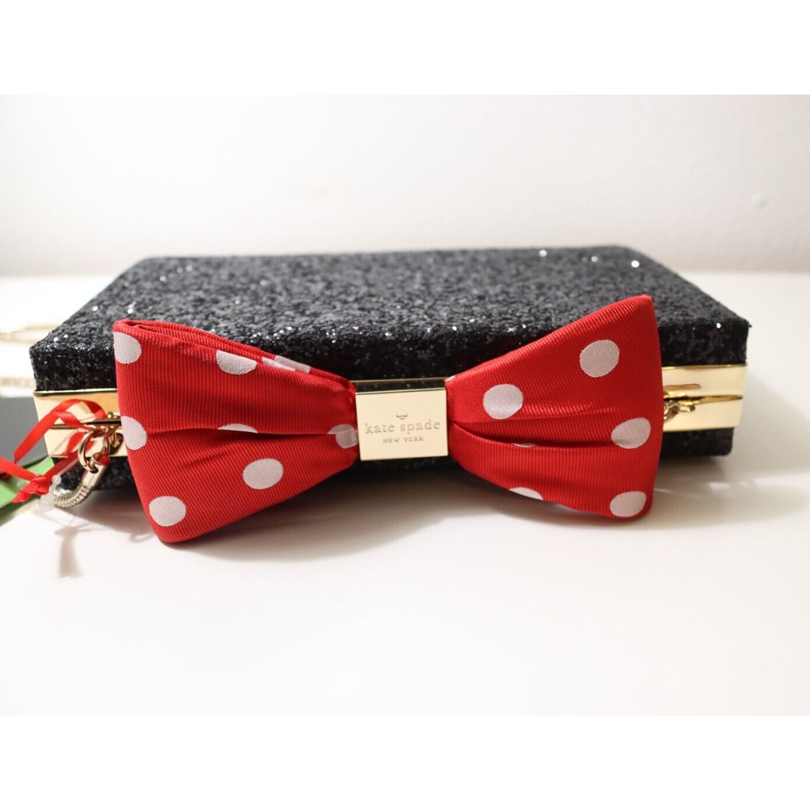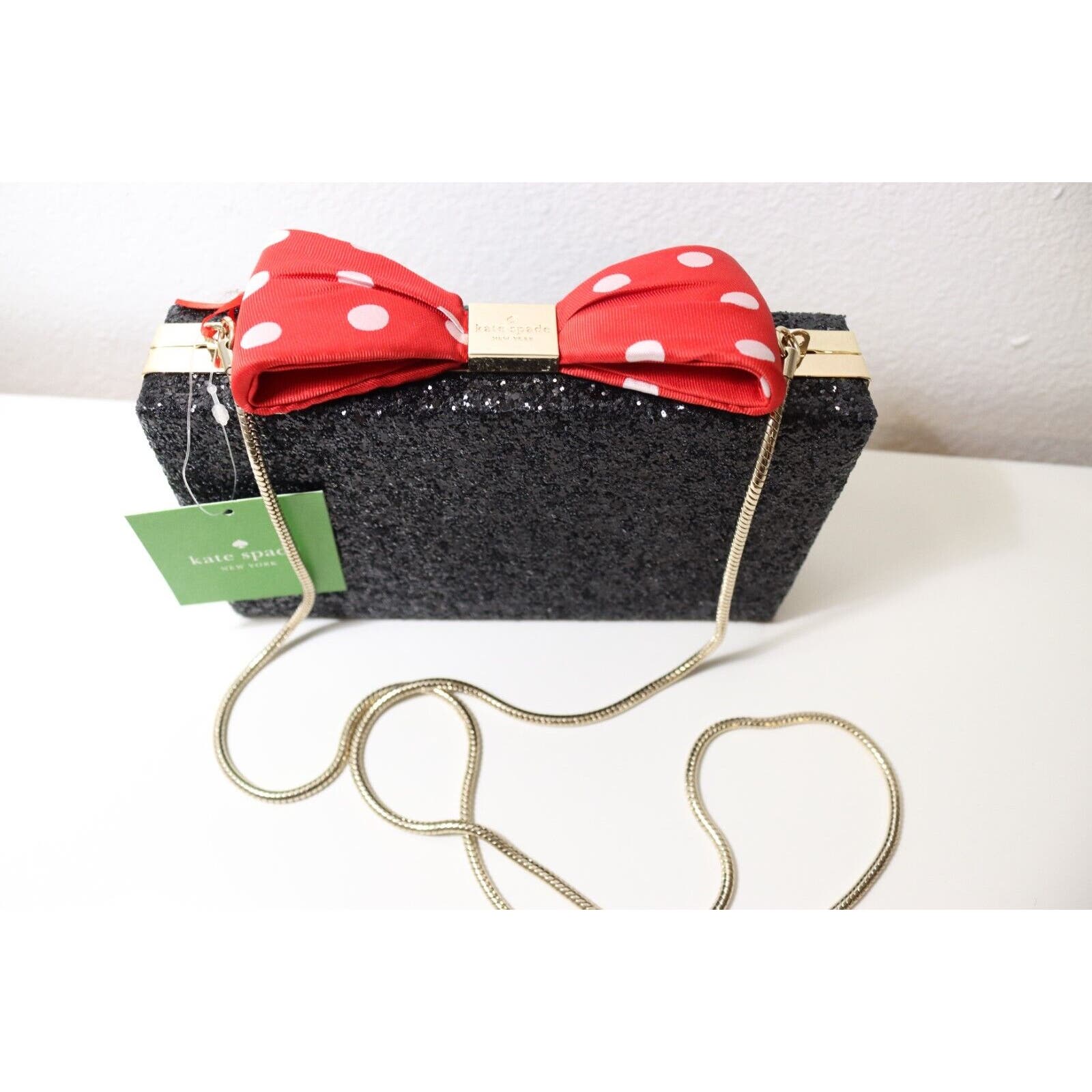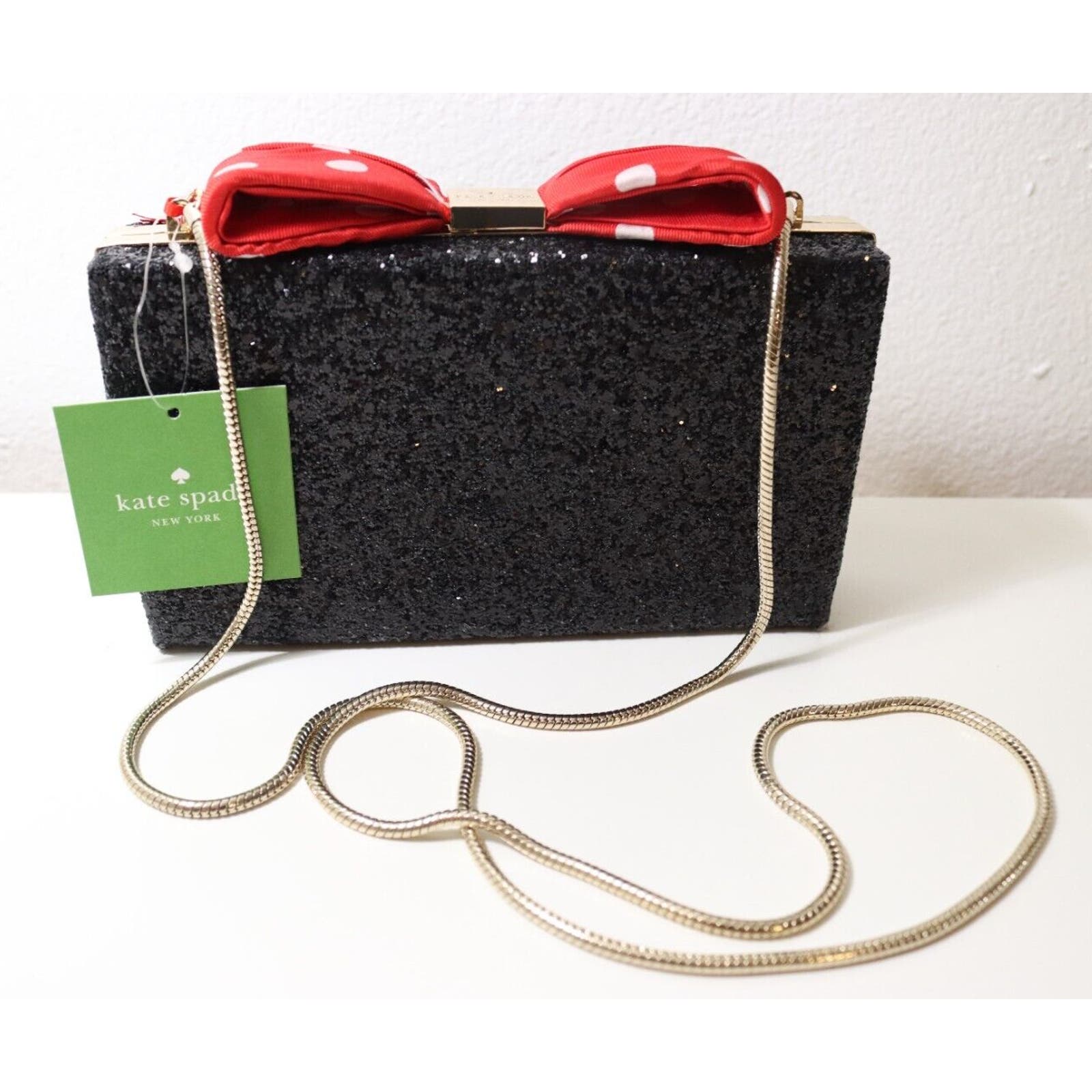 This Kate Spade x Disney Minnie Mouse Bow Clutch Crossbody Hand Bag Purse is a must-have for any fashion-forward woman. With a glitter exterior and a hidden snake chain, this limited edition bag is perfect for weddings, parties, business meetings, and formal occasions. The bag features a clasp closure, gold-plated hardware, and a shoulder strap handle style. The black exterior color and black lining color make this bag easy to match with any outfit. The polka dot Minnie Bow and Minnie Mouse character on the bag add a touch of novelty to your look.