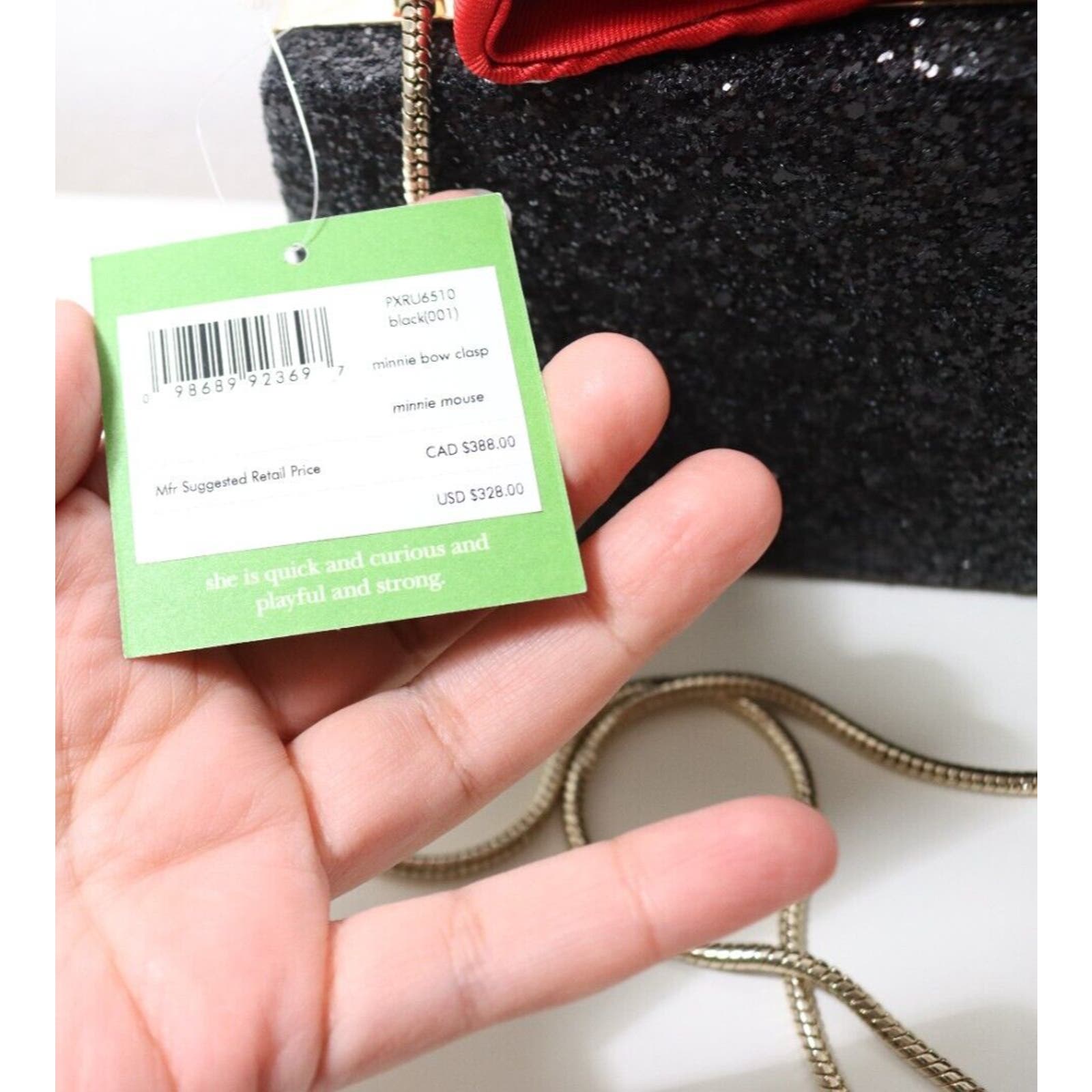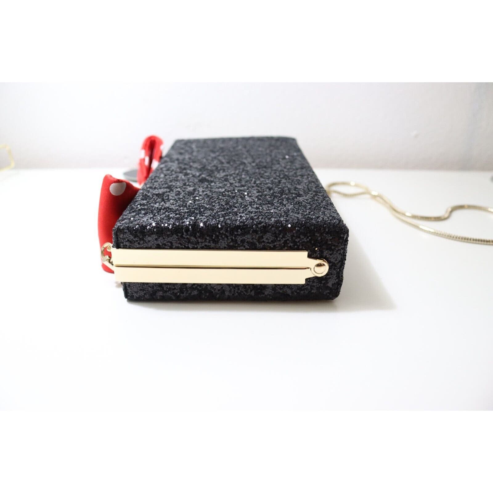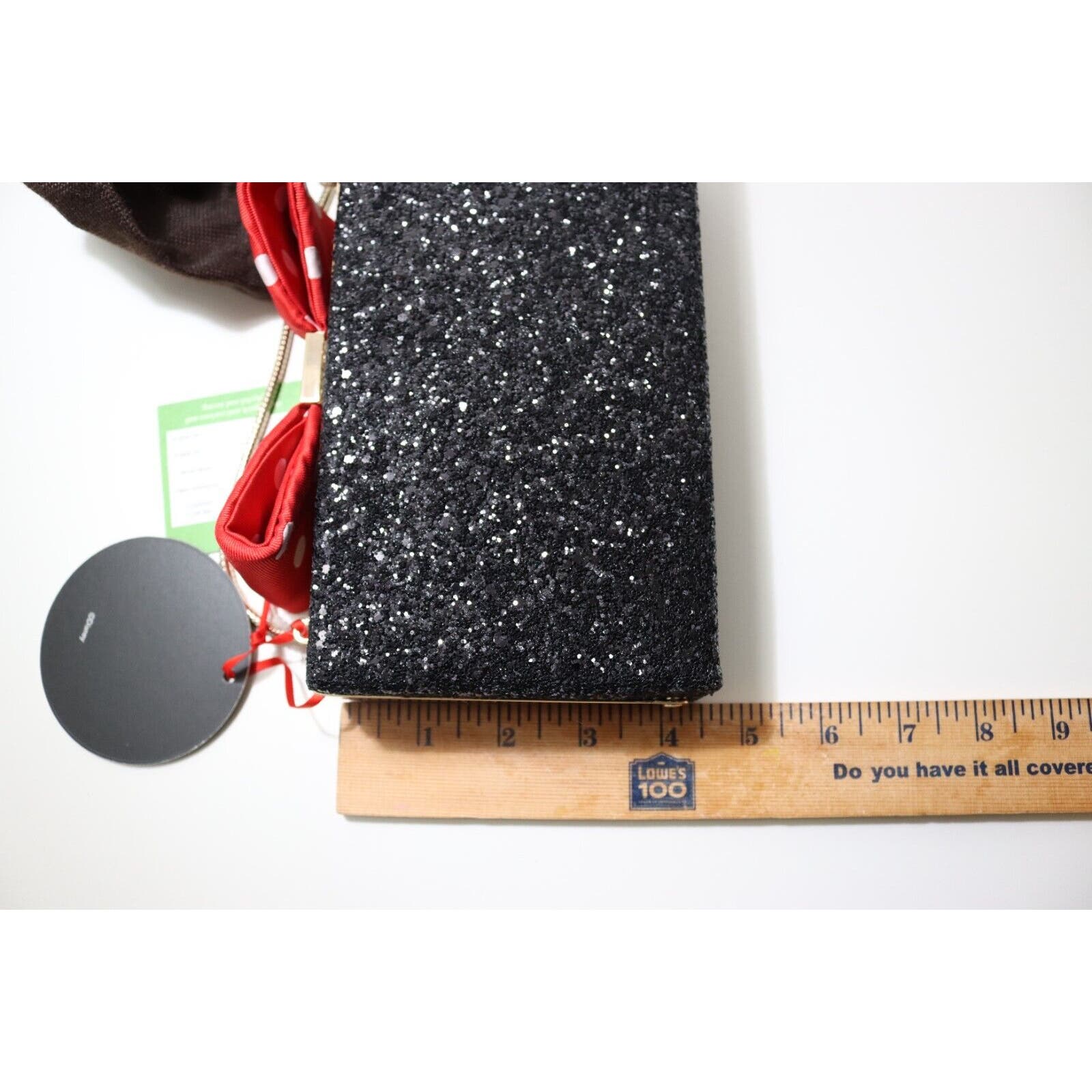This Kate Spade x Disney Minnie Mouse Bow Clutch Crossbody Hand Bag Purse is a must-have for any fashion-forward woman. With a glitter exterior and a hidden snake chain, this limited edition bag is perfect for weddings, parties, business meetings, and formal occasions. The bag features a clasp closure, gold-plated hardware, and a shoulder strap handle style. The black exterior color and black lining color make this bag easy to match with any outfit. The polka dot Minnie Bow and Minnie Mouse character on the bag add a touch of novelty to your look.