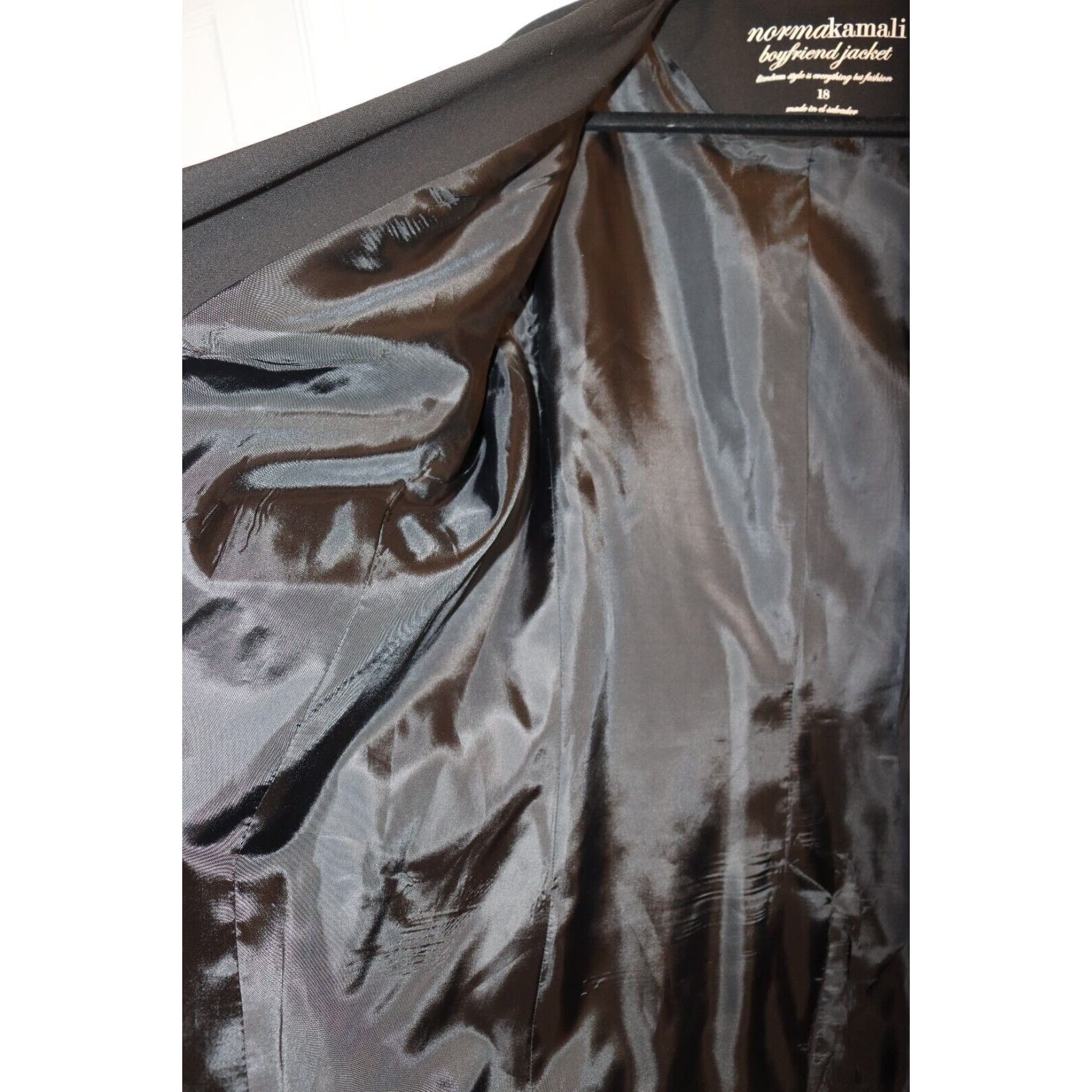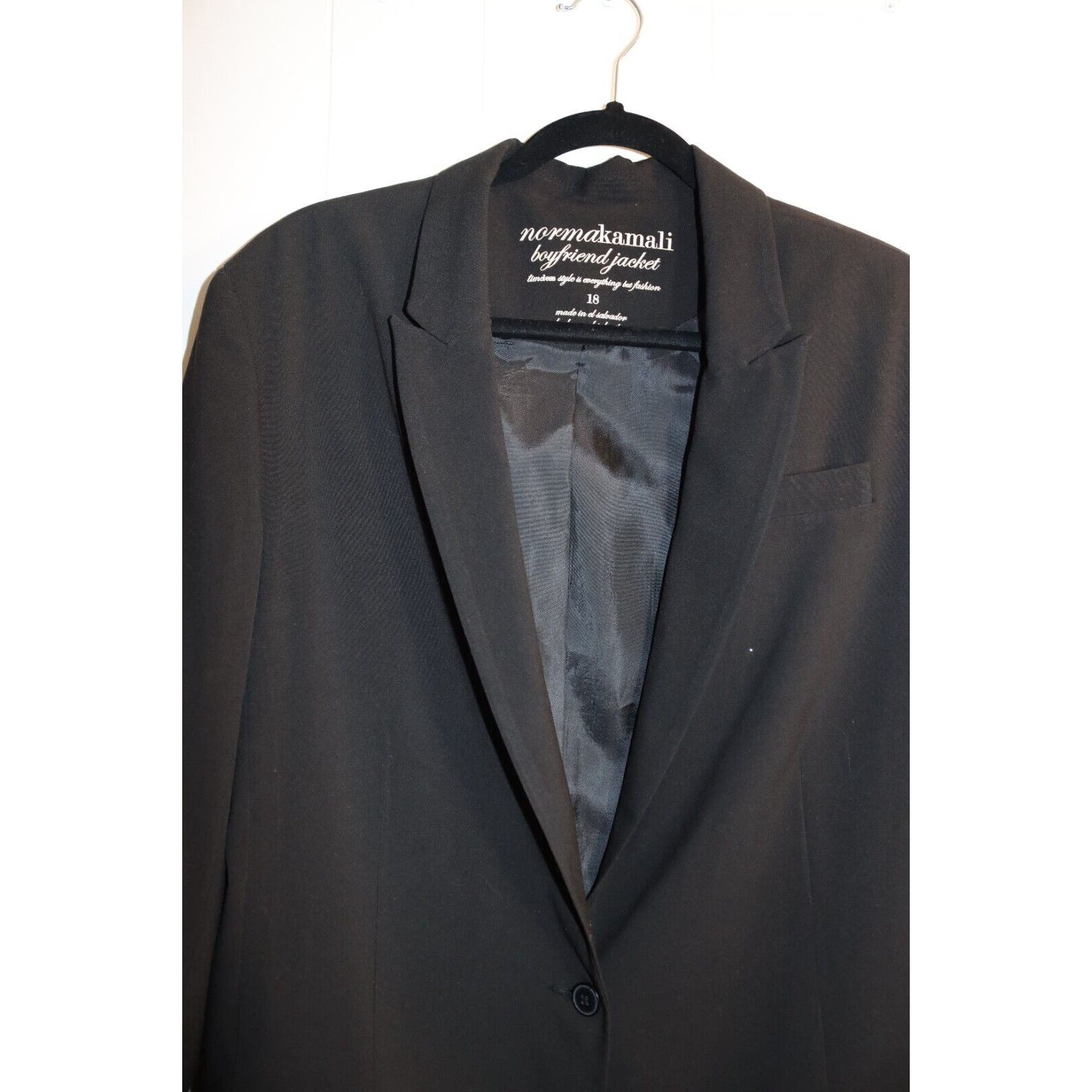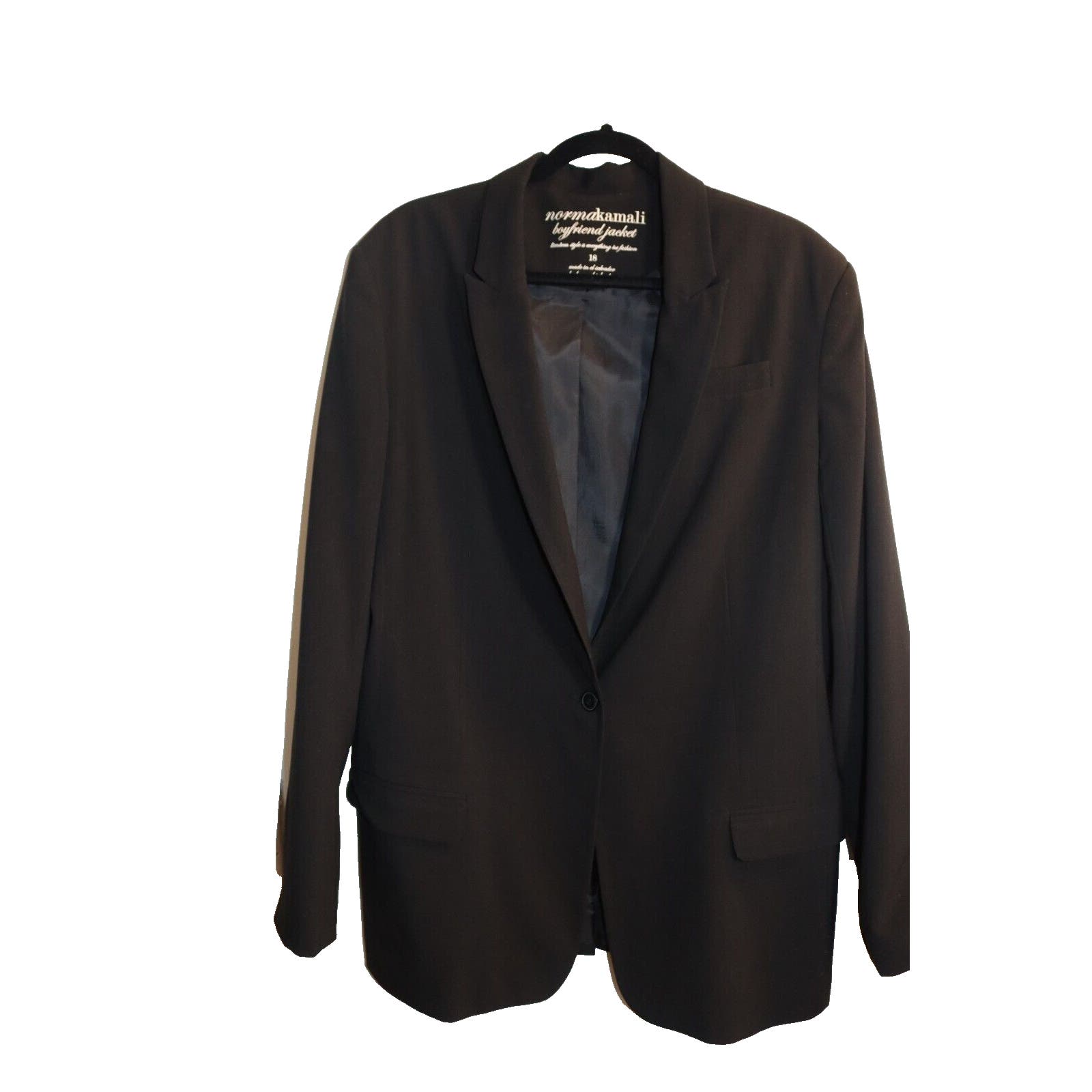 Elevate your wardrobe with this chic black blazer jacket from Norma Kamali. The one-button design adds a touch of sophistication to any outfit, while the collared and oversized features provide comfort and style. Perfect for travel, casual outings, or professional settings, this mid-length jacket is a versatile addition to your collection. Crafted with a polyester blend outer shell, this solid-patterned blazer boasts long sleeves and a button closure. It is machine washable for easy garment care, making it a practical choice for everyday wear. Whether you're looking for a summer, fall, or spring jacket, this Norma Kamali Boyfriend Jacket is a must-have.