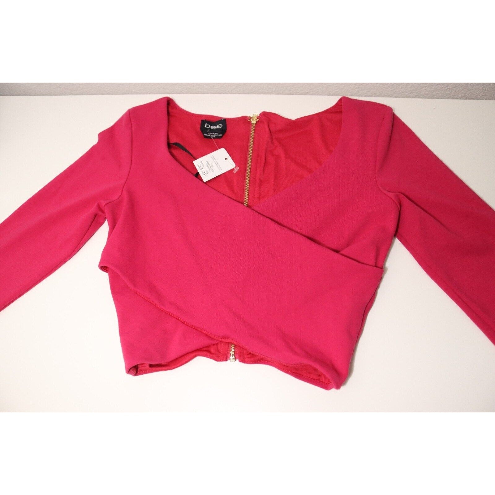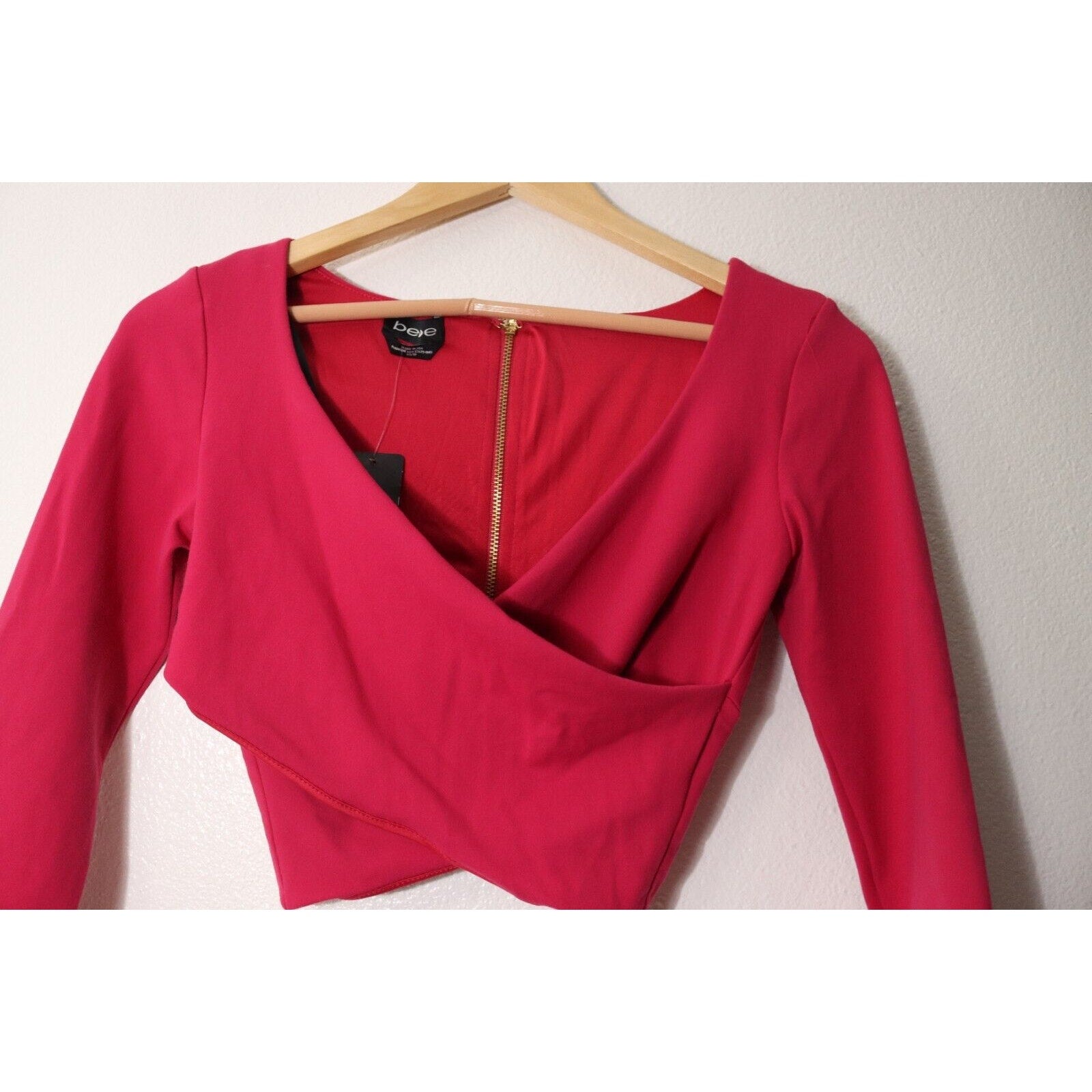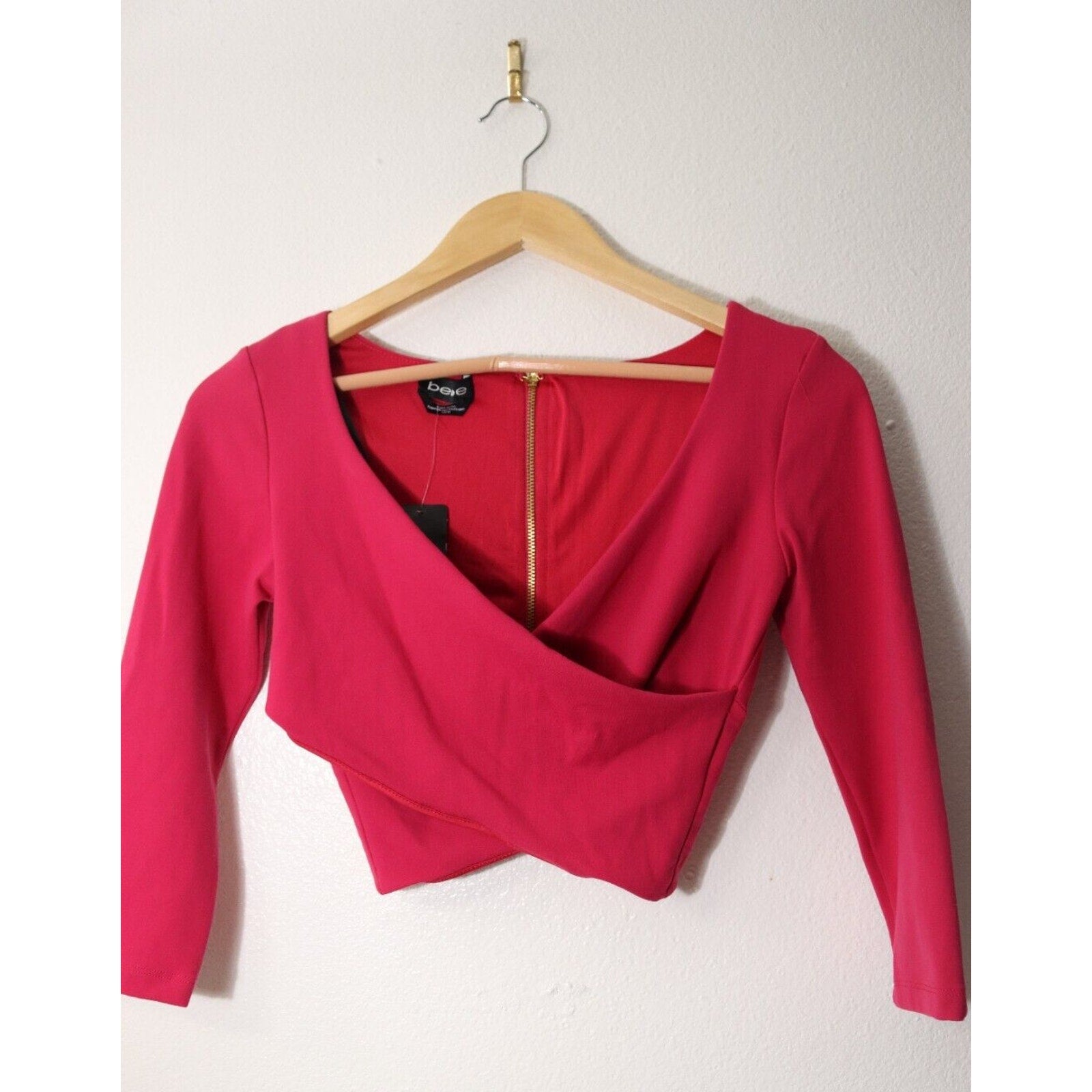 This beautiful pink cropped top by Bebe is perfect for any fashion-forward woman. The V-neckline and long sleeves provide a classic and timeless look, while the faux wrap style adds a touch of sophistication.The solid pattern and pullover closure make it easy to match with any outfit and wear for any occasion. This top is a must-have for any wardrobe, and its vibrant pink color will make you stand out in a crowd. Don't miss out on the chance to add this stunning Bebe top to your collection.
