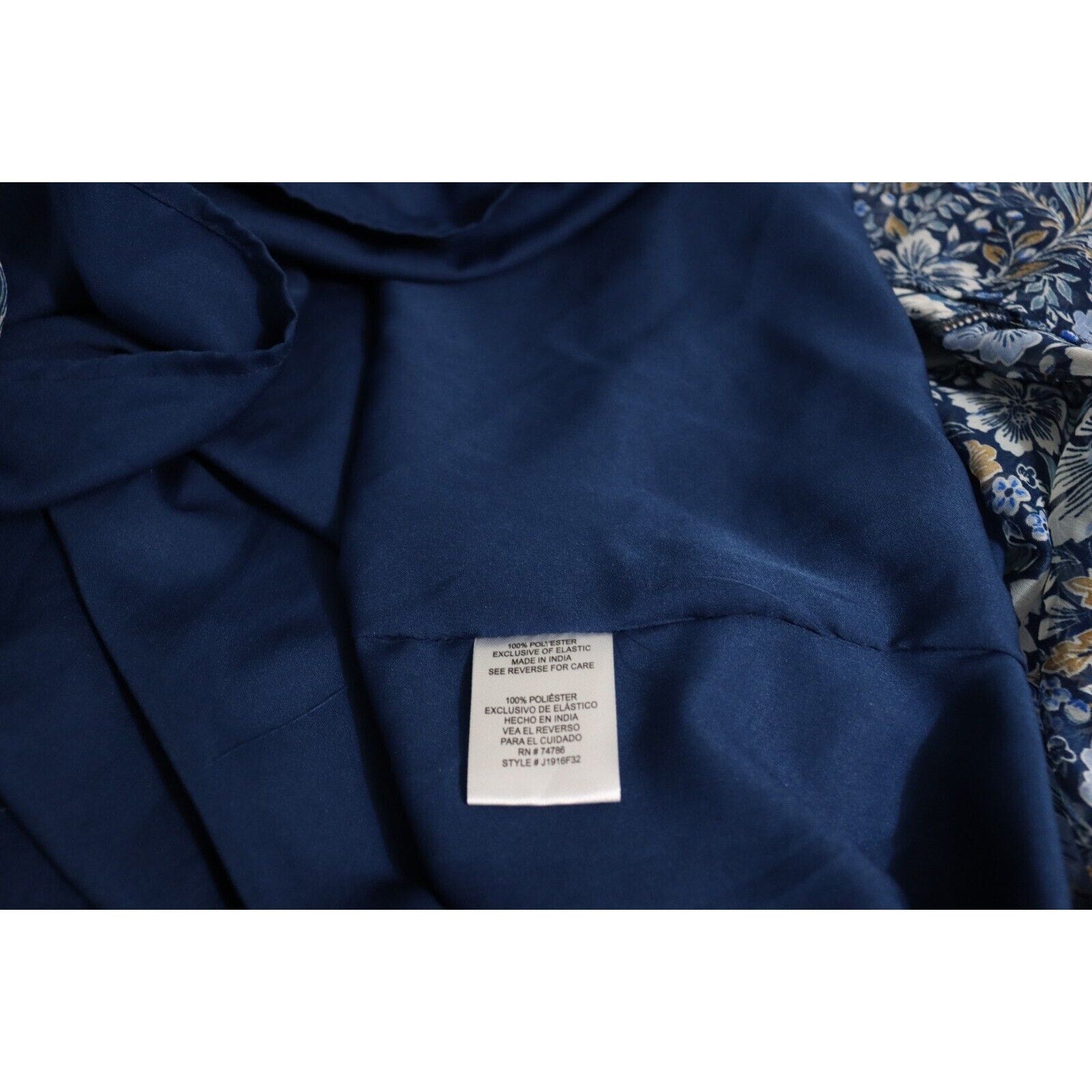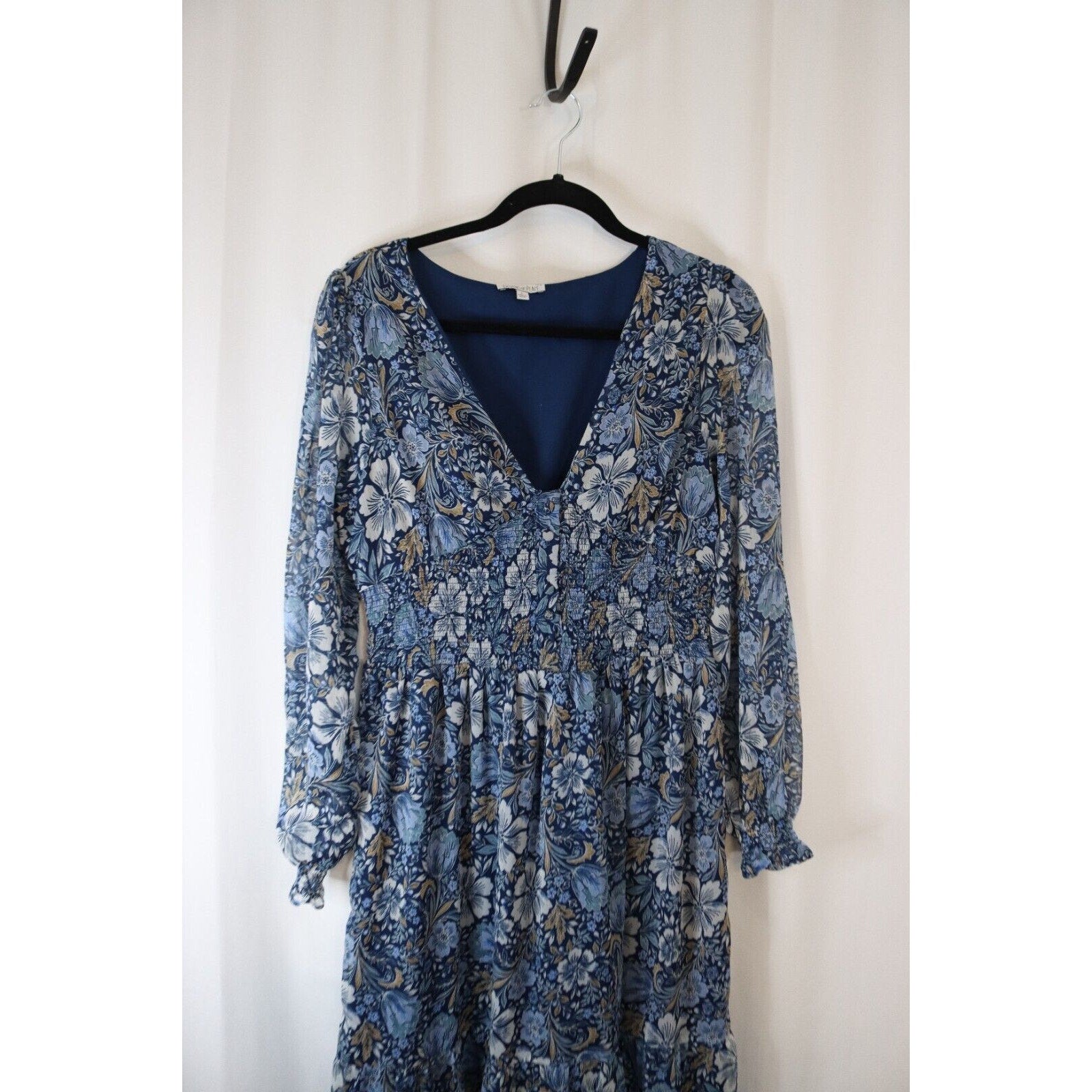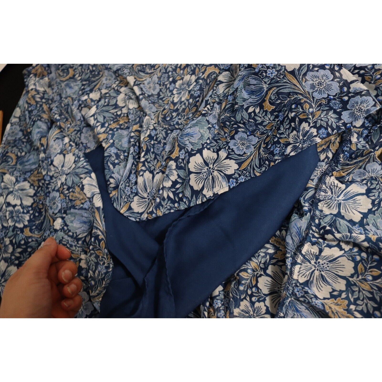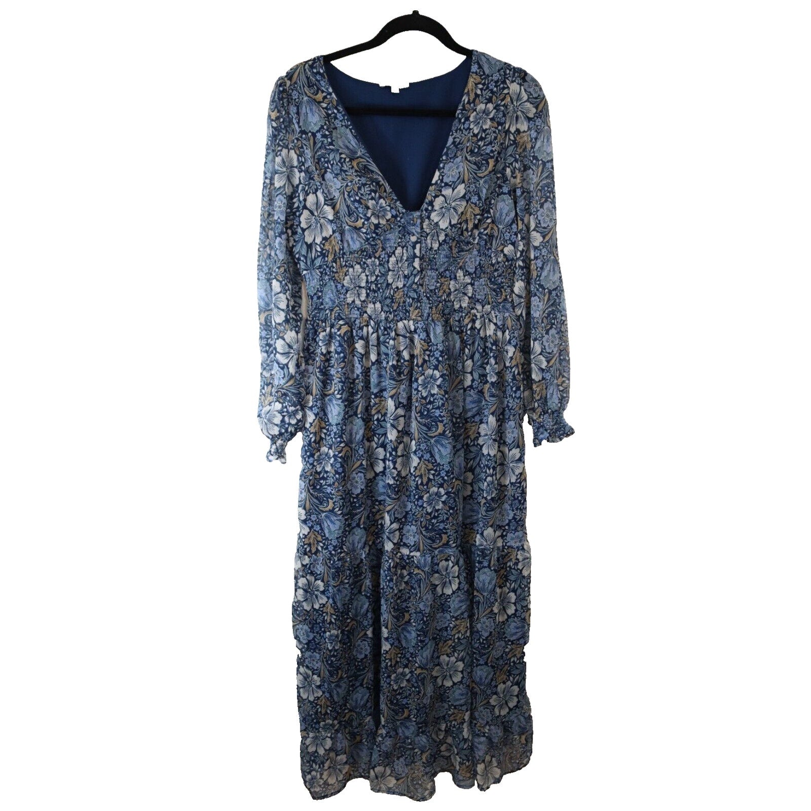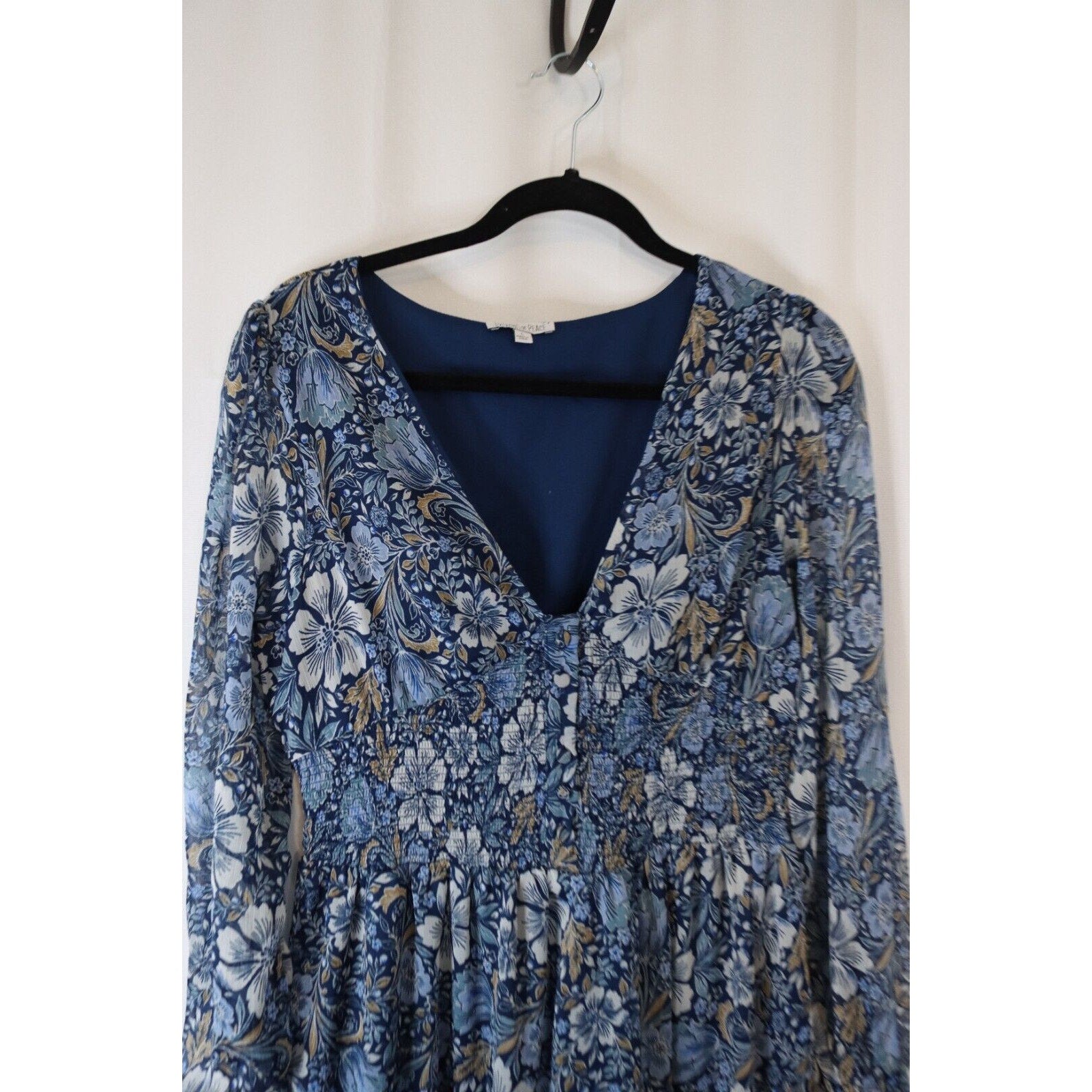 This is a Patron of Peace maxi dress in size Large. It features a floral pattern in blue, long sleeves with sheer arms, a V-neckline, button closure, and a bohemian style. Made of polyester, this long dress is suitable for travel and casual occasions in the spring and summer seasons.