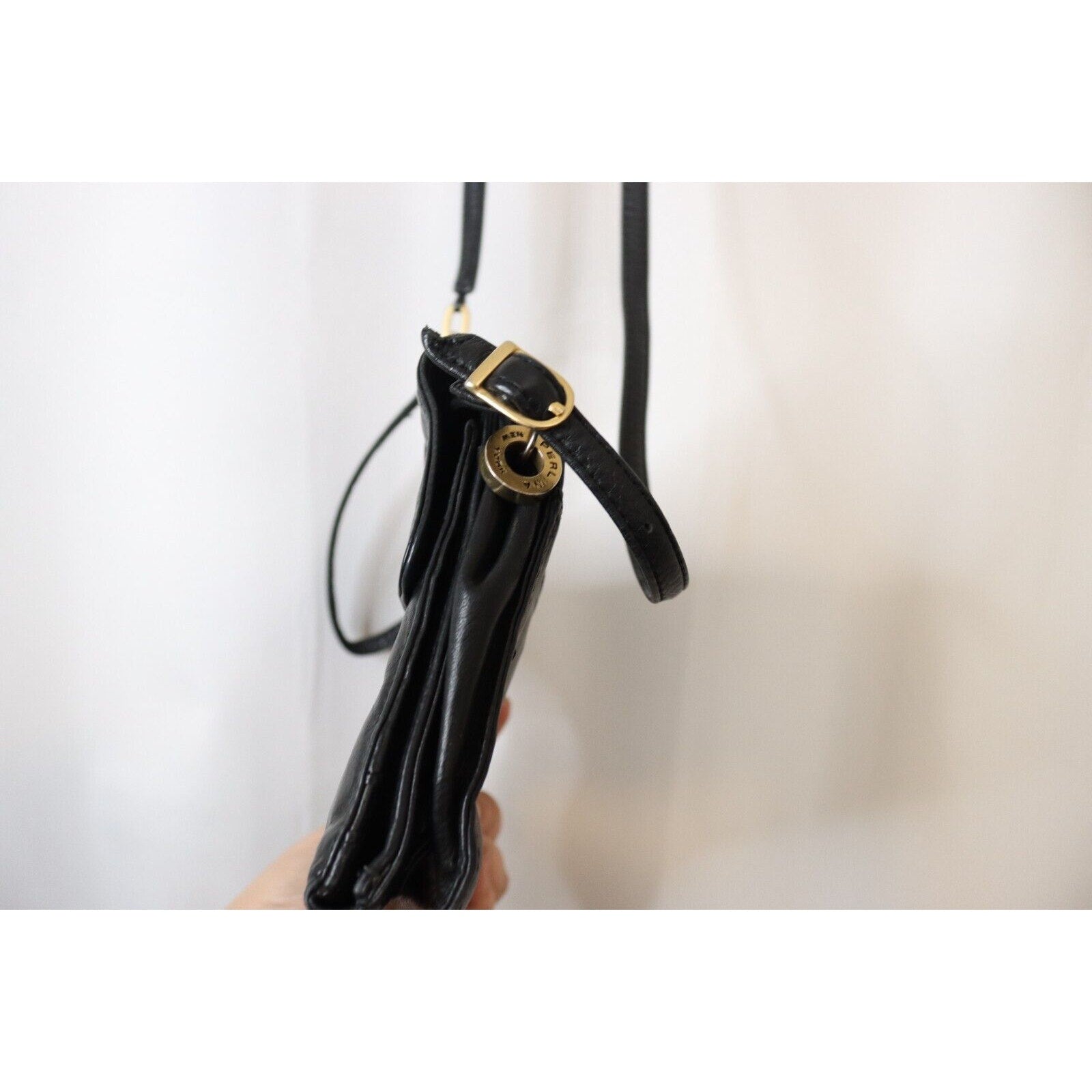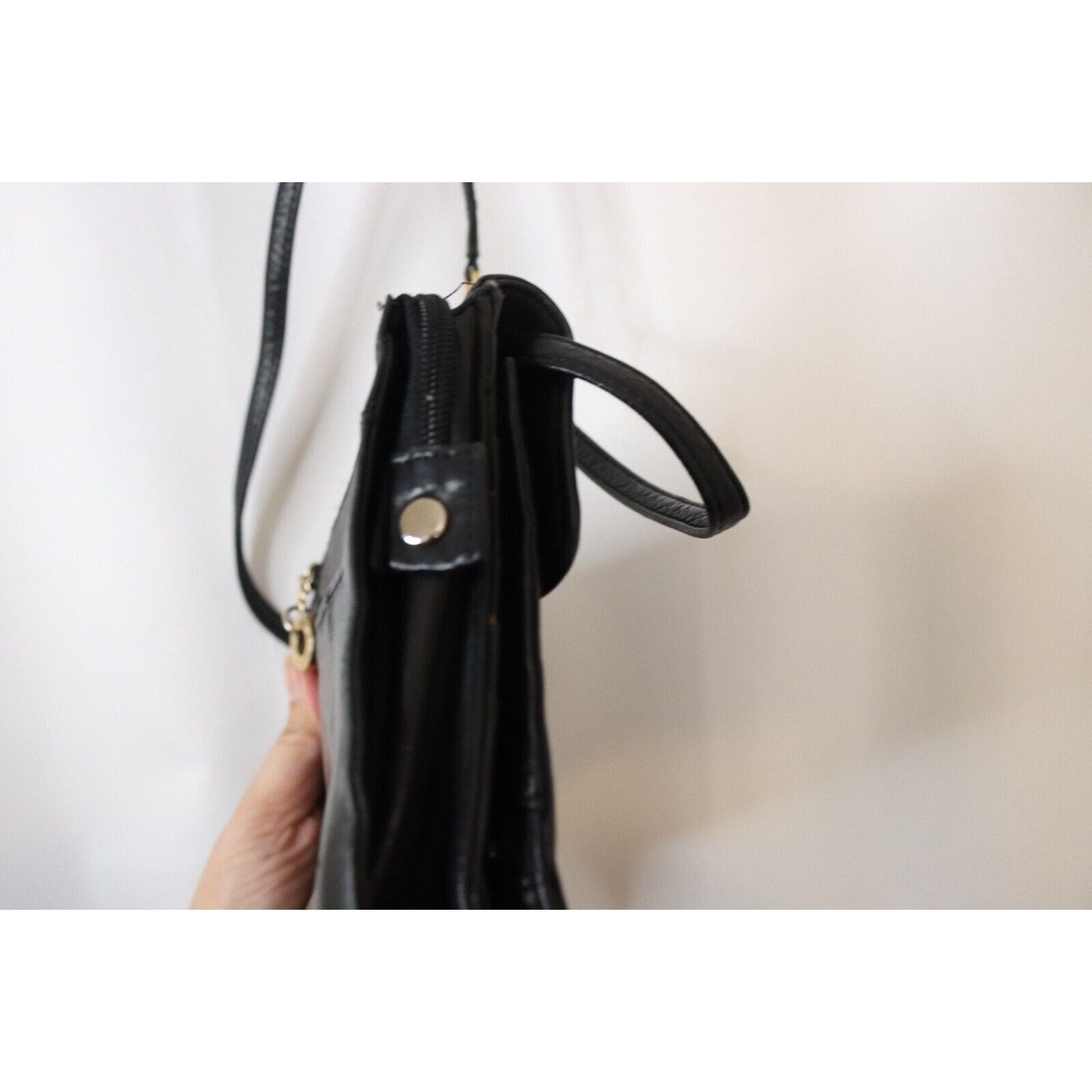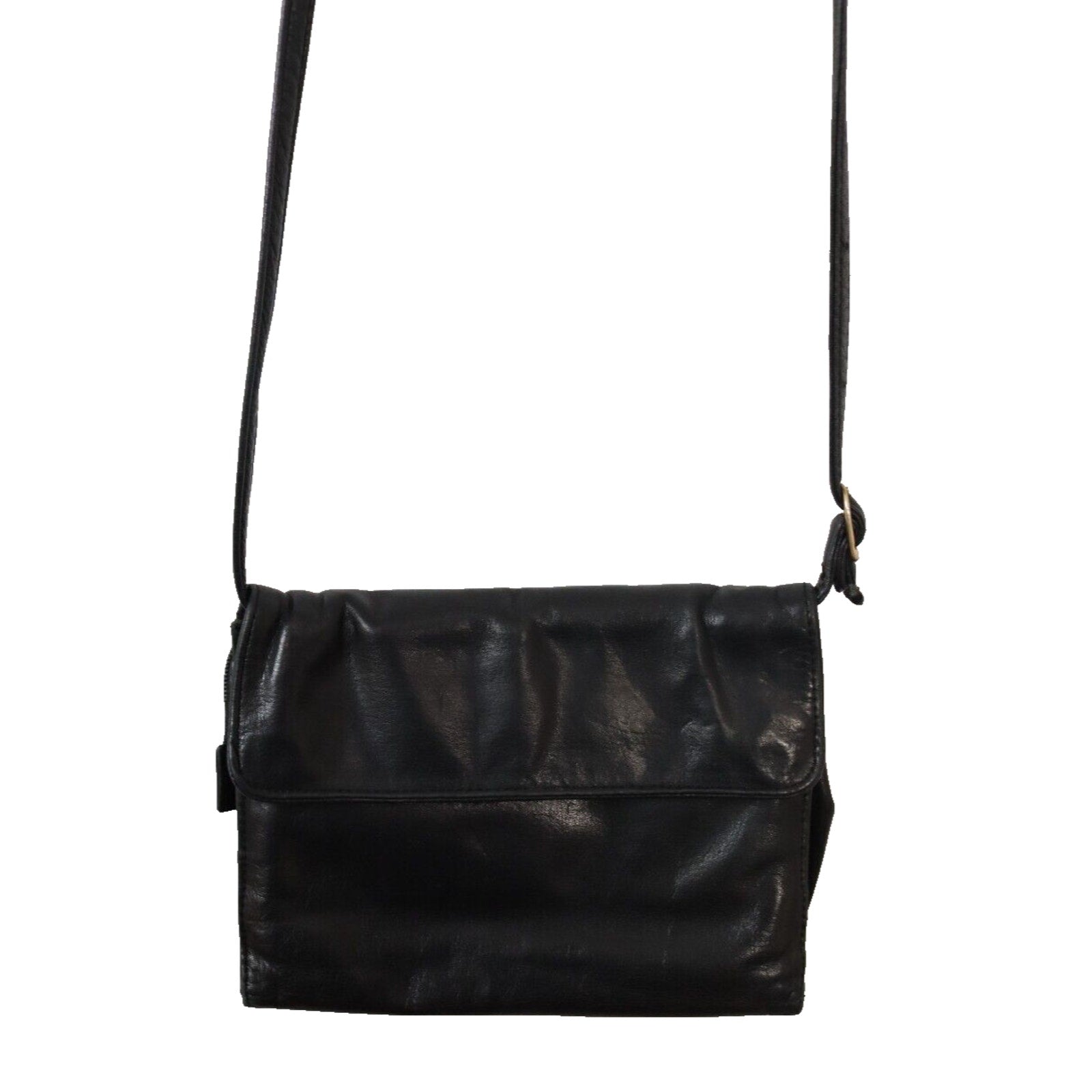 This is a Perlina crossbody bag made of soft black leather, designed with a classic city theme. The bag features an organizer, making it practical for keeping items tidy. It is a small size, perfect for women on the go who prefer a minimalist yet functional style.