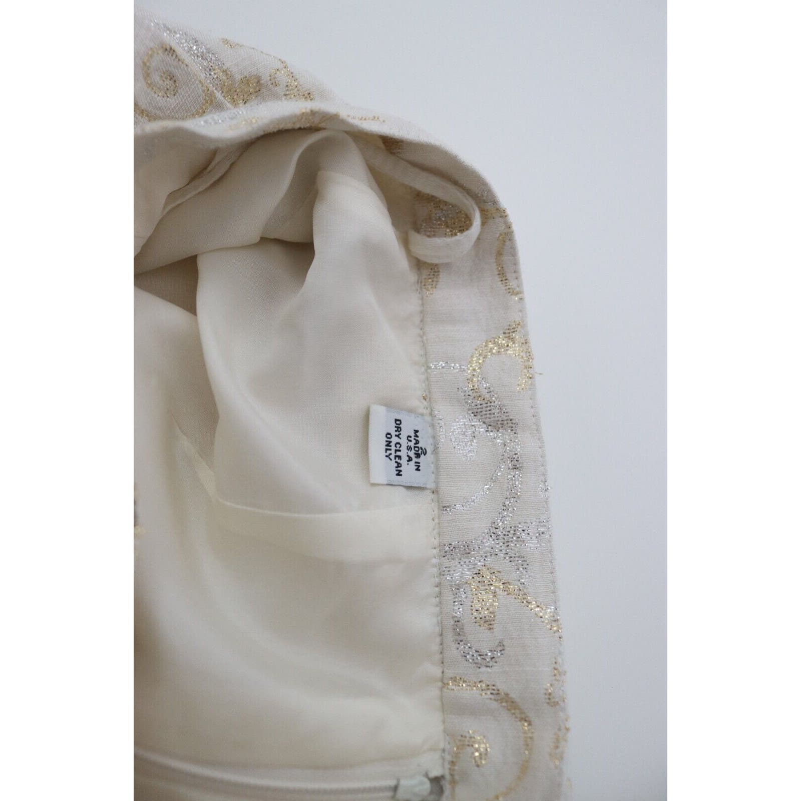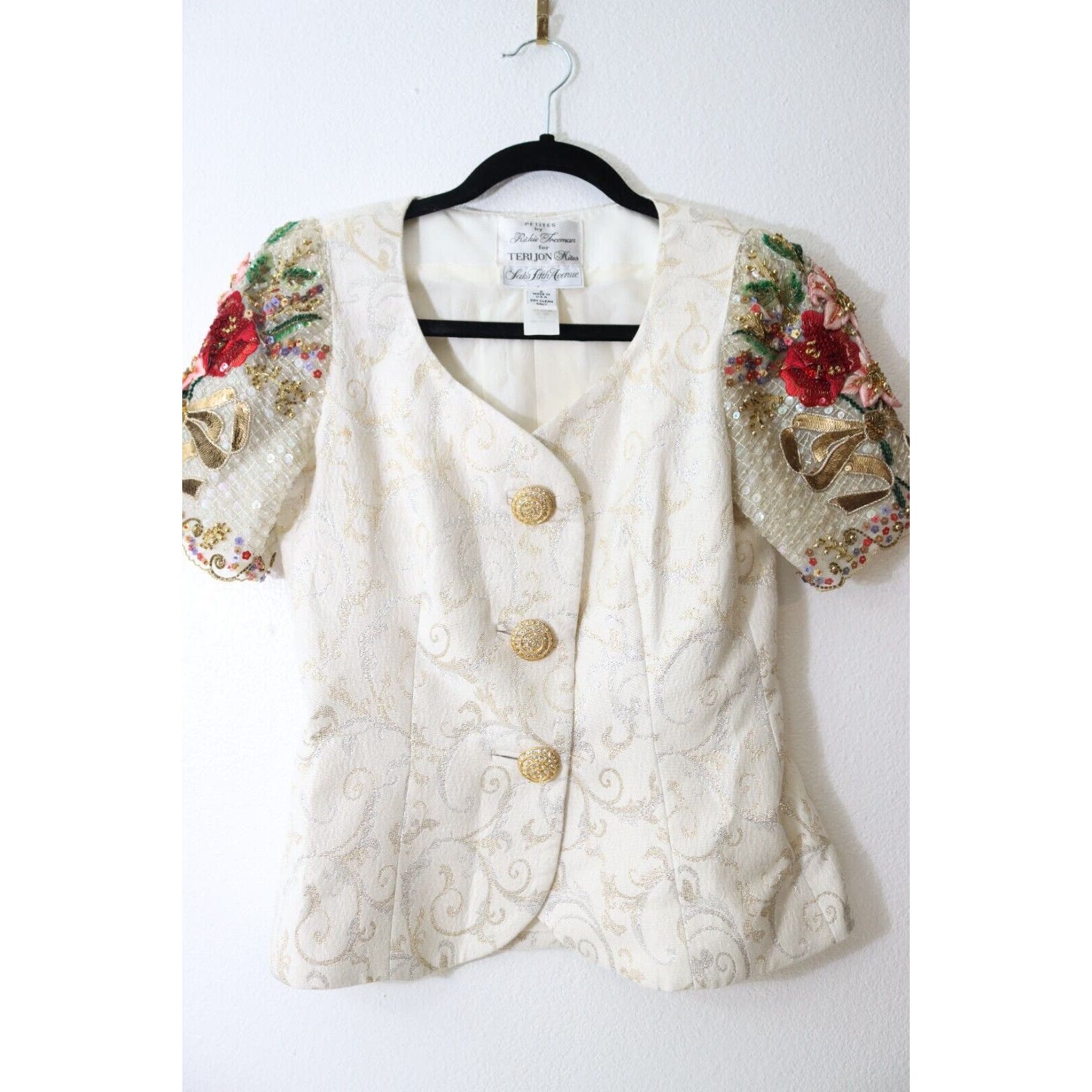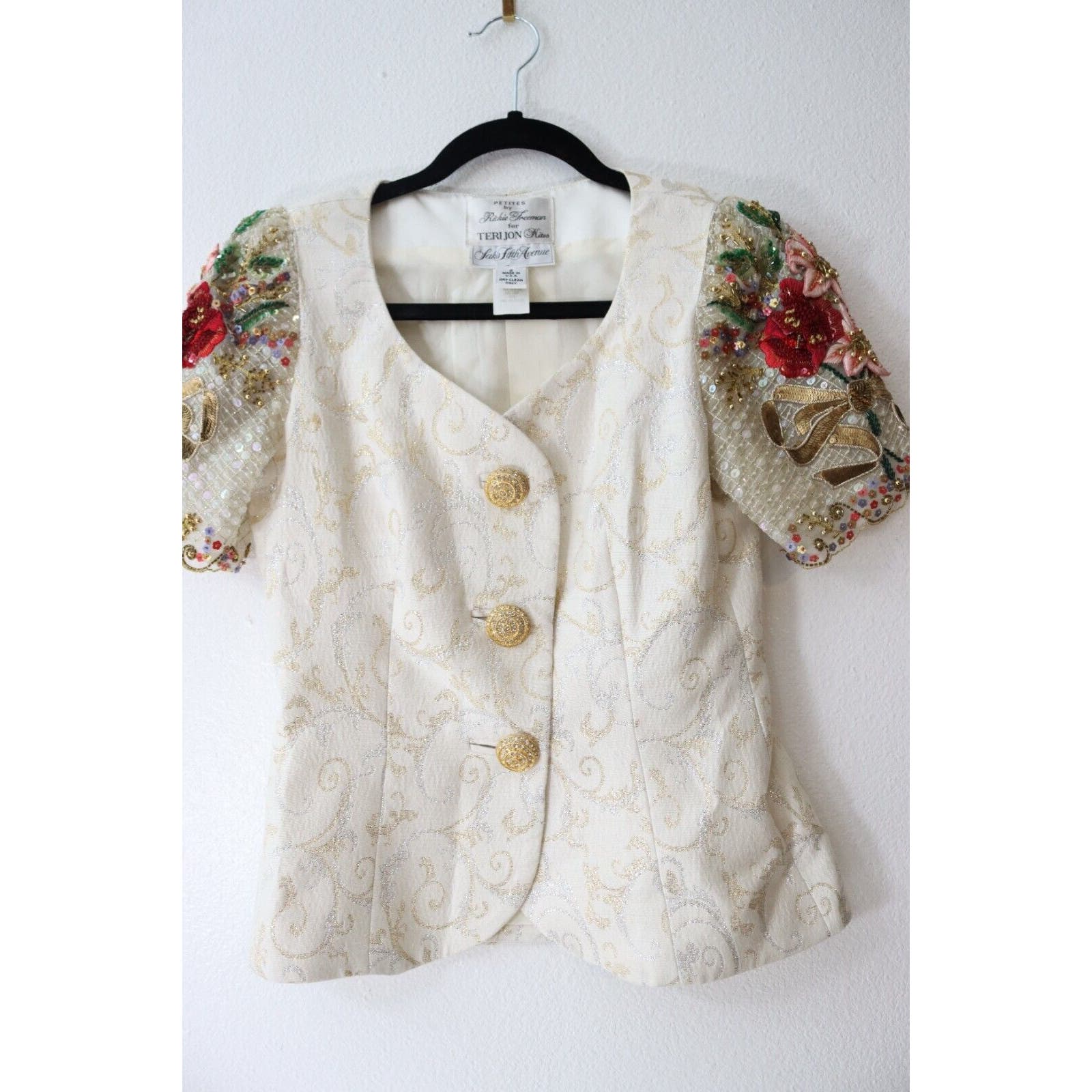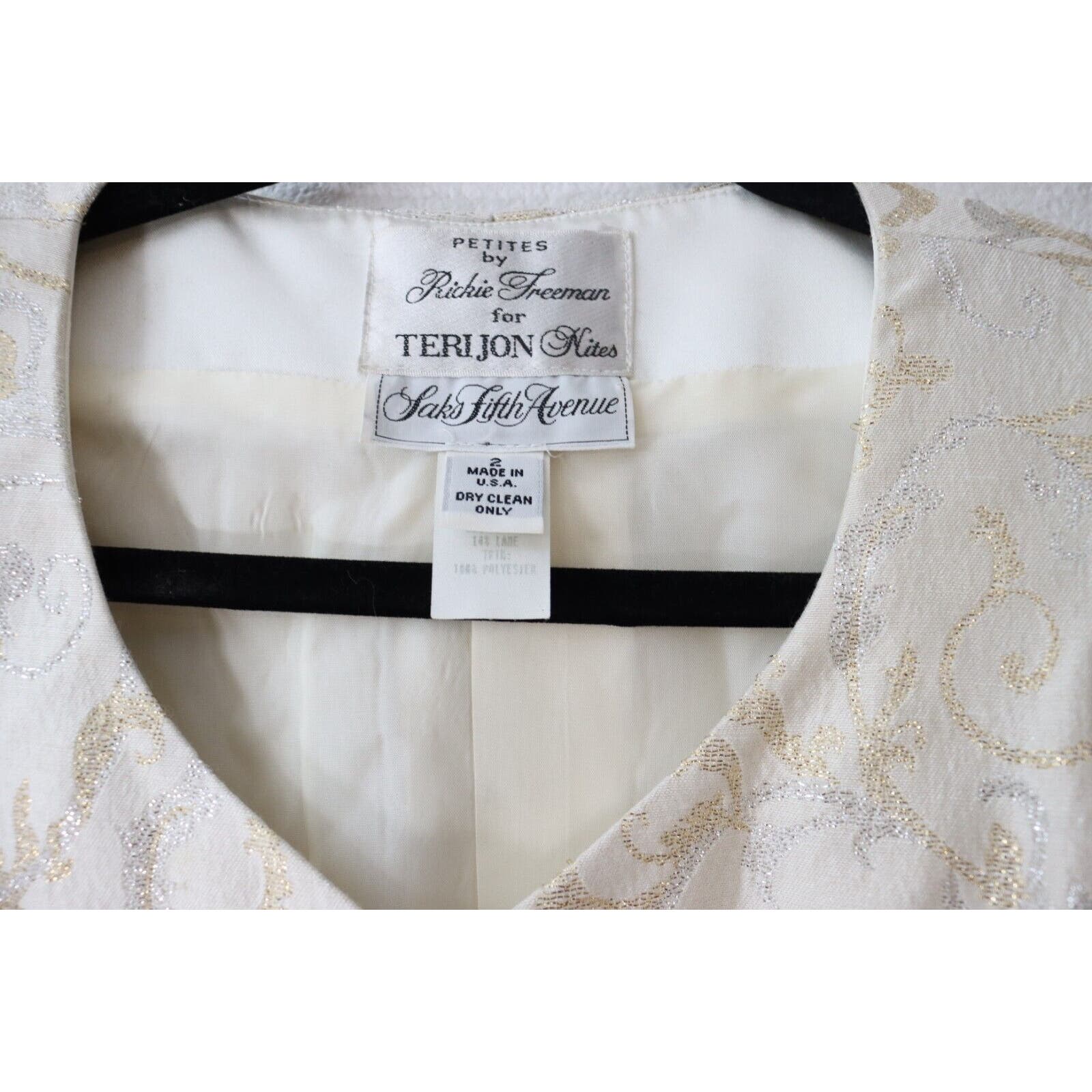 Own the spotlight in this stunning white evening set by Teri Jon. The top and skirt set, designed for petites, features a waist size of 23 inches and hip size of 17 inches, with a waist to hem length of 21 inches. The material is made of high-quality polyester and the set is an original piece. Perfect for any special occasion, this vintage set exudes elegance and sophistication. The size is a 2P and the color is a timeless white. Don't miss out on the opportunity to add this beautiful set to your wardrobe.