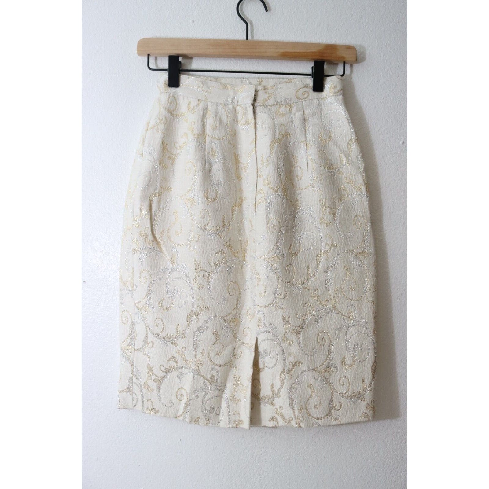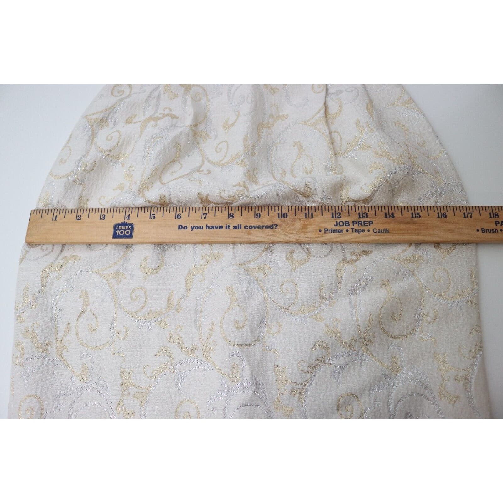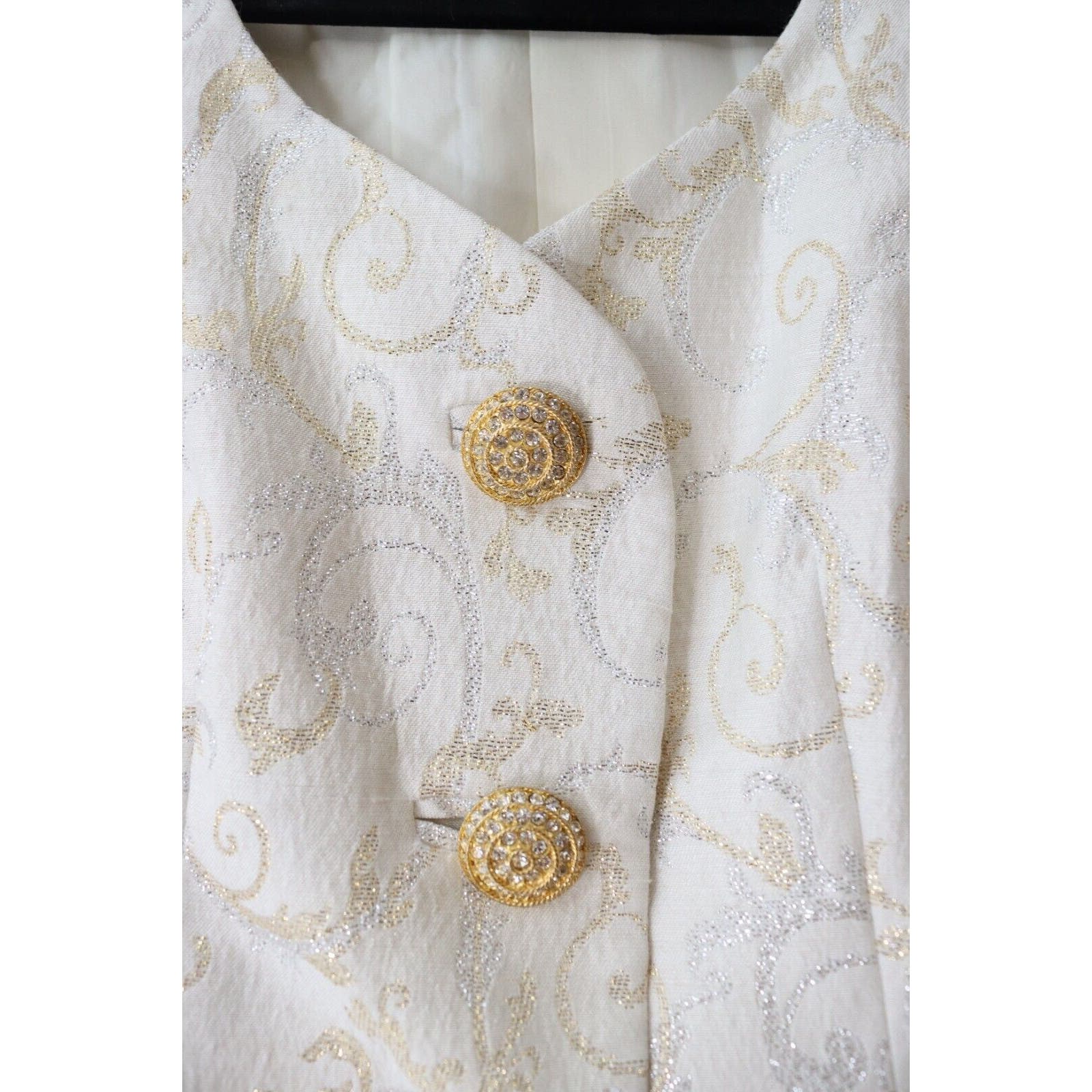 Own the spotlight in this stunning white evening set by Teri Jon. The top and skirt set, designed for petites, features a waist size of 23 inches and hip size of 17 inches, with a waist to hem length of 21 inches. The material is made of high-quality polyester and the set is an original piece. Perfect for any special occasion, this vintage set exudes elegance and sophistication. The size is a 2P and the color is a timeless white. Don't miss out on the opportunity to add this beautiful set to your wardrobe.