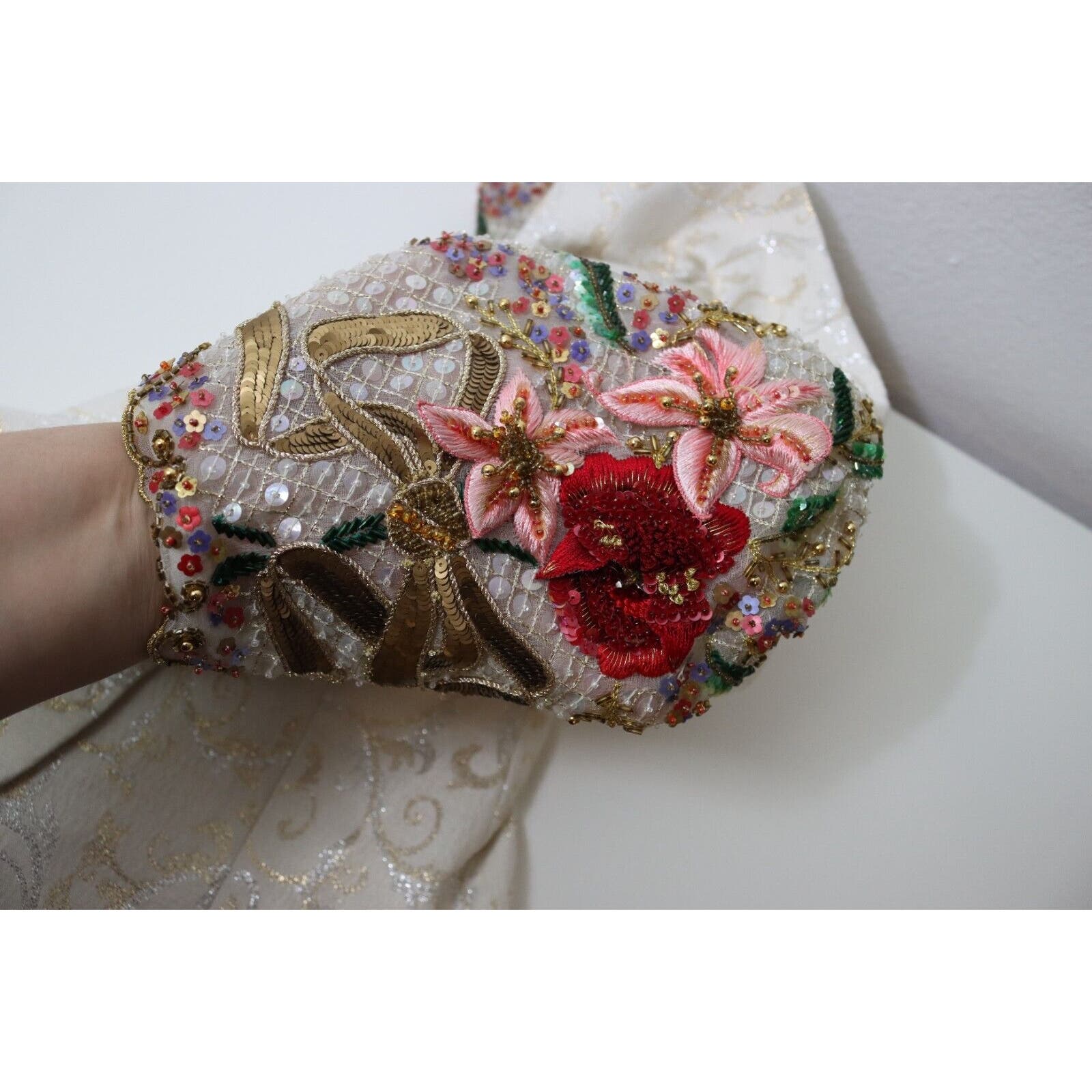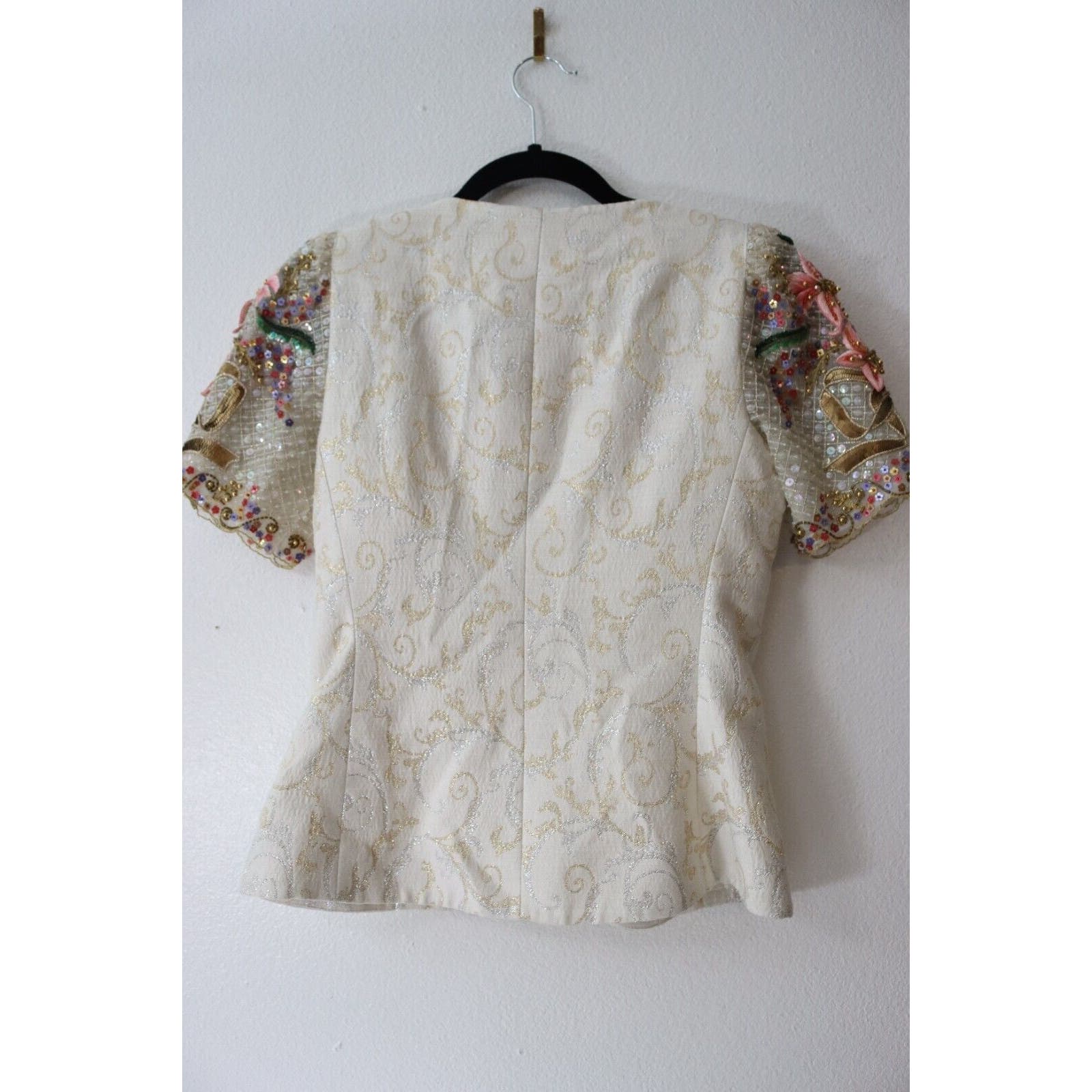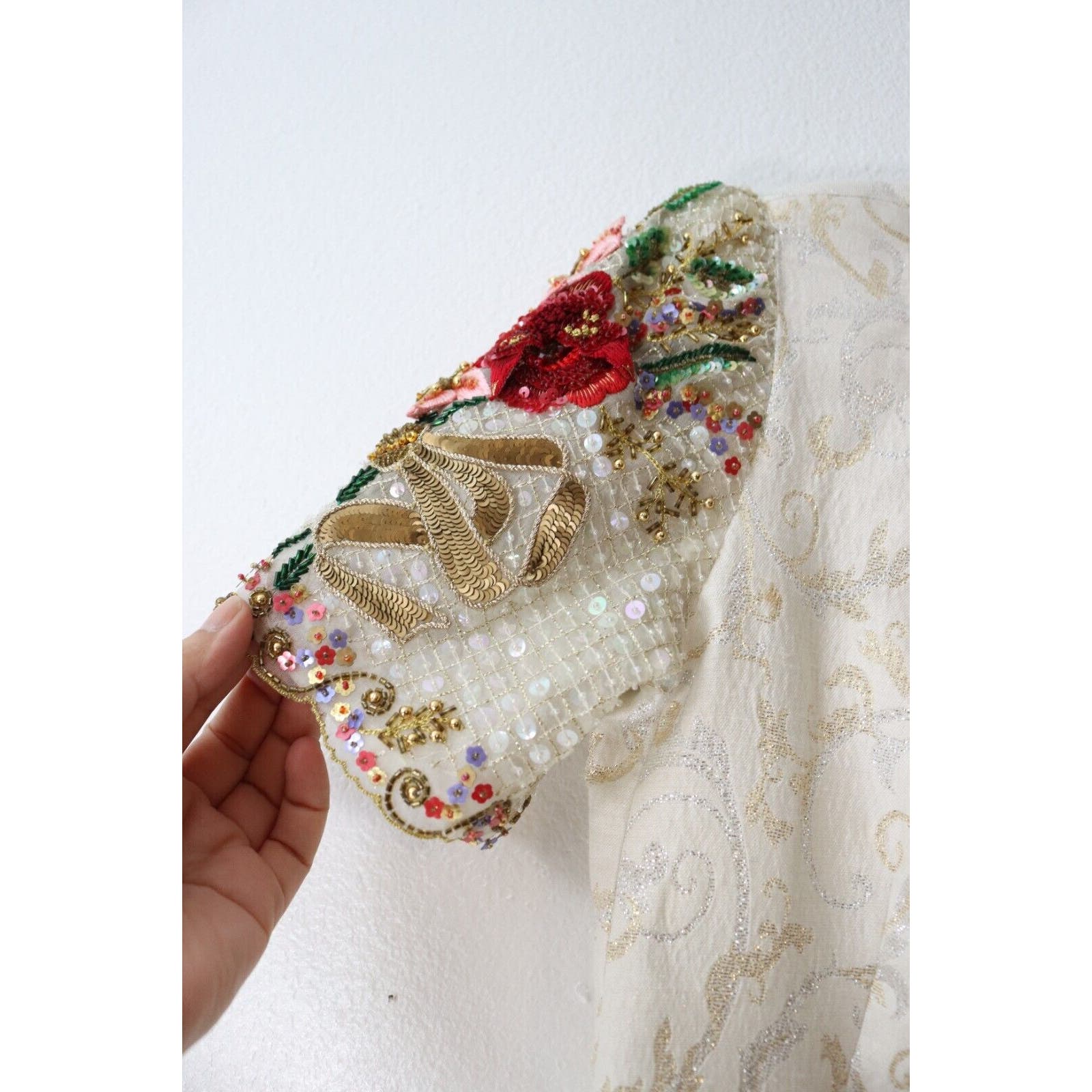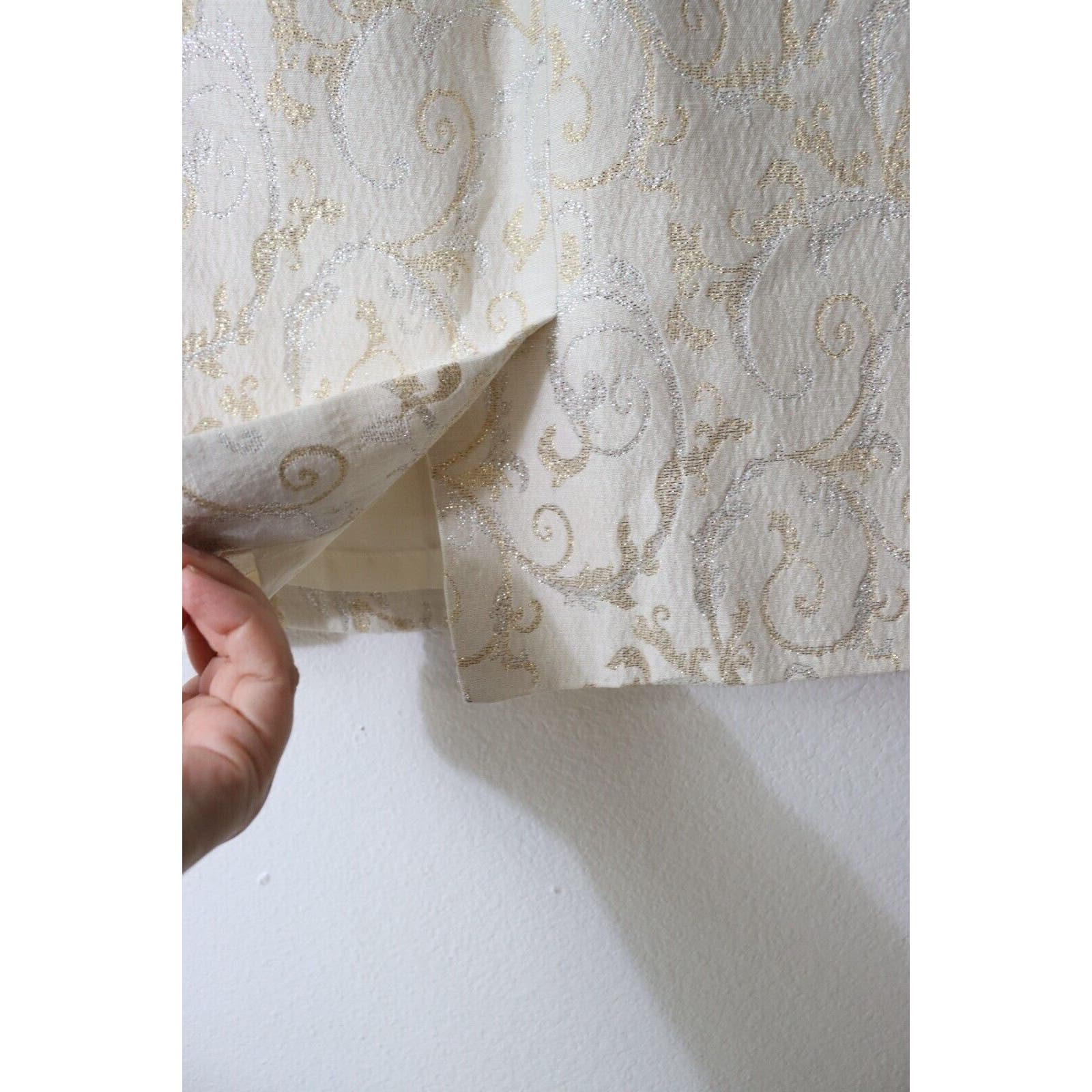 Own the spotlight in this stunning white evening set by Teri Jon. The top and skirt set, designed for petites, features a waist size of 23 inches and hip size of 17 inches, with a waist to hem length of 21 inches. The material is made of high-quality polyester and the set is an original piece. Perfect for any special occasion, this vintage set exudes elegance and sophistication. The size is a 2P and the color is a timeless white. Don't miss out on the opportunity to add this beautiful set to your wardrobe.