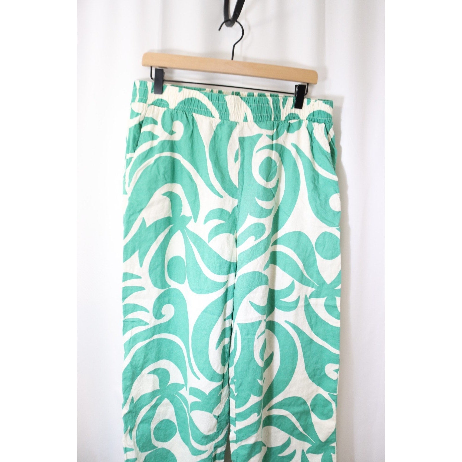 The Ponoma Large Green and White Wide Leg Pant is a relaxed fit, high-rise pant perfect for casual occasions. Made from linen, this ankle-length pant features a flat front and a wide-leg style. With a 24-inch inseam and a regular size L, this pant is ideal for women looking for a stylish and comfortable option for the summer, fall, and spring seasons. The green color adds a pop of freshness to any outfit, making it a versatile piece for any wardrobe.