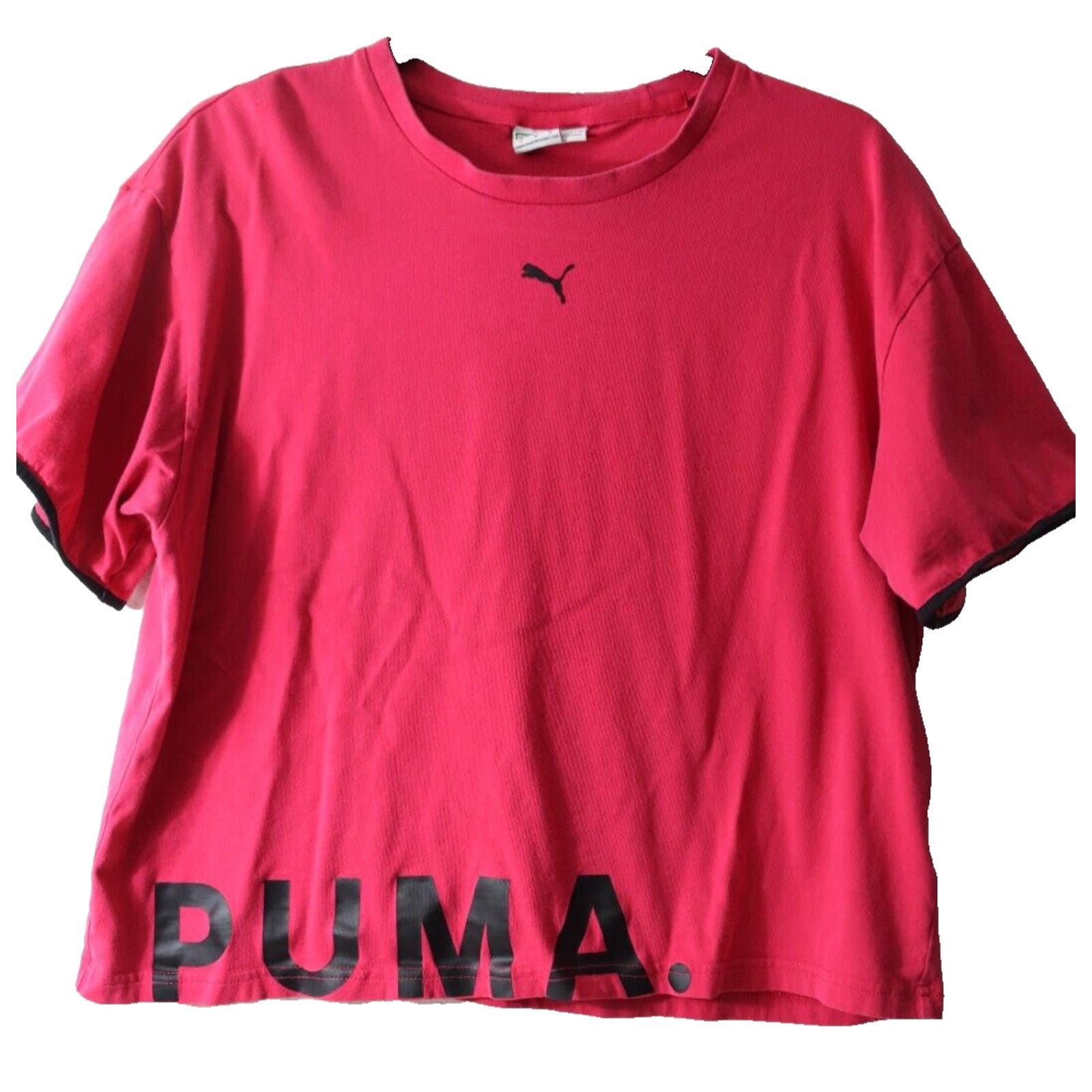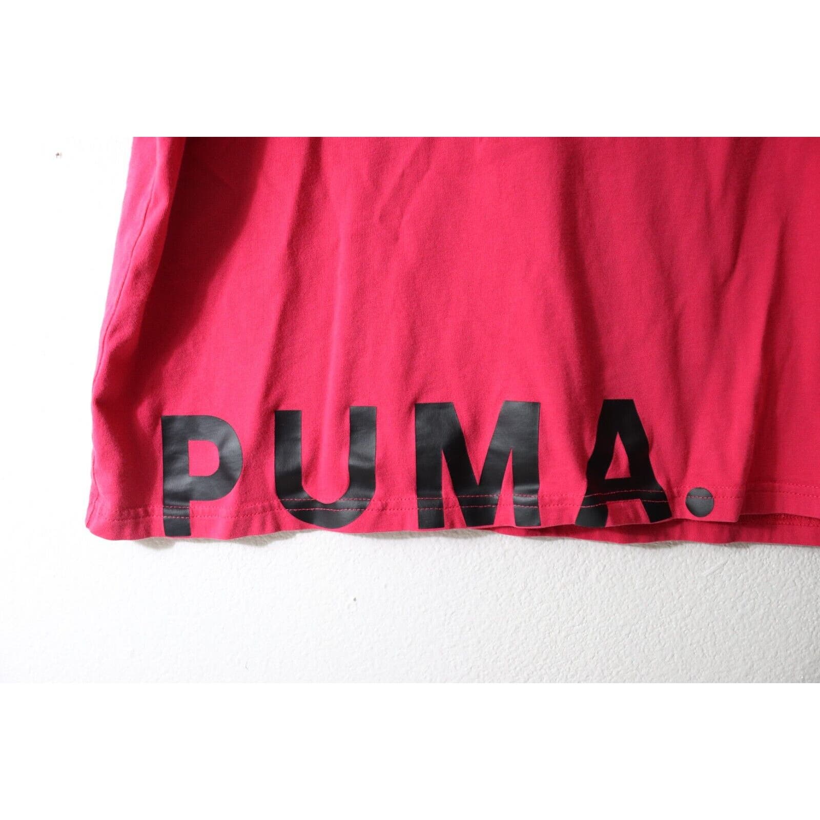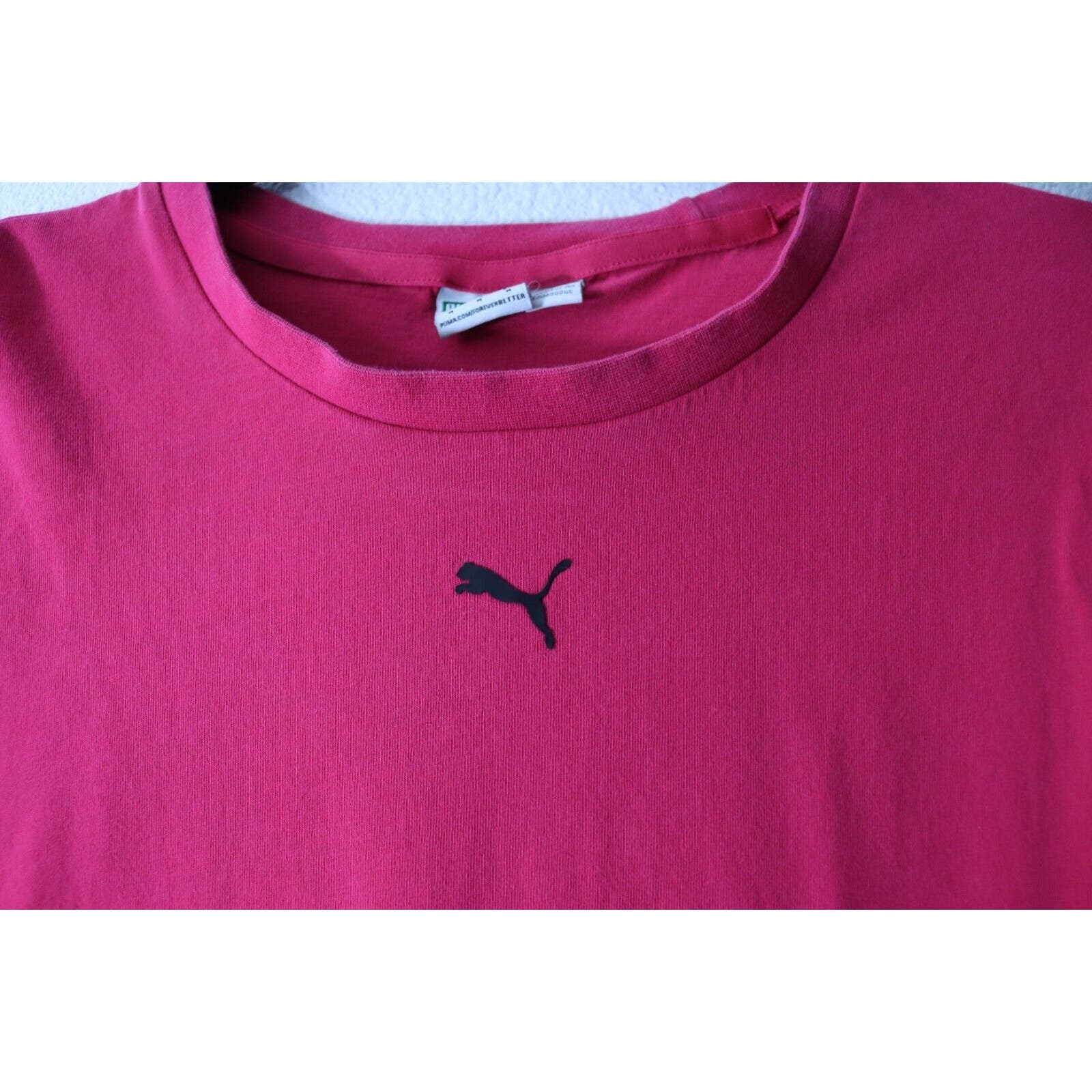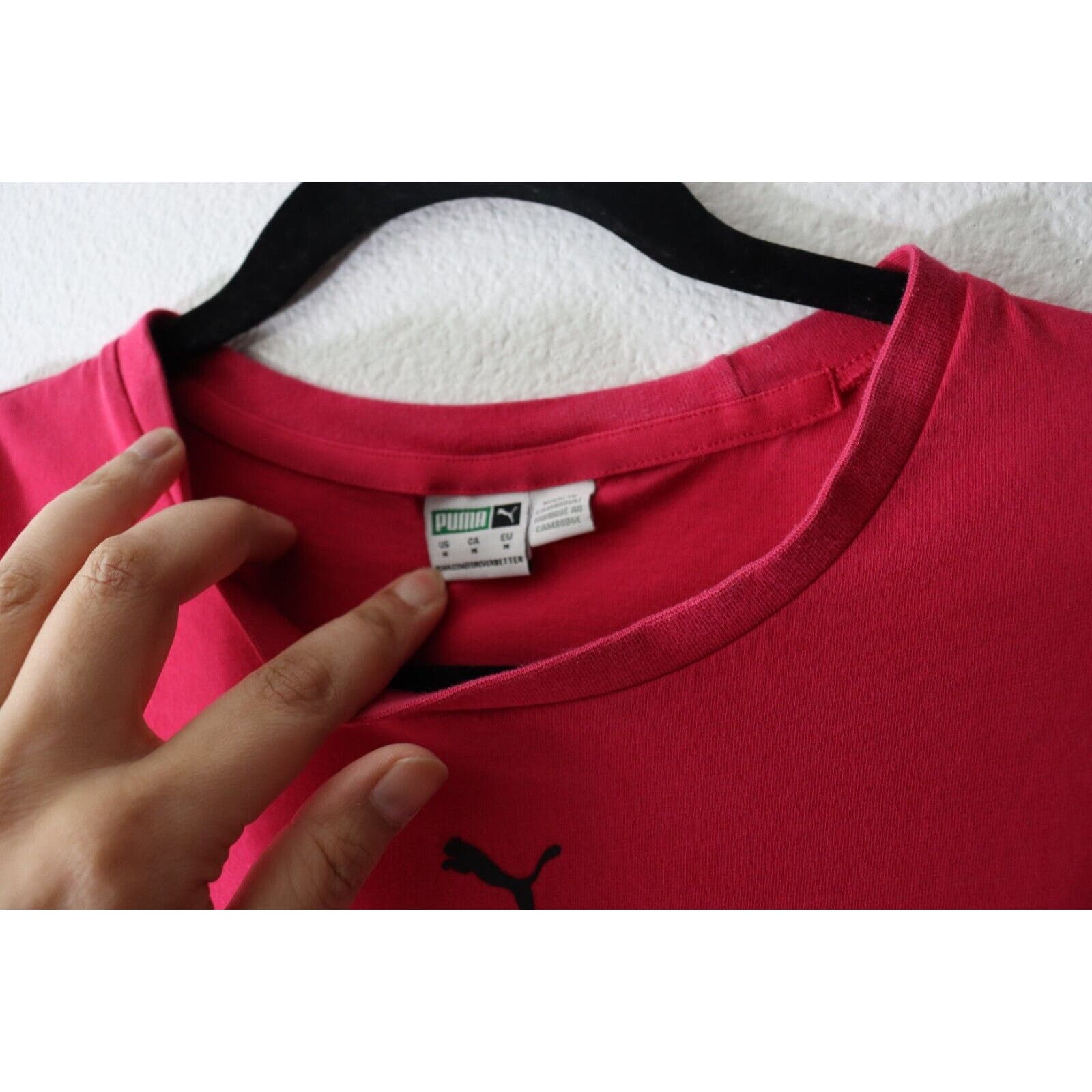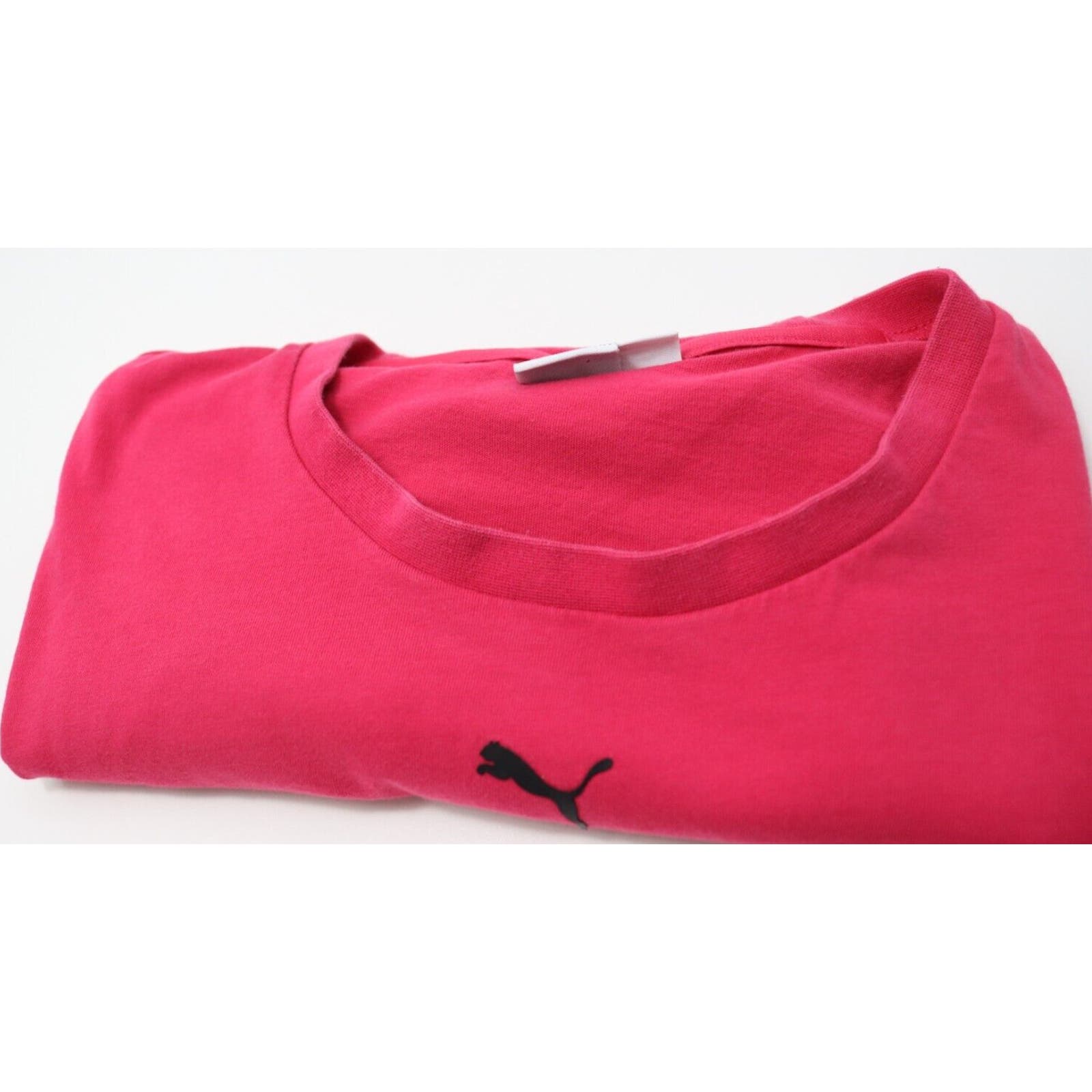 This vibrant pink Puma short sleeve top in size medium is perfect for any activewear occasion. The crew neck and pullover closure provide both comfort and convenience. The logo theme adds a stylish touch. This Puma T-shirt is a great addition to any activewear collection.