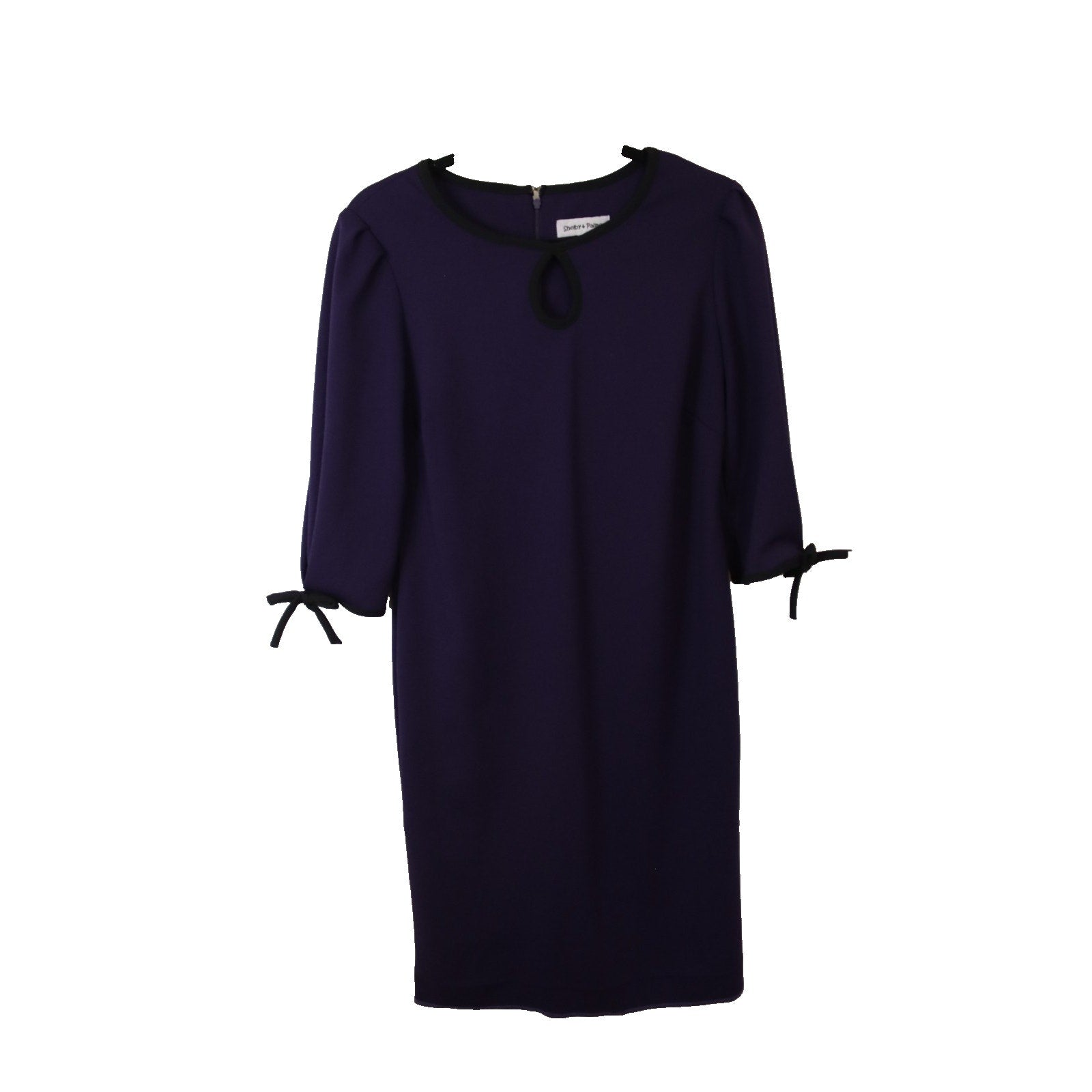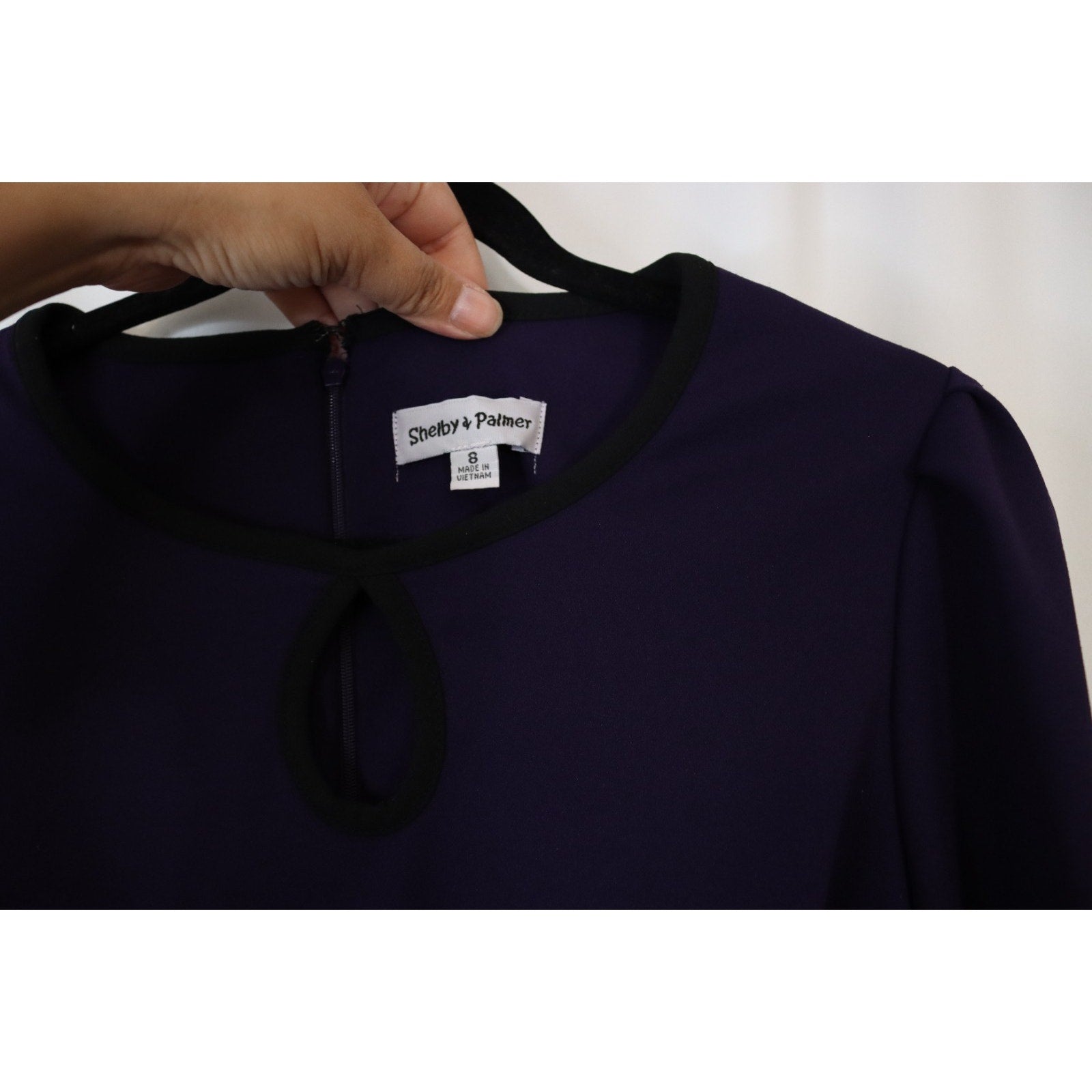 The Shelby & Palmer Midi Sheath 8 in Plum Purple is a stylish and versatile dress perfect for formal and business occasions. This knee-length dress features a round neckline, 3/4 sleeves with string tie detailing, and a flattering keyhole front design. Made from a blend of polyester and spandex, this machine washable dress in a solid purple color offers a sophisticated and chic look. Perfect for any season, this sheath dress is a wardrobe staple for the modern woman.