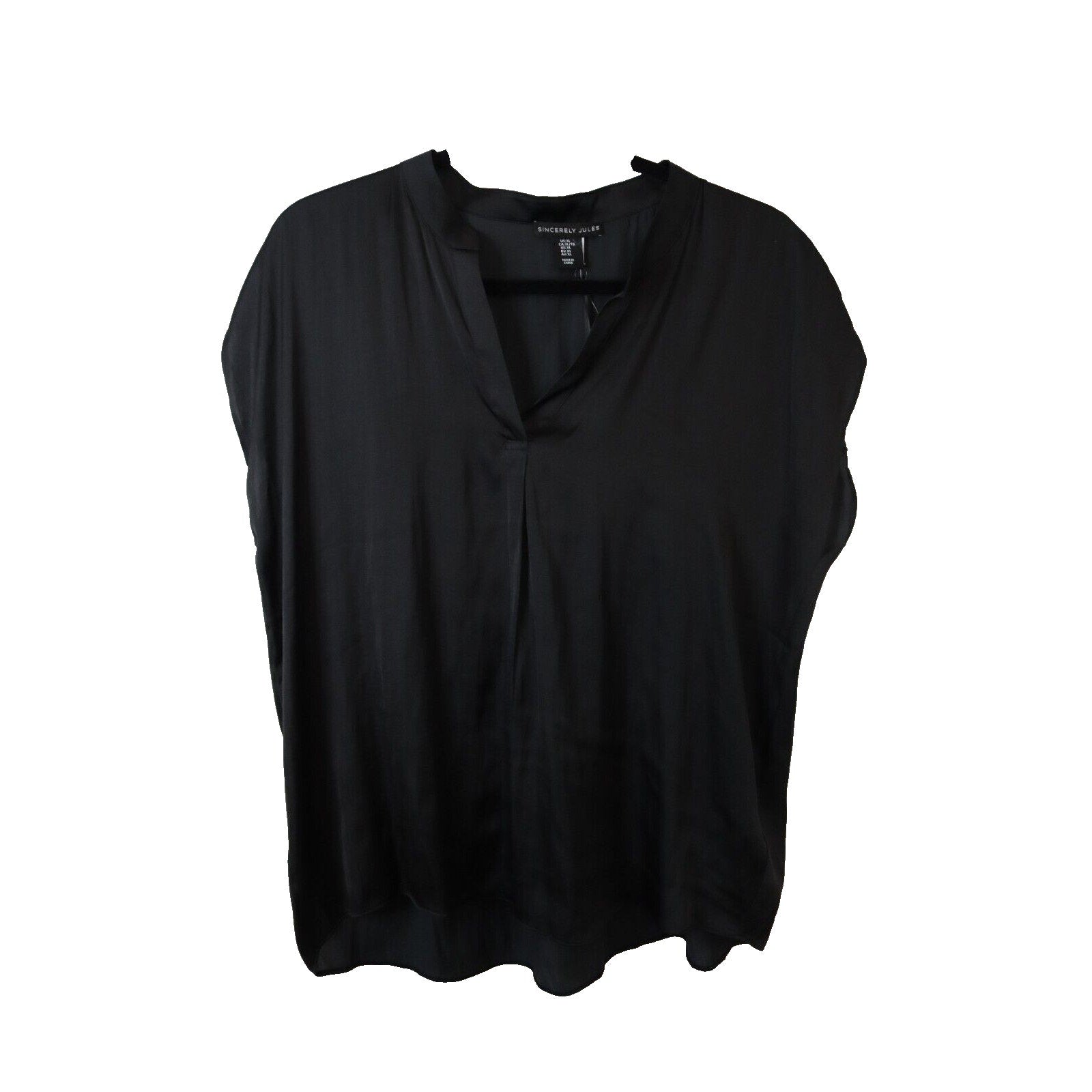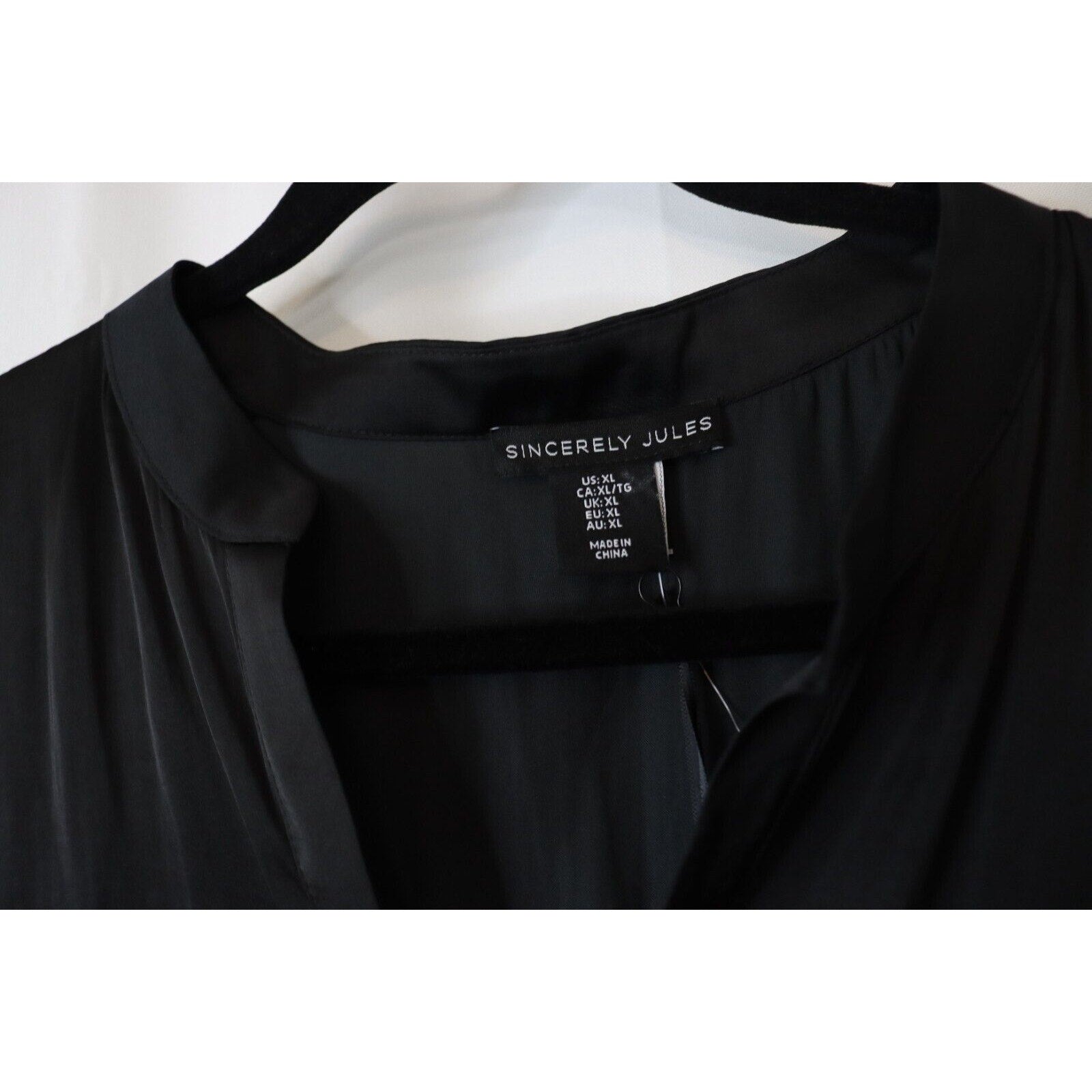 This is a NWT Sincerley Jules black polyester blouse in size XL with a V-neckline. It is a lightweight top suitable for party, casual, or business occasions during the summer and spring seasons. The blouse features a solid pattern and is designed with a classic style for women.