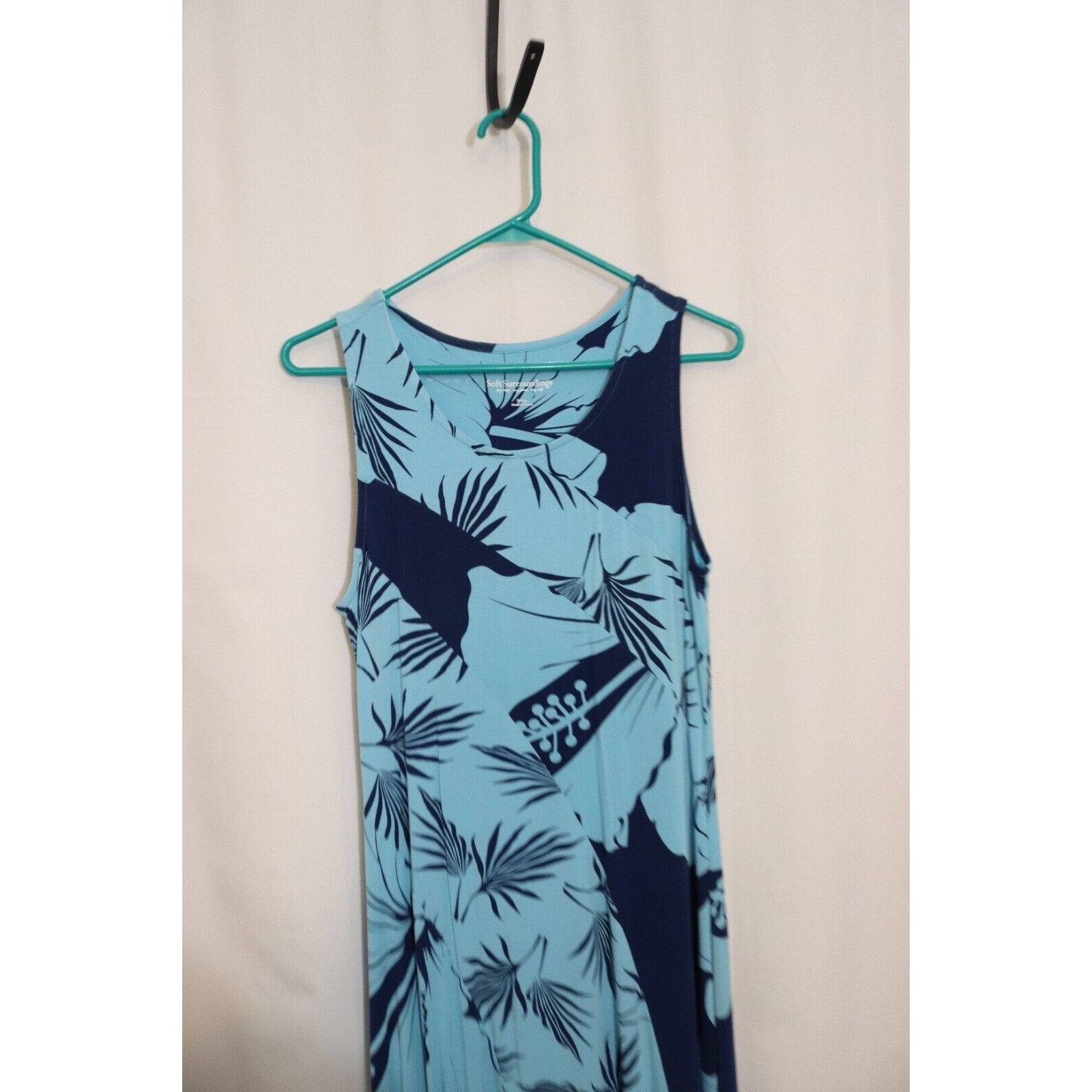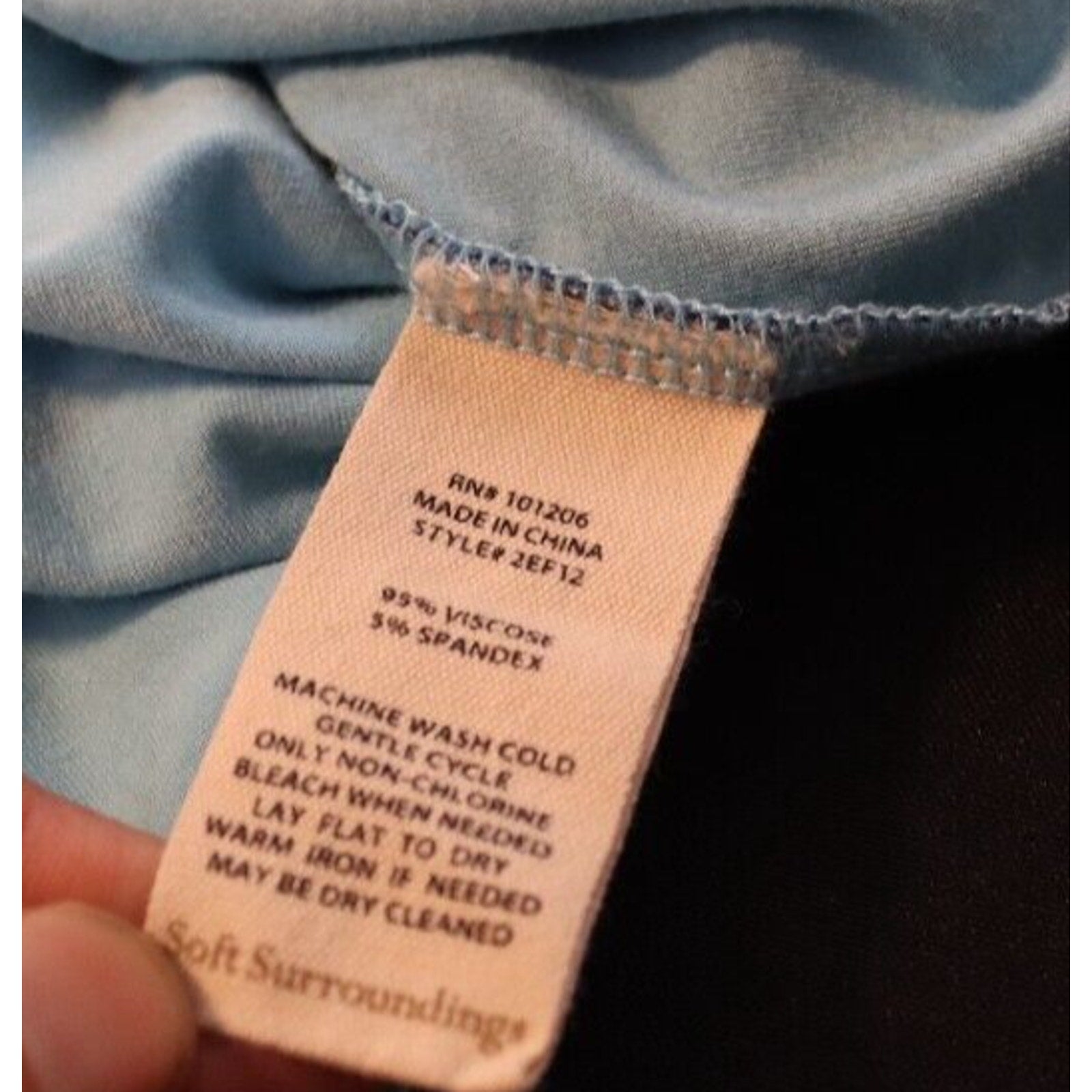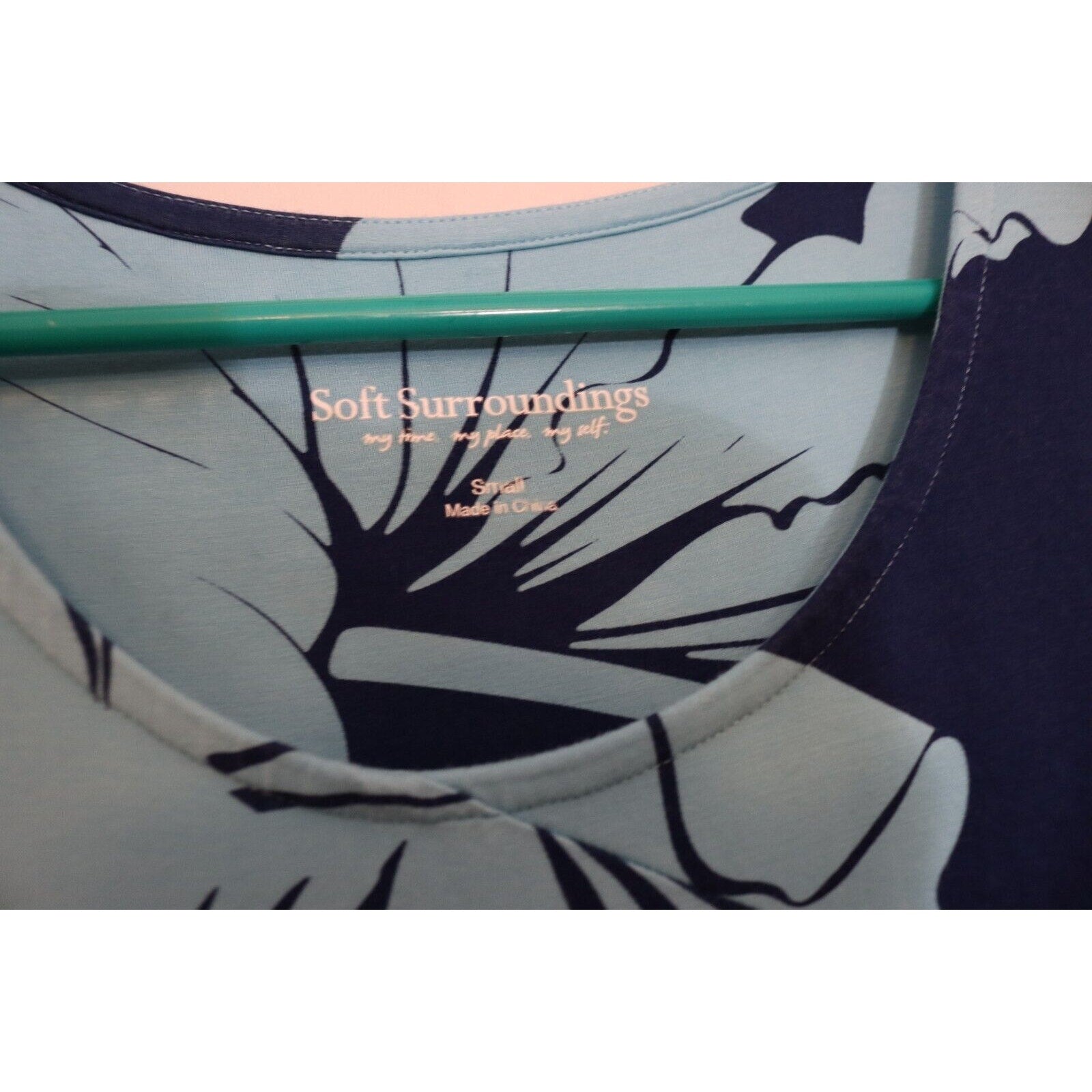 This Soft Surroundings dress is a perfect addition to your wardrobe. The shift style and knee-length hemline make it suitable for both travel and casual occasions. The dress features a beautiful floral pattern in blue and navy, which adds a touch of elegance to your outfit. The dress is made of a comfortable blend of spandex and viscose, making it soft to the touch and easy to wear. It comes in a size small and has a pullover closure.