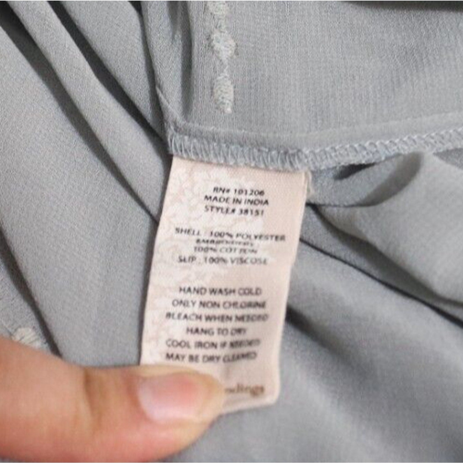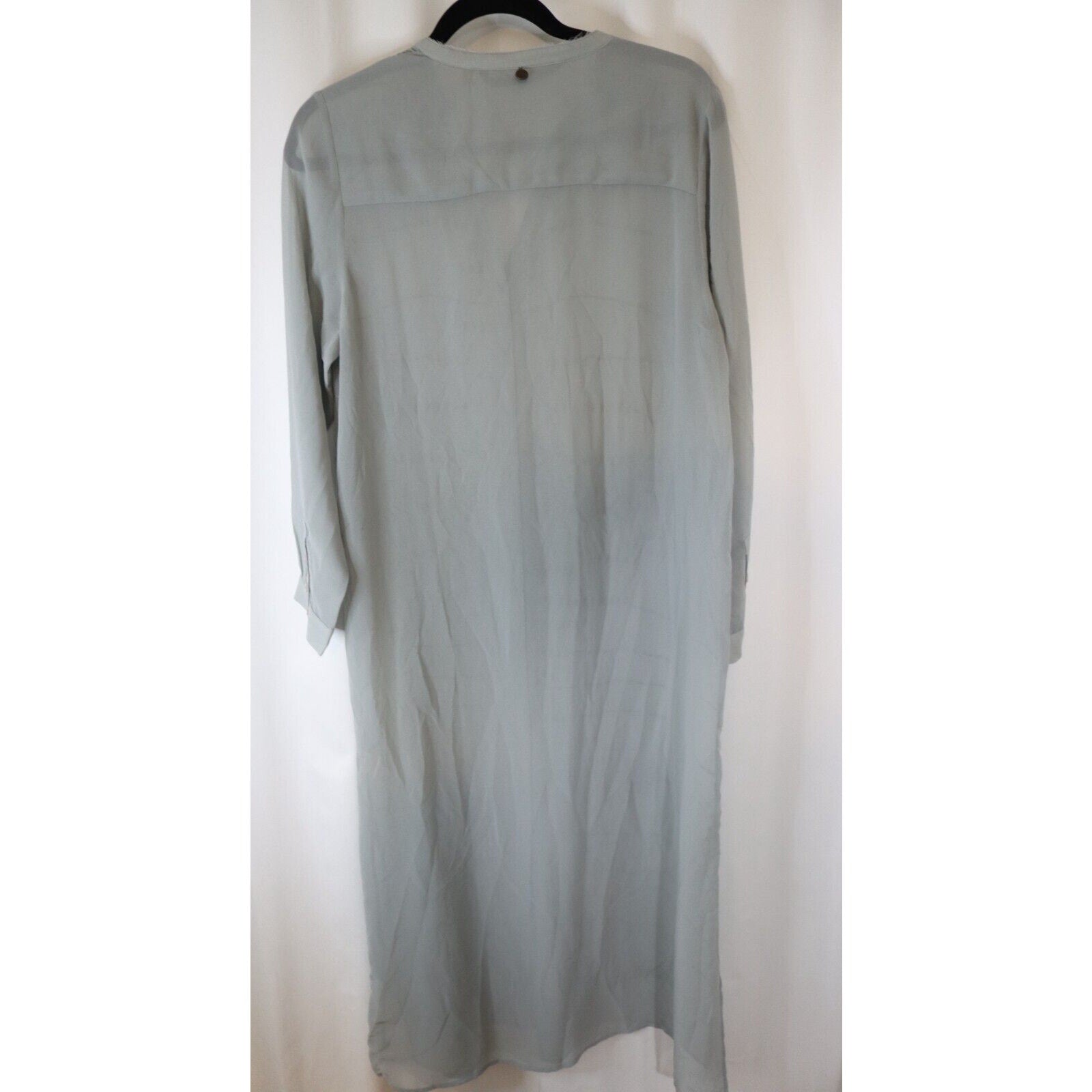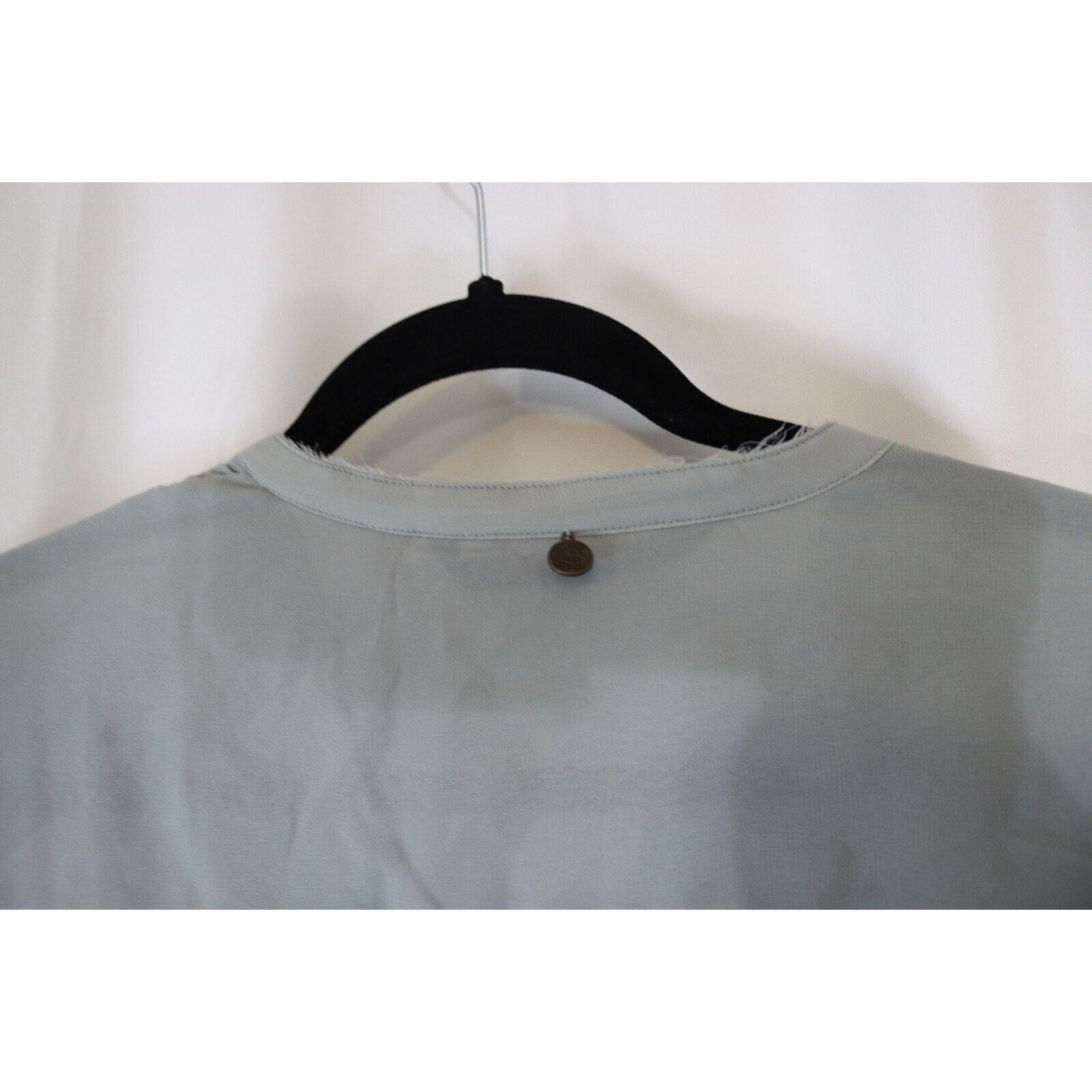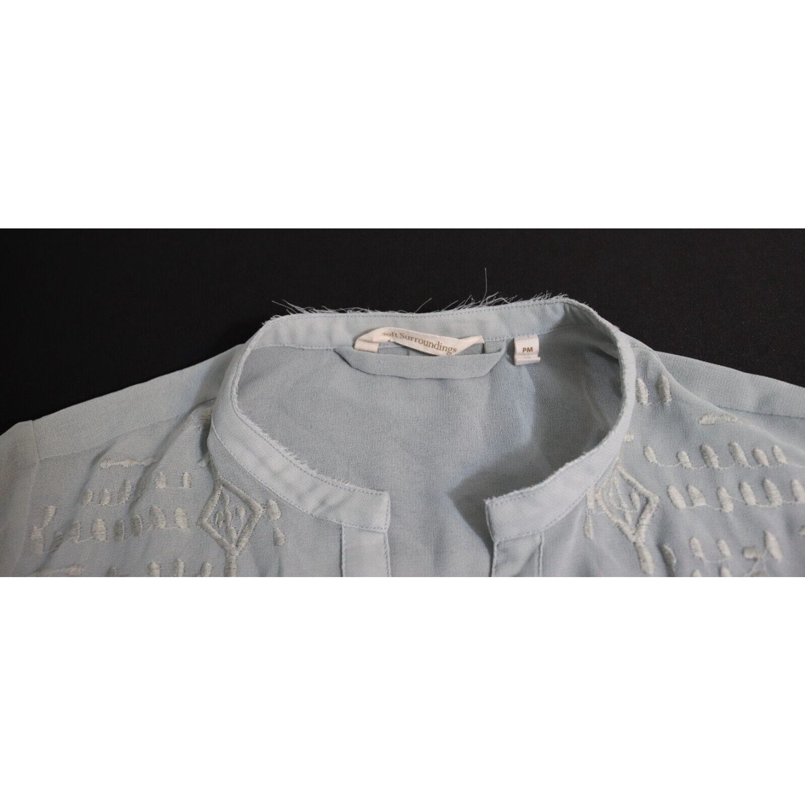 This is a Soft Surrounding Petite Medium button-up sheer top with a long sleeve. It is in a blue/grey color and features embroidered accents. The tunic style top has a slit and is lightweight, making it ideal for summer and spring.
