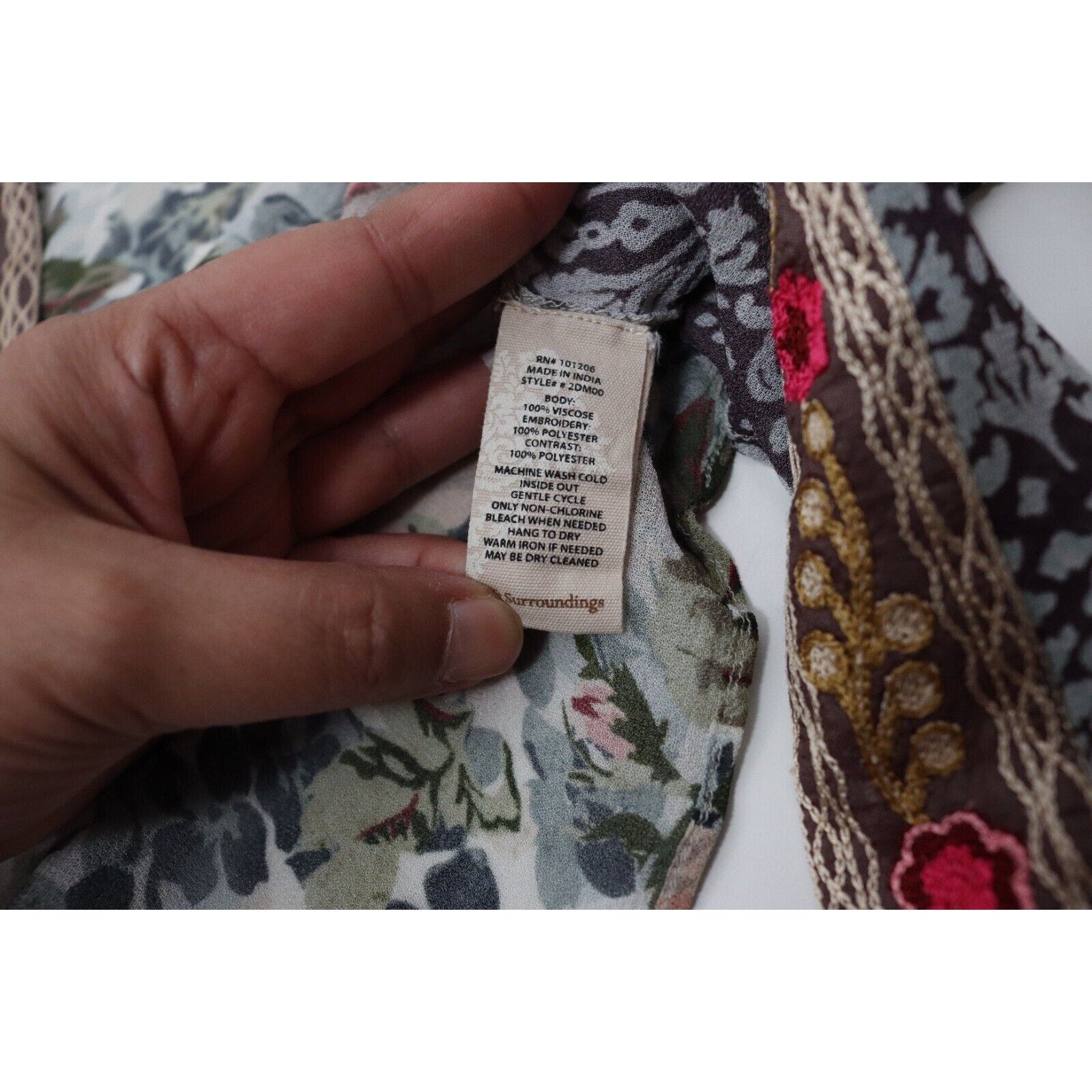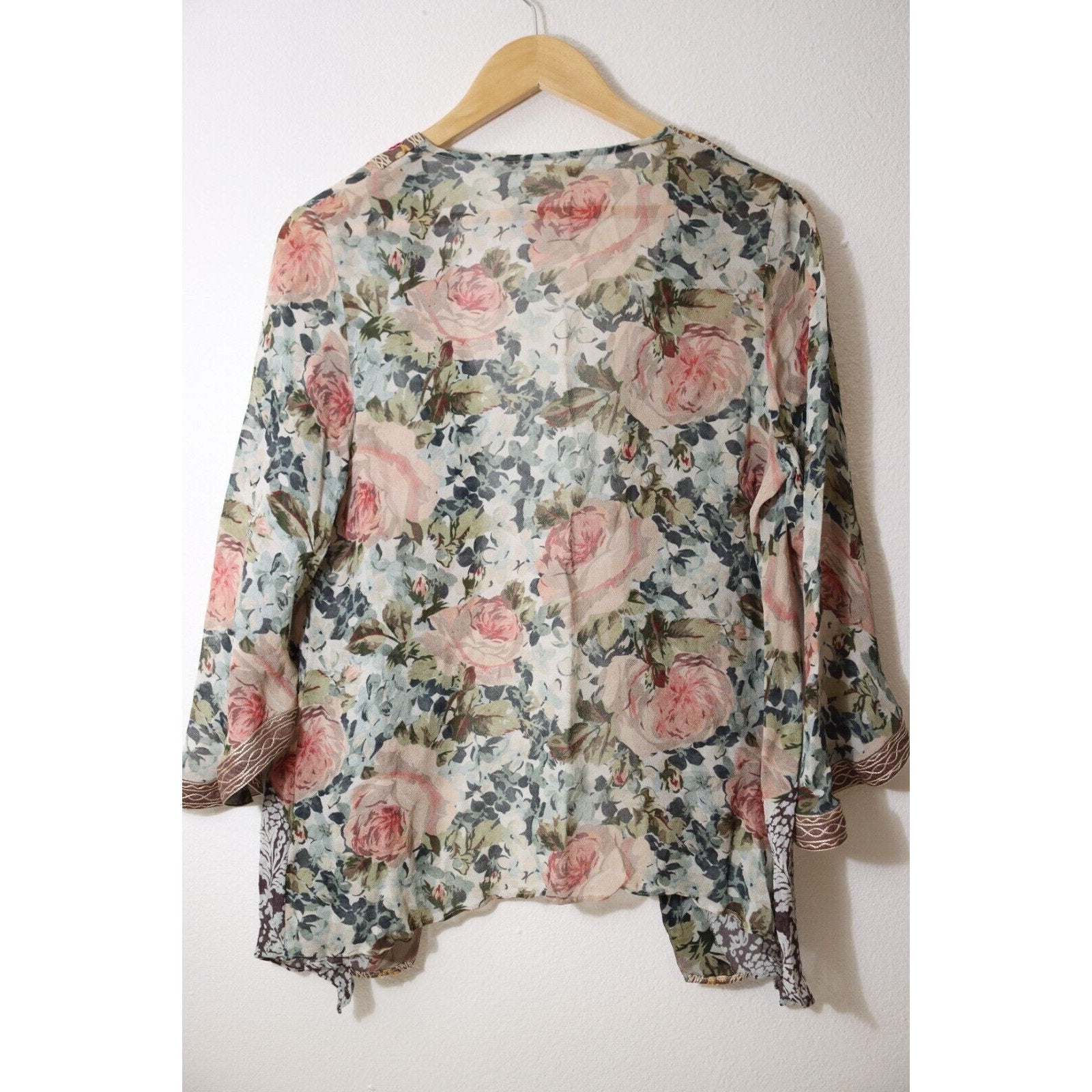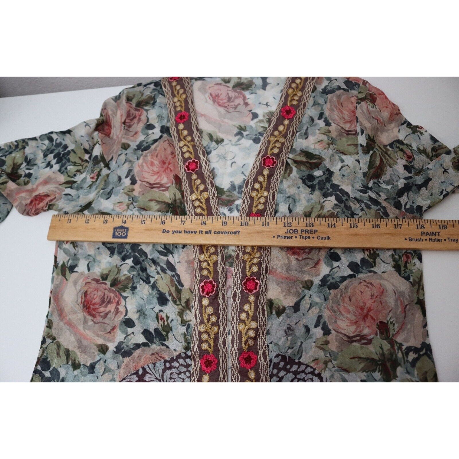 This Soft Surroundings cardigan is a colorful and bohemian addition to any wardrobe. The floral pattern, 3/4 sleeves, and open style make it perfect for layering over any outfit. The material is a blend of polyester and viscose, ensuring a comfortable and durable fit. This sweater is available in size medium and is suitable for regular sized women. The cardigan is not vintage and is made by the Soft Surroundings brand.